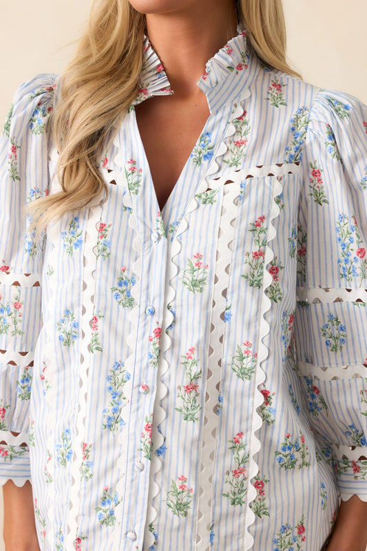 For Keeps Light Blue Stripe Floral Cotton Button Front Top