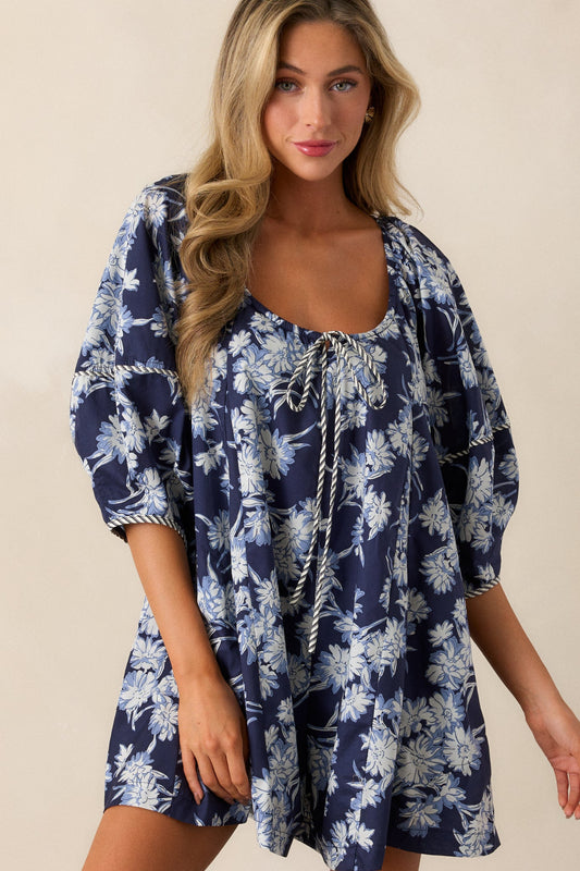 Coastal Vista 100% Cotton Navy Toile Mini Dress
