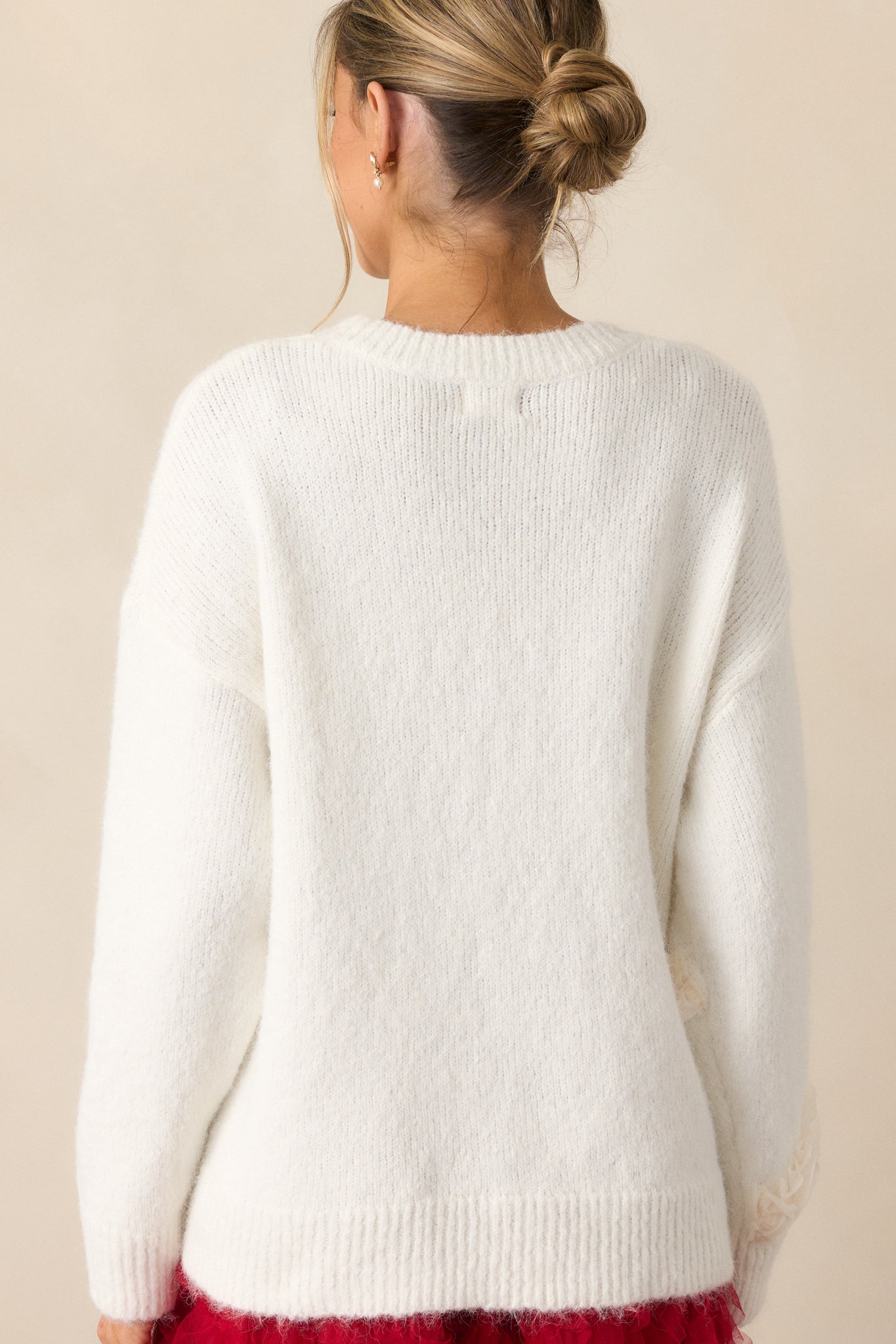 Indulge in luxurious comfort and feminine charm with our A Love So True Ivory Knit Sweater. The ruffle bow detailing, adorned with delicate pearls, adds a touch of elegance and romance to this cozy knit sweater. Feel sophisticated and stylish while staying warm and cozy in this must-have piece. This ivory sweater features a rounded crew neckline, a large ruffle bow detail with ivory faux pearls scattered throughout, rib knit hems and long sleeves.