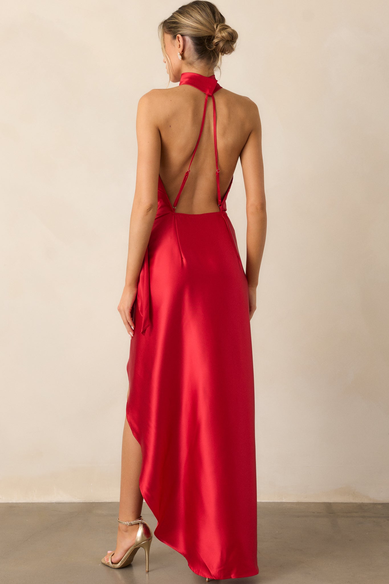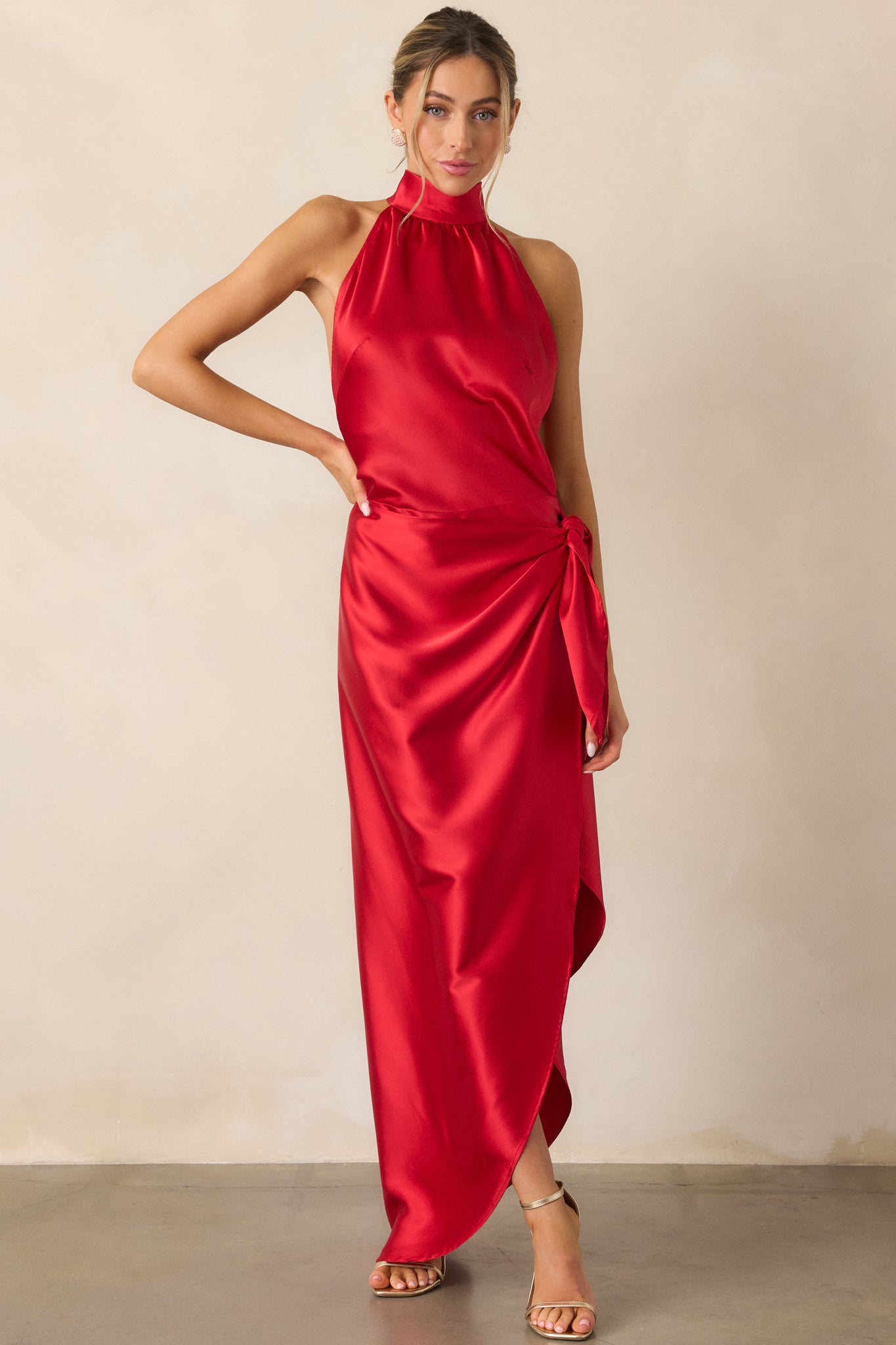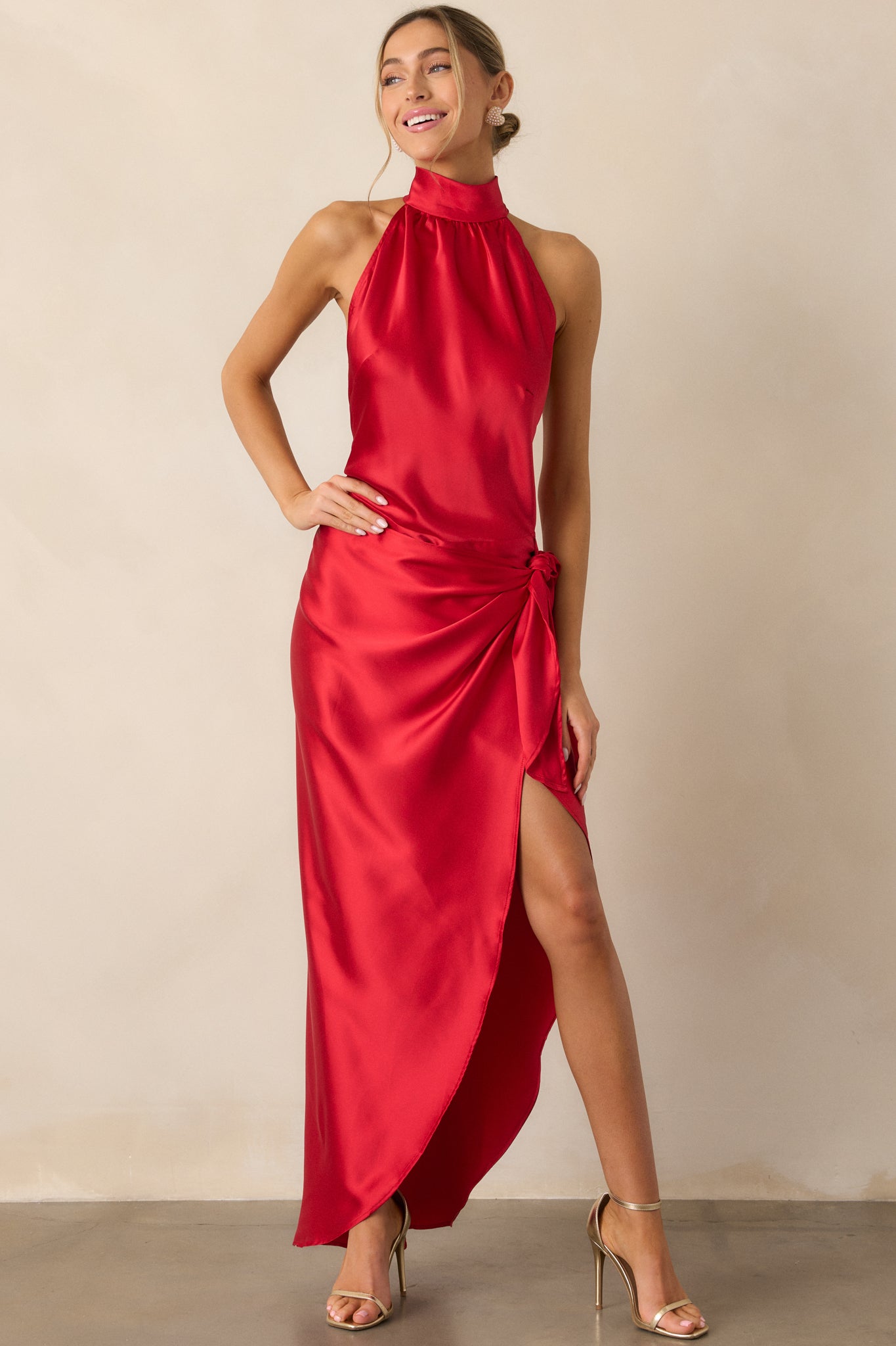 Indulge in a night of elegance and grace with our A Night Out Red Satin Halter Neck Maxi Dress. The flowy fabric will enhance your every move, making you feel like a true vision of beauty. You'll captivate the room and leave them breathless. Elevate your style with this must-have dress. This red dress features a halter neckline, self tie wrap skirt with a leg slit, and adjustable straps.