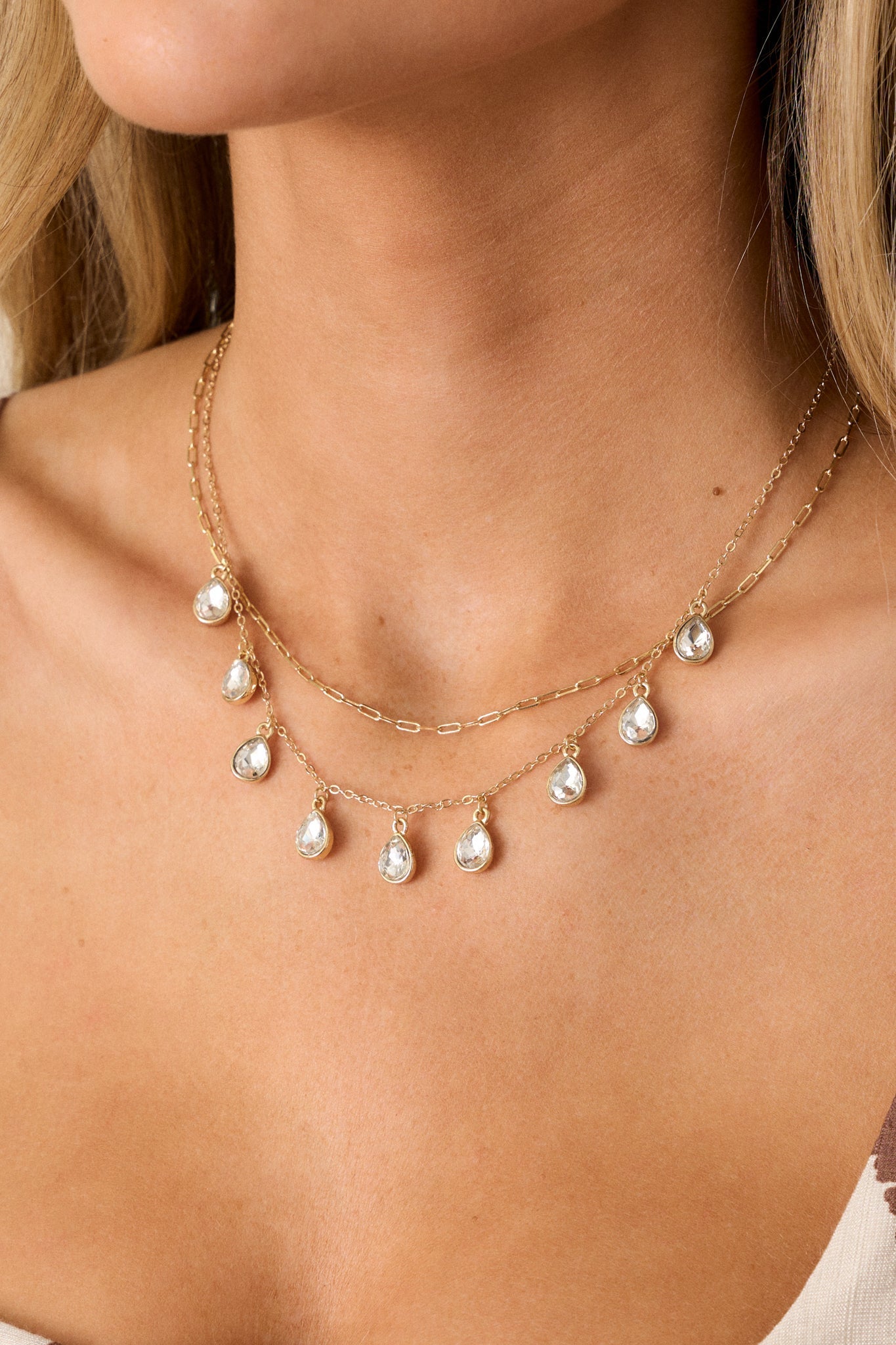 Elevate your style with our A Path To Follow Gold & Rhinestone Layered Necklace. This stunning piece combines the elegance of gold with the shine of rhinestones to create a layered necklace that is sure to turn heads. Perfect for adding a touch of glamour to any outfit. This gold necklace features gold hardware, a layered design, the top necklace features a medium sized dainty gold chain, the second necklace features a thin gold chain decorated with medium sized rhinestone teardrops and a lobster claw clasp.