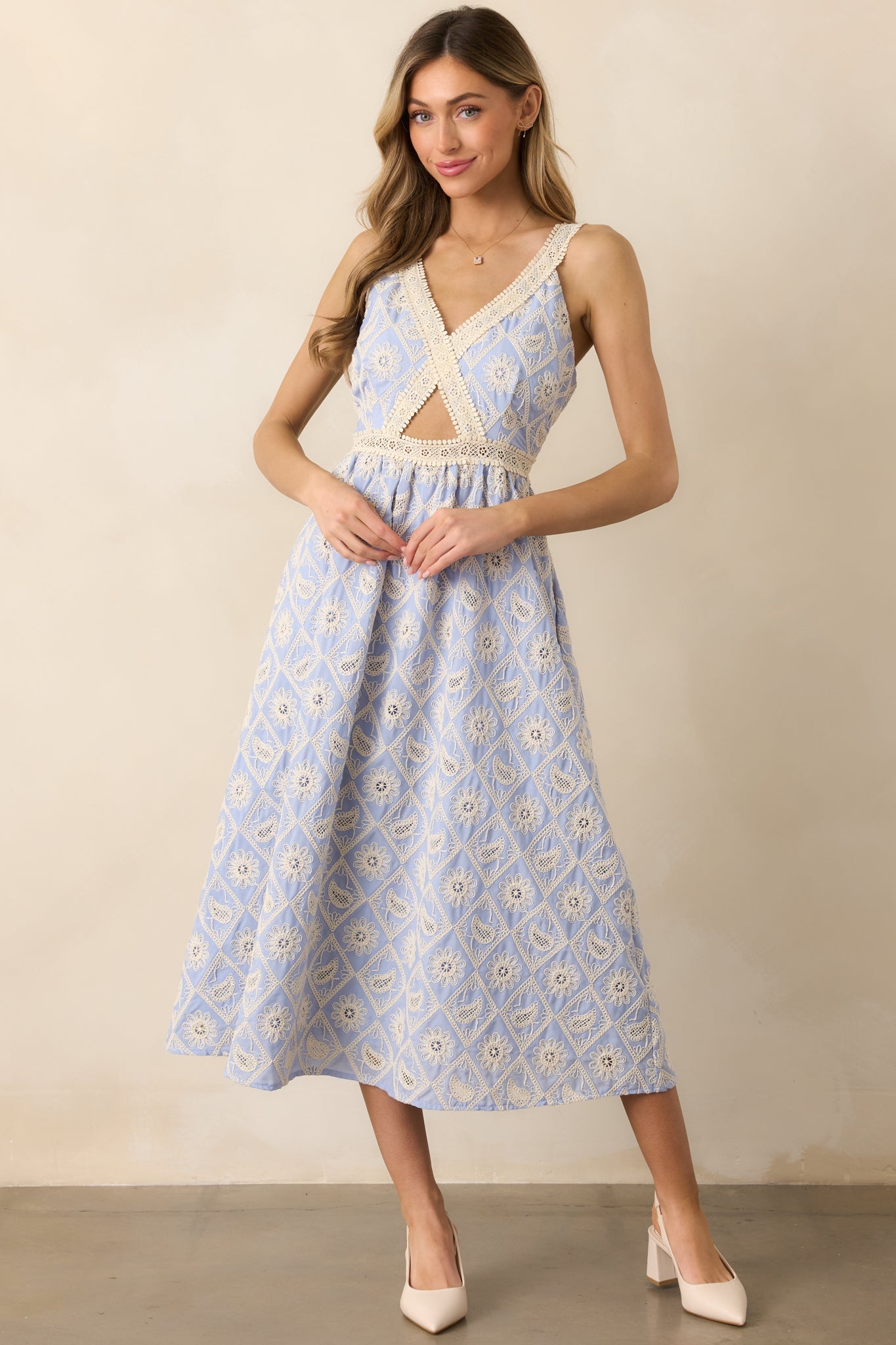 Turn heads in our A Touch Of Grace Periwinkle Embroidered Cutout Midi Dress. Perfect for elegant dinners, rooftop gatherings, or exploring refined venues, this dress exudes sophistication with every step. Its intricate details and graceful design ensure you’ll leave a lasting impression wherever the moment takes you. This periwinkle dress features lace embroidery detailing throughout, a v-neckline, a cutout in the center of the bodice, and adjustable straps.