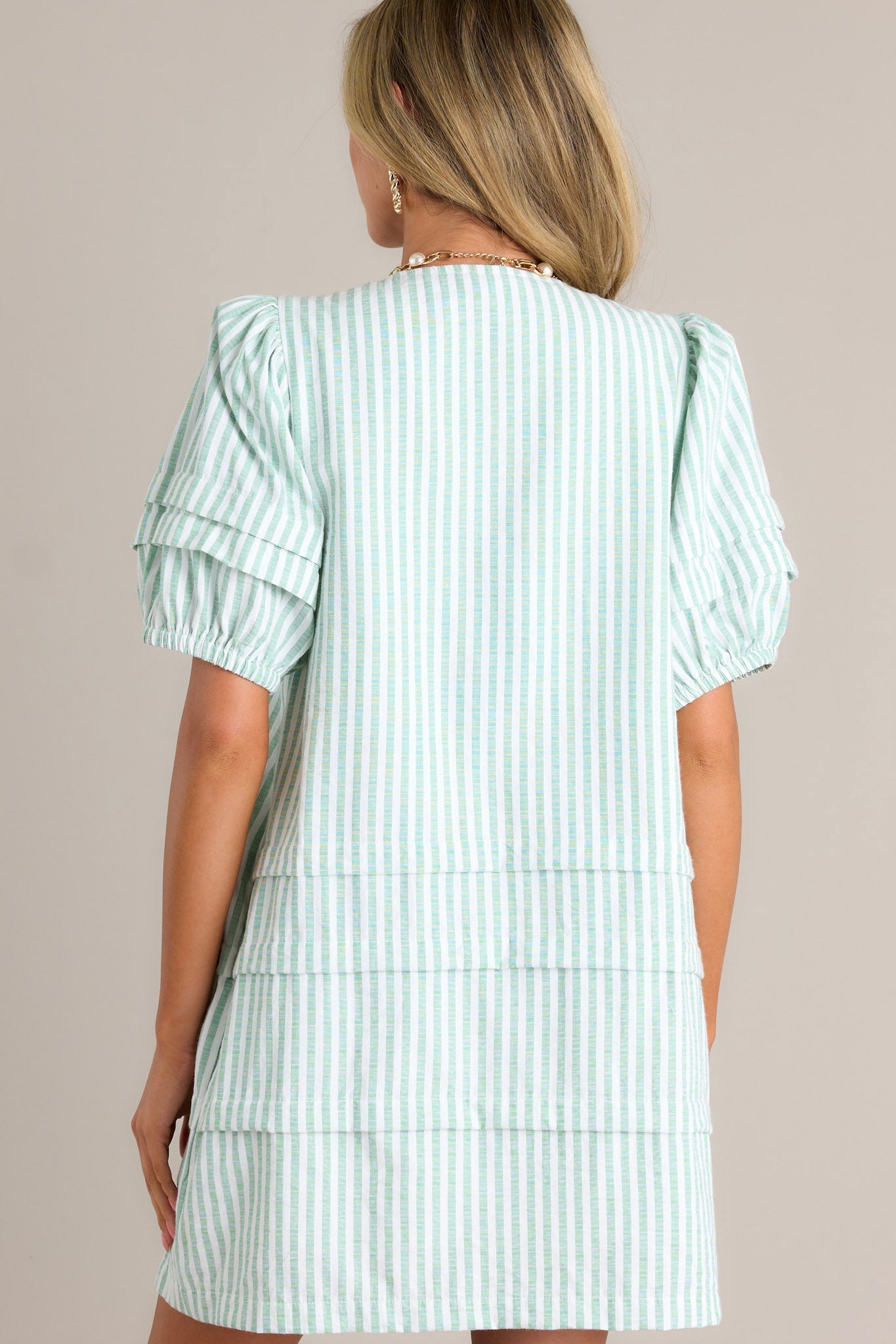 Catch some eyes in our Adore You Mint Green Stripe Puff Sleeve Mini Dress! Designed with fun and stylish puff sleeves, this dress flatters any figure with its mini length and slimming stripes. Perfect for a playful and trendy look, this dress is sure to make you stand out in a crowd. This mint green mini dress features a v-neckline, slight shoulder enhancement, functional buttons, subtle chest pleats, functional hip pockets, a tiered design, and elastic cuffed puff sleeves.