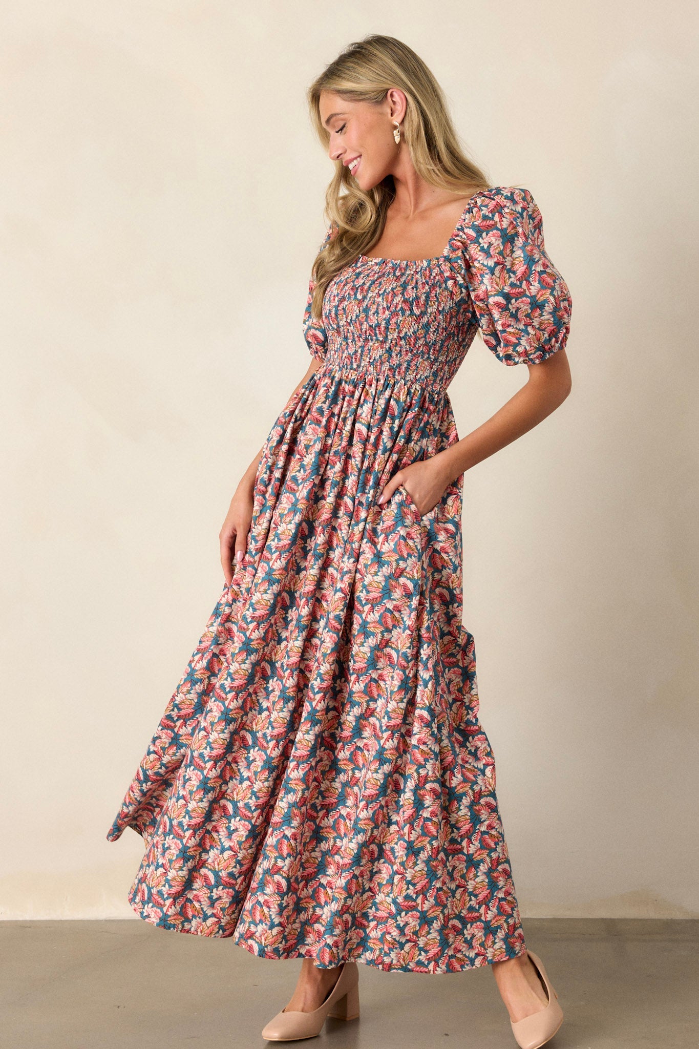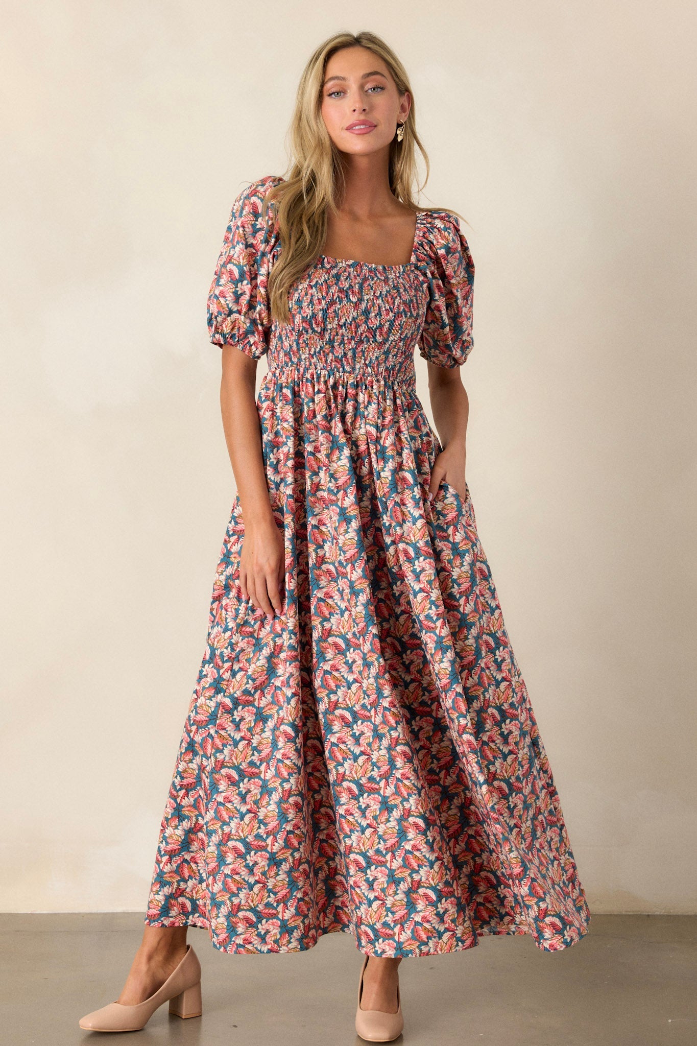 This 100% cotton maxi dress will make your afternoon delightfully comfortable with its airy fabric and stylish teal floral design. Perfect for any casual occasion, it’s the ideal combination of comfort and flair. Stay cool, look great – all with the Afternoon Delight Maxi Dress. This teal floral dress features a square neckline, a smocked bust & waist, functional hip pockets, elastic cuffed puff sleeves and a flowing silhouette.