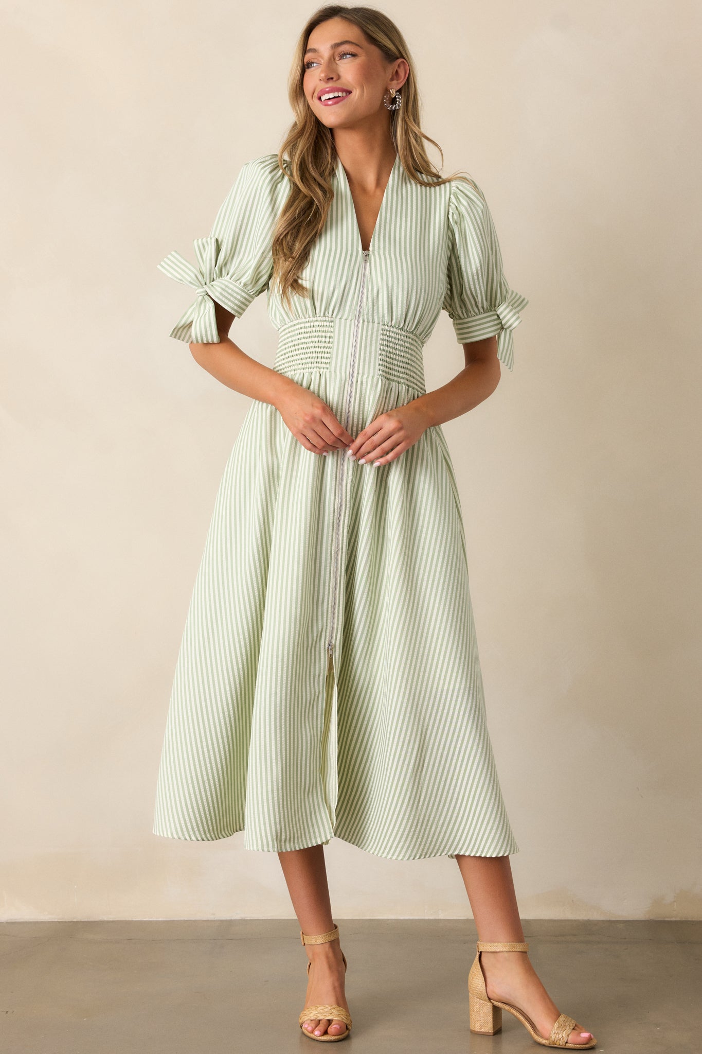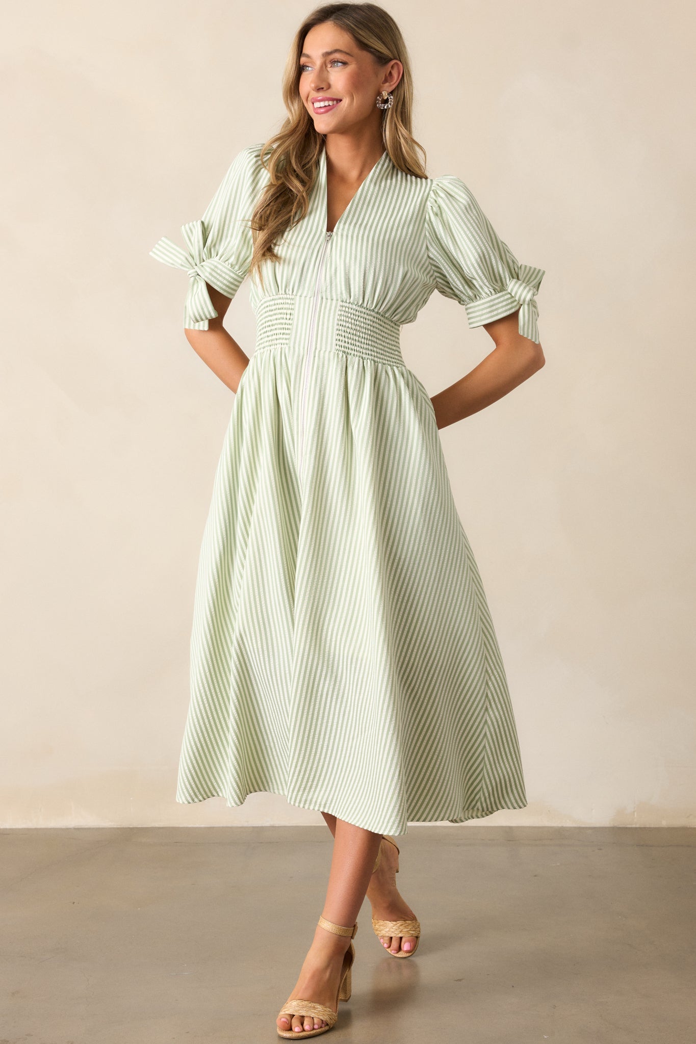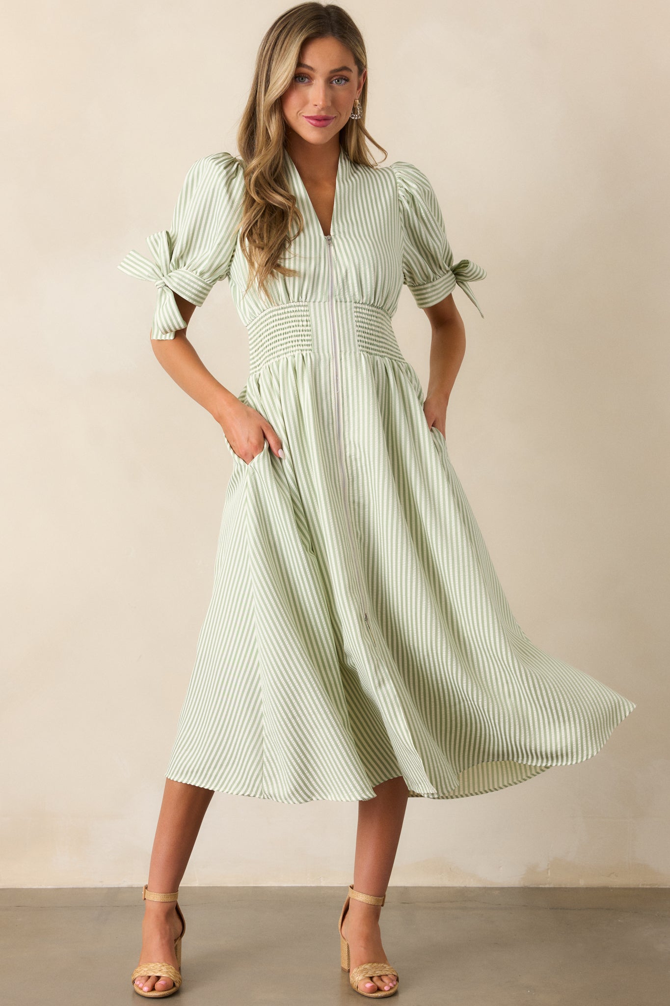 Elevate your wardrobe with our Afternoon Tea Sky Green Stripe Zip Front Midi Dress. Featuring a flattering zip front and soft green stripes, this dress is destined to be a staple in your wardrobe. Perfect for any occasion, you'll feel confident and stylish in this versatile piece. This green stripe dress features a fitted waist with smocking detail, a v-neck neckline that leads into a front zipper, tie details at the bottom of the sleeves, and two functional pockets.