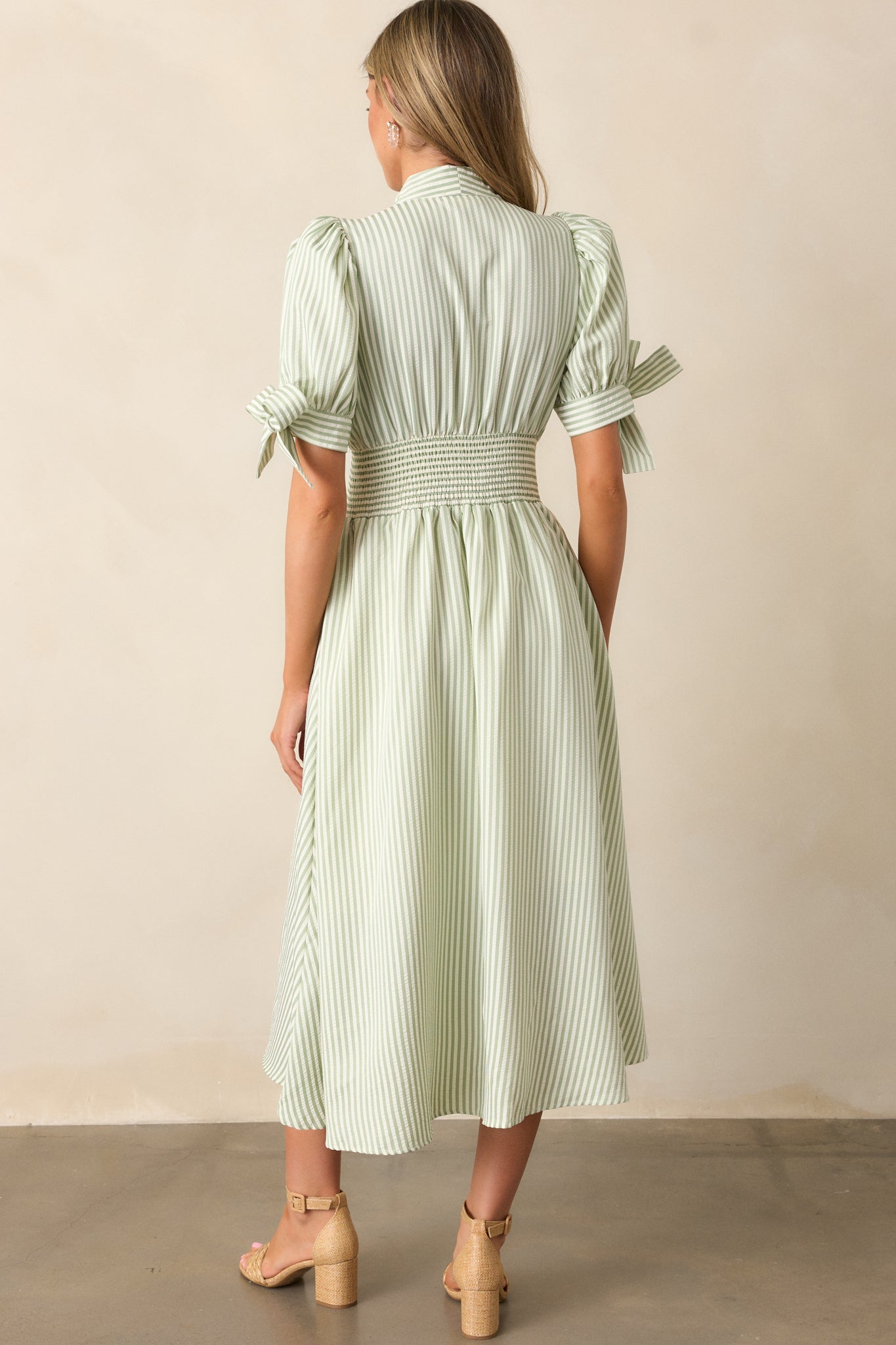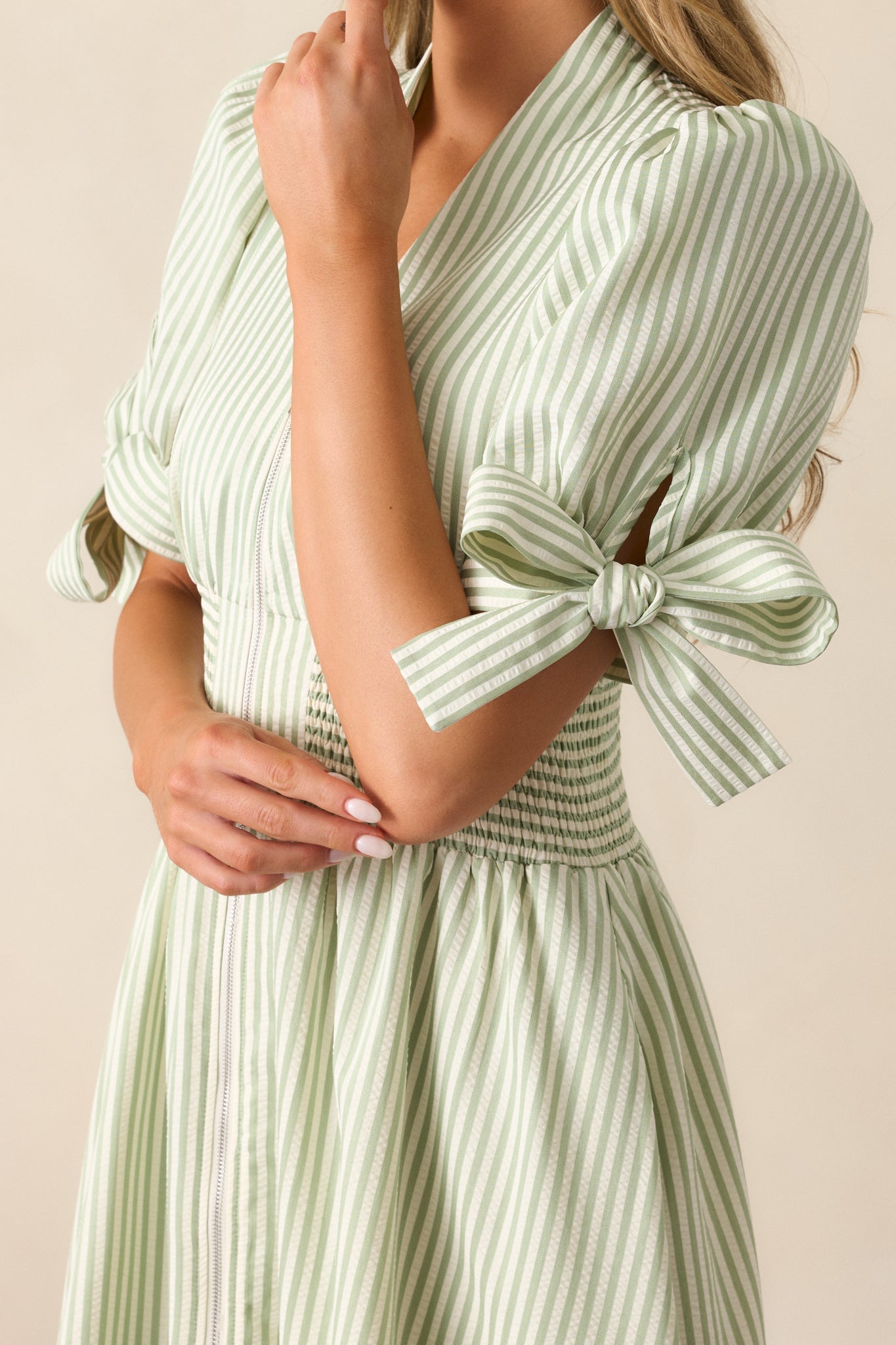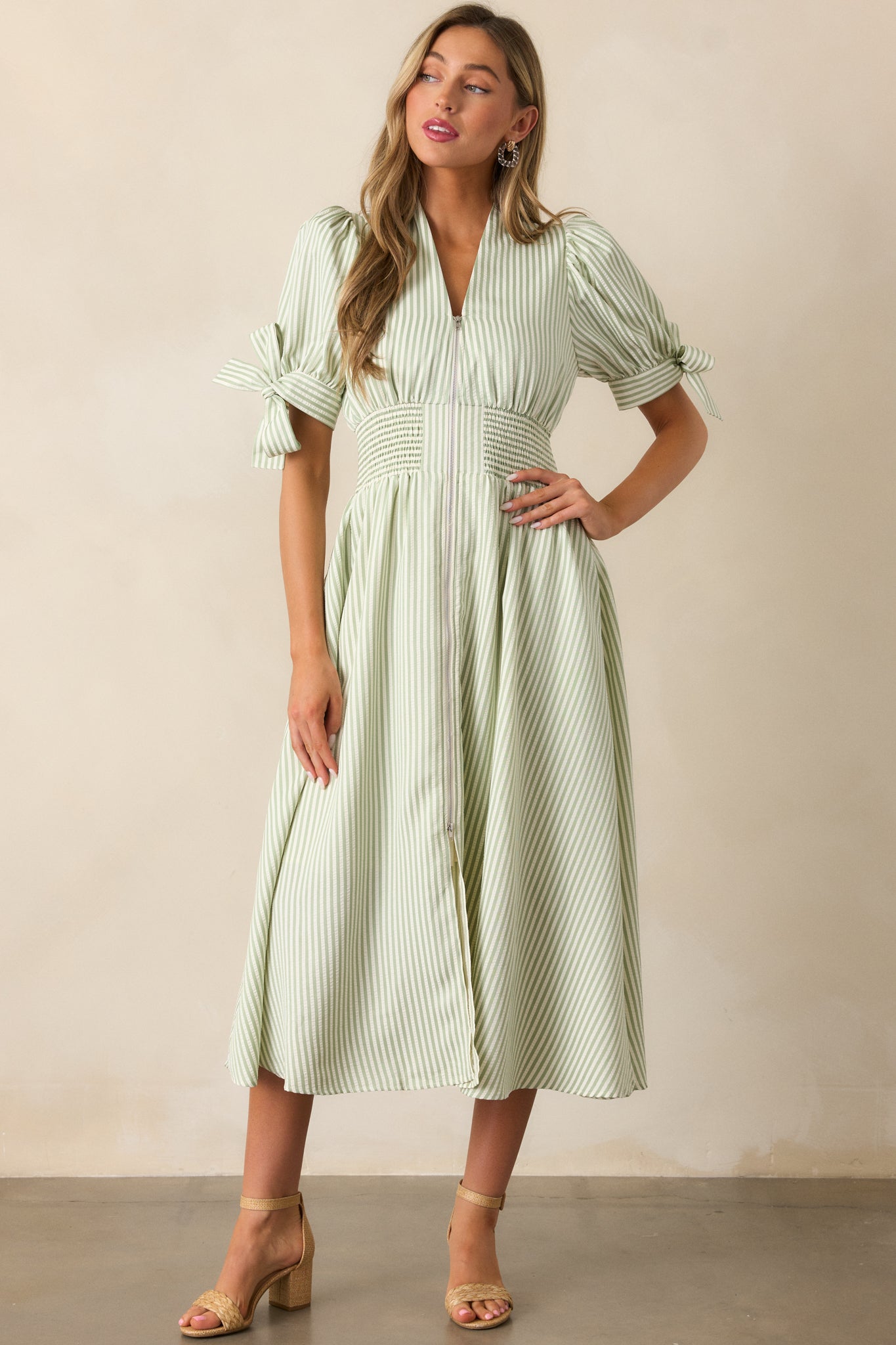 Elevate your wardrobe with our Afternoon Tea Sky Green Stripe Zip Front Midi Dress. Featuring a flattering zip front and soft green stripes, this dress is destined to be a staple in your wardrobe. Perfect for any occasion, you'll feel confident and stylish in this versatile piece. This green stripe dress features a fitted waist with smocking detail, a v-neck neckline that leads into a front zipper, tie details at the bottom of the sleeves, and two functional pockets.