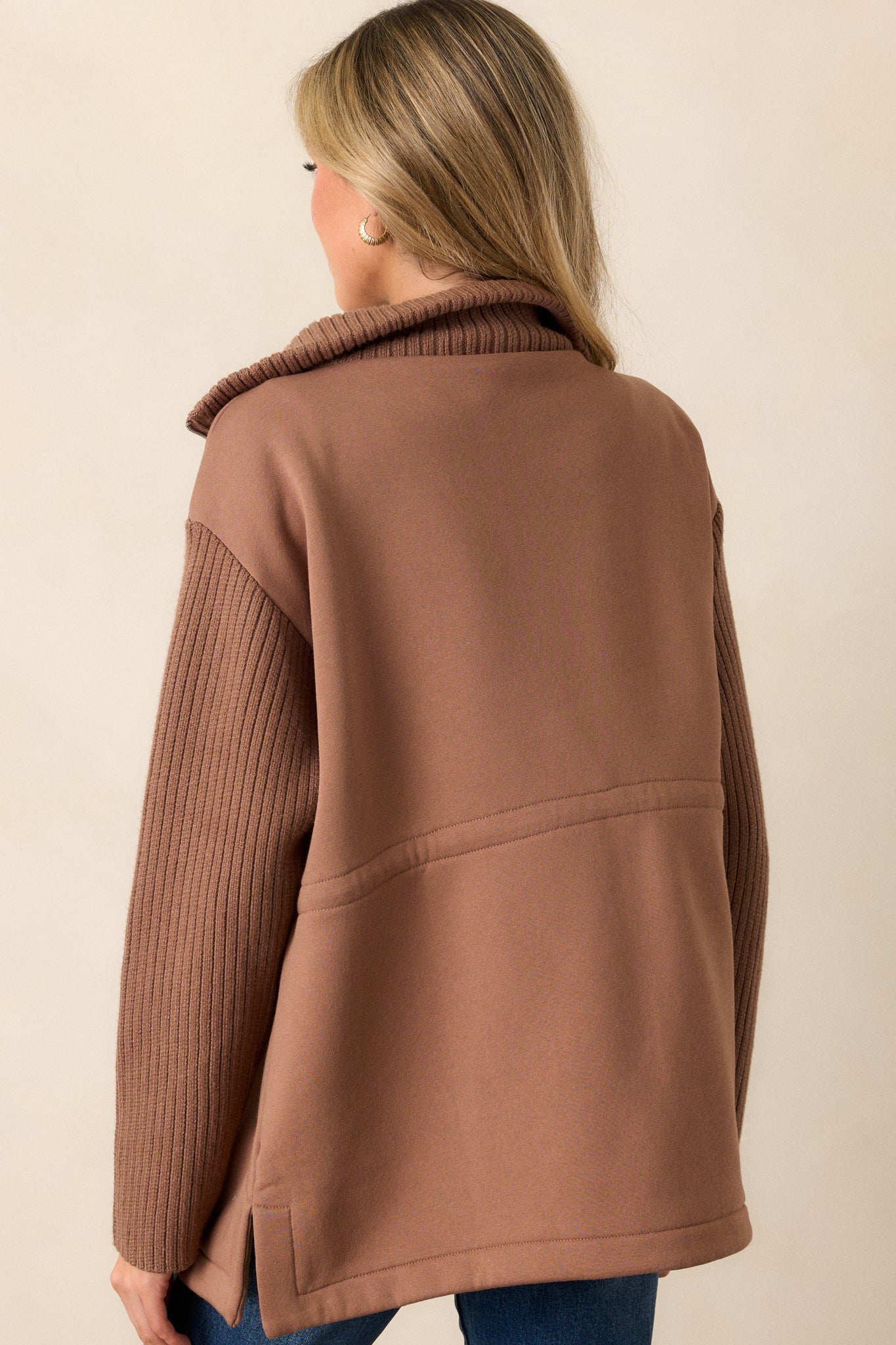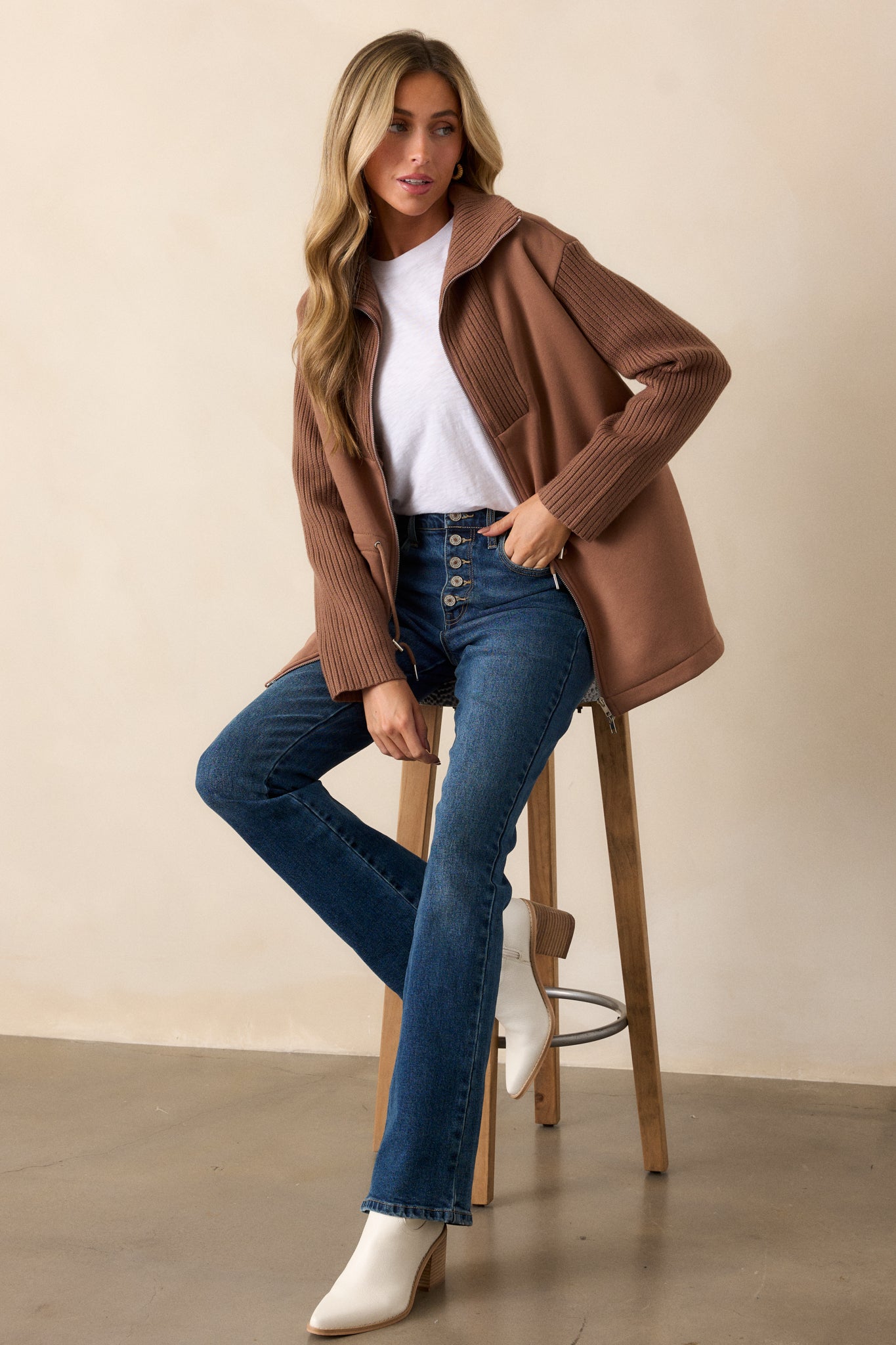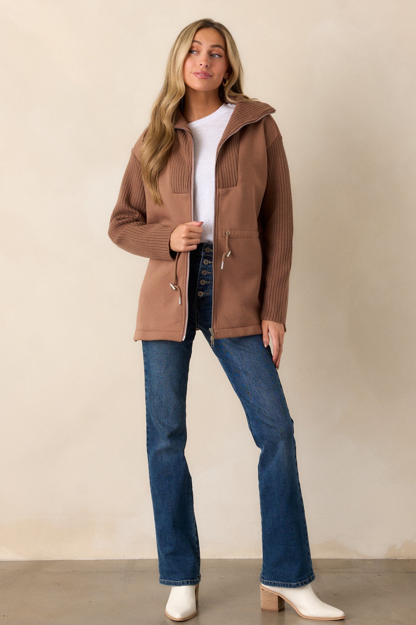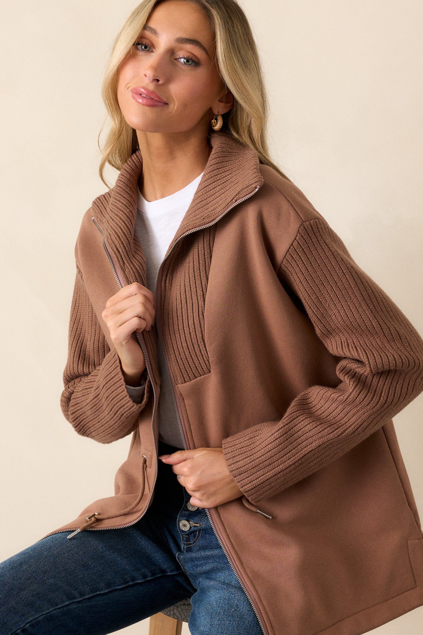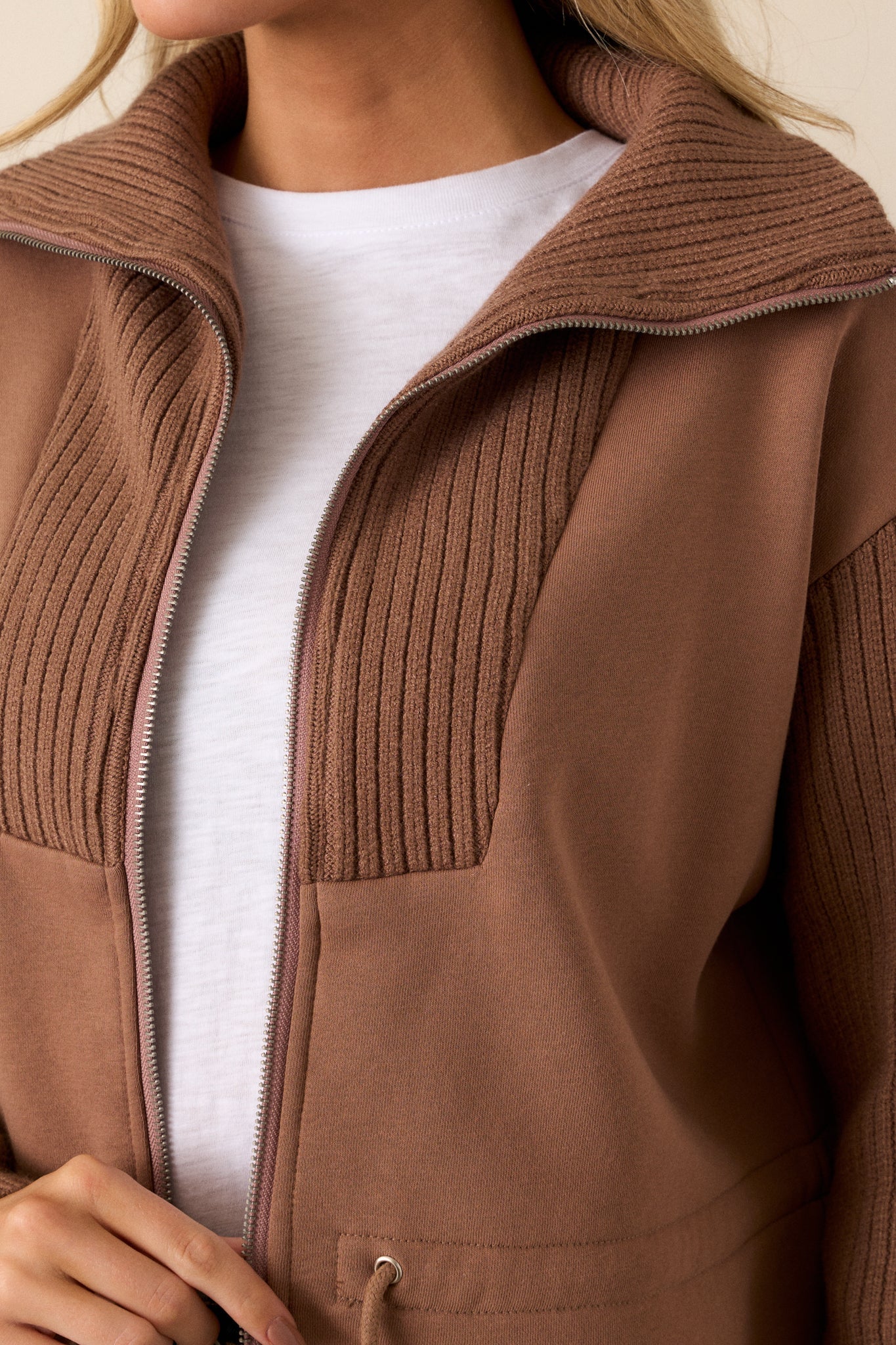 Indulge in the ultimate comfort with our Alabaster Dreams Brown Contrast Knit Jacket. Made from soft, high-quality fabric, this jacket will keep you cozy and stylish all day long. Its neutral color allows for versatile wear, making it a must-have in your wardrobe. Elevate your loungewear now! This brown jacket features contrasting fabrics, a knit high neck, a front zipper, drawstring cinch waistband with silver accents and long knit sleeves.