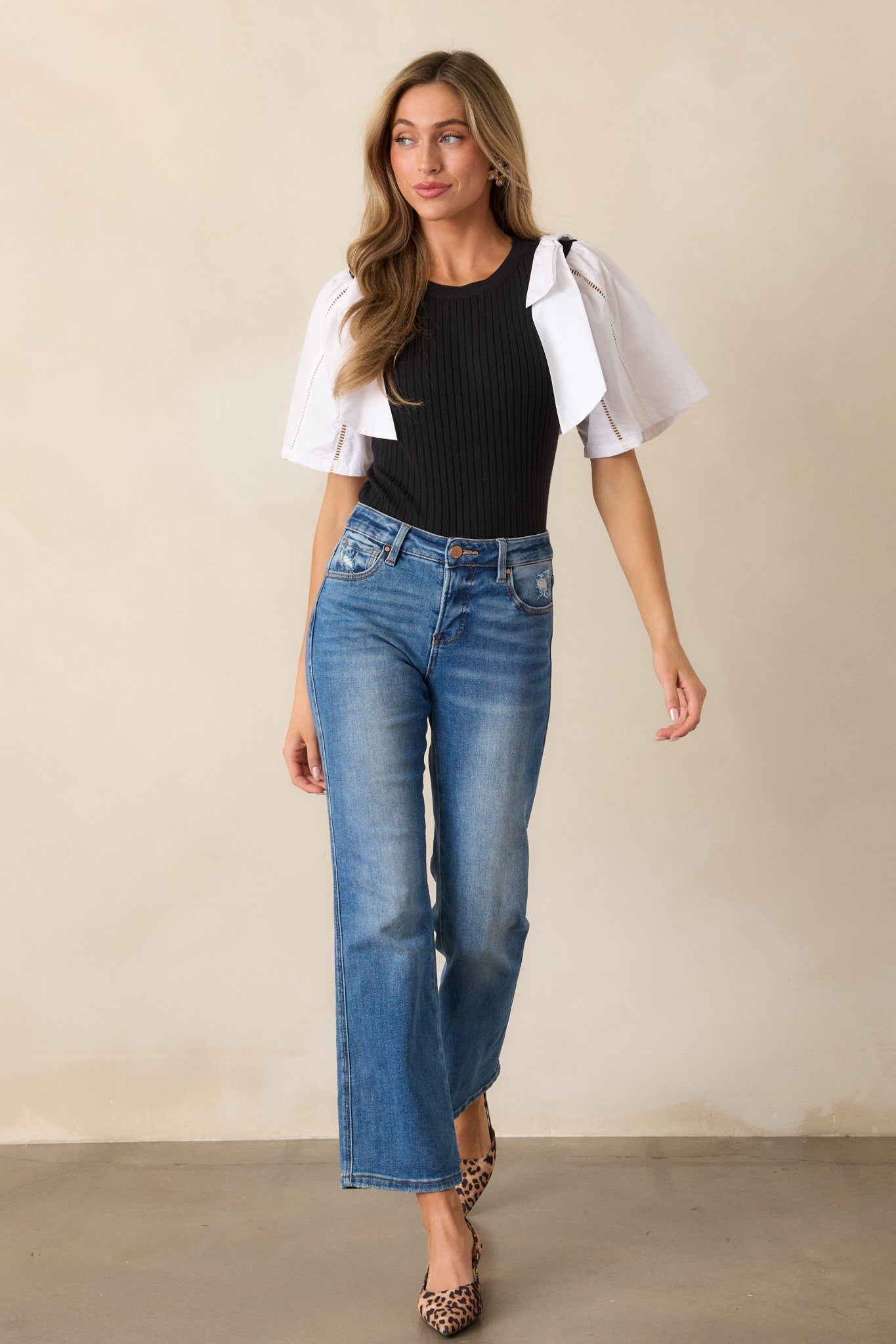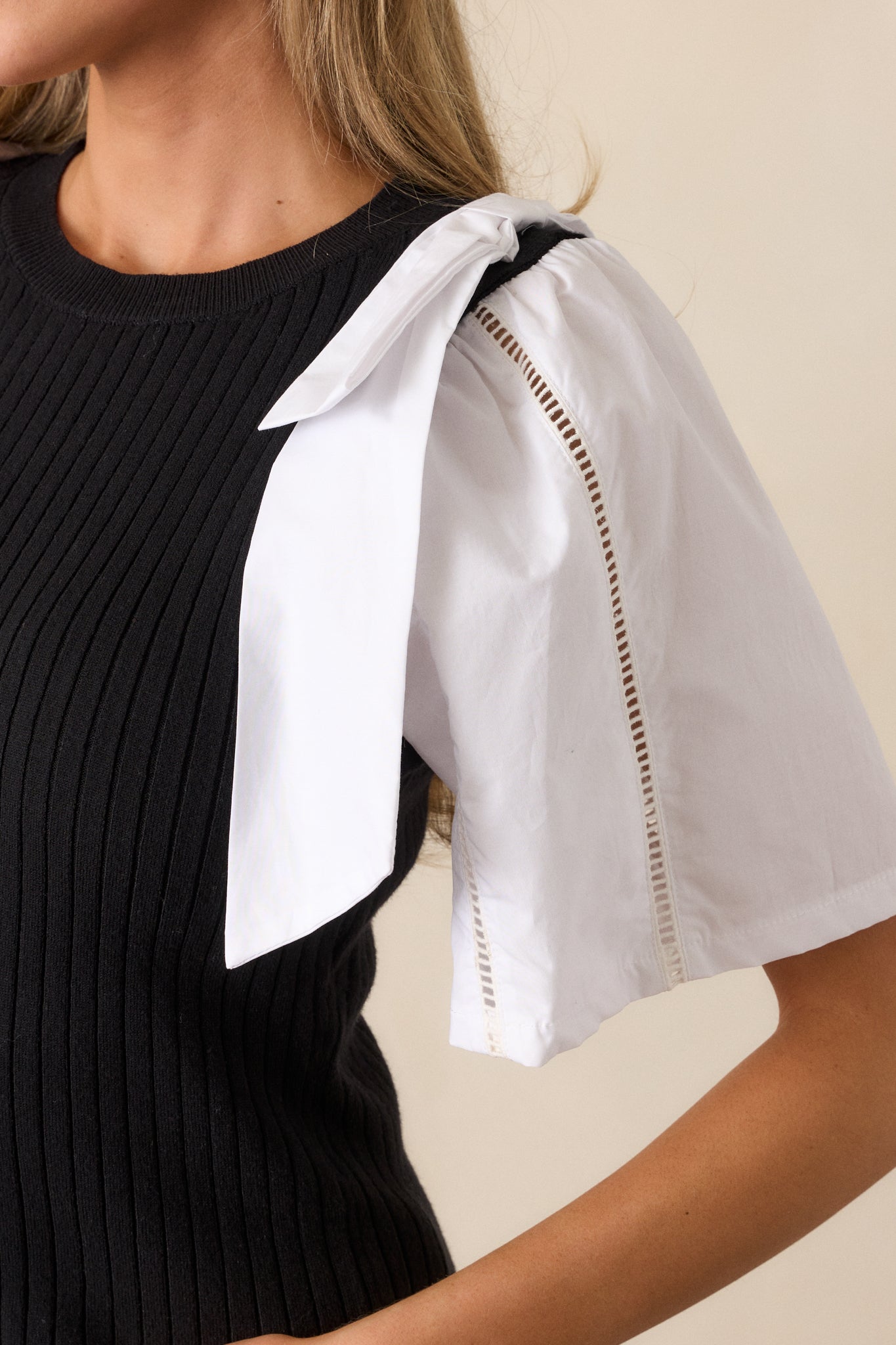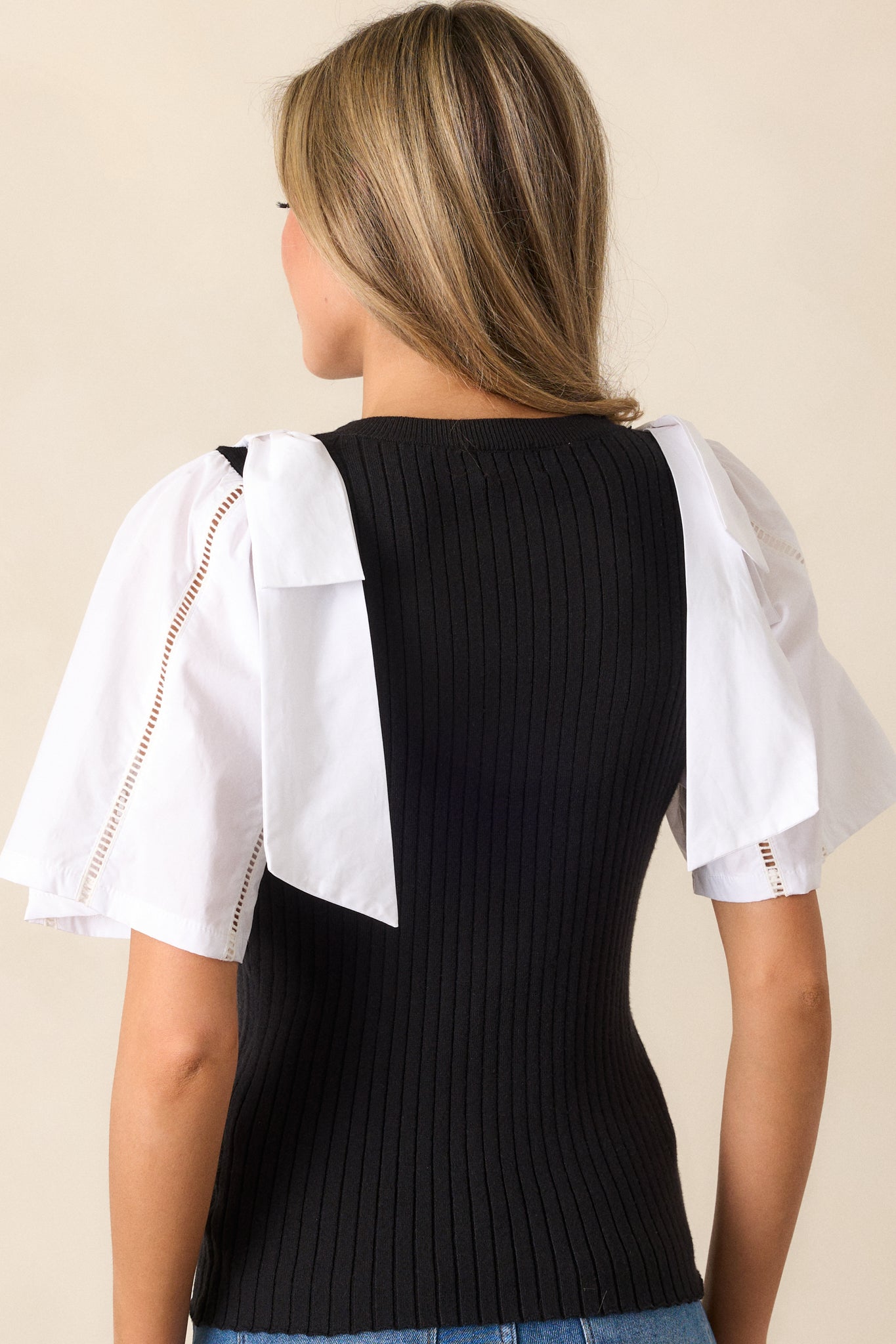 Get ready to turn heads with our All My Attention Black & White Sweater Top. This playful piece features bold, contrasting colors that will make you stand out in a crowd. With its cozy sweater material, you'll stay warm and stylish all day long. Perfect for adding a fun touch to any outfit! This black and white sweater top features a round neckline, a ribbed sweater bodice, color blocked cotton sleeves, bowties on each shoulder and delicate cut-out detailing on the sleeves.
