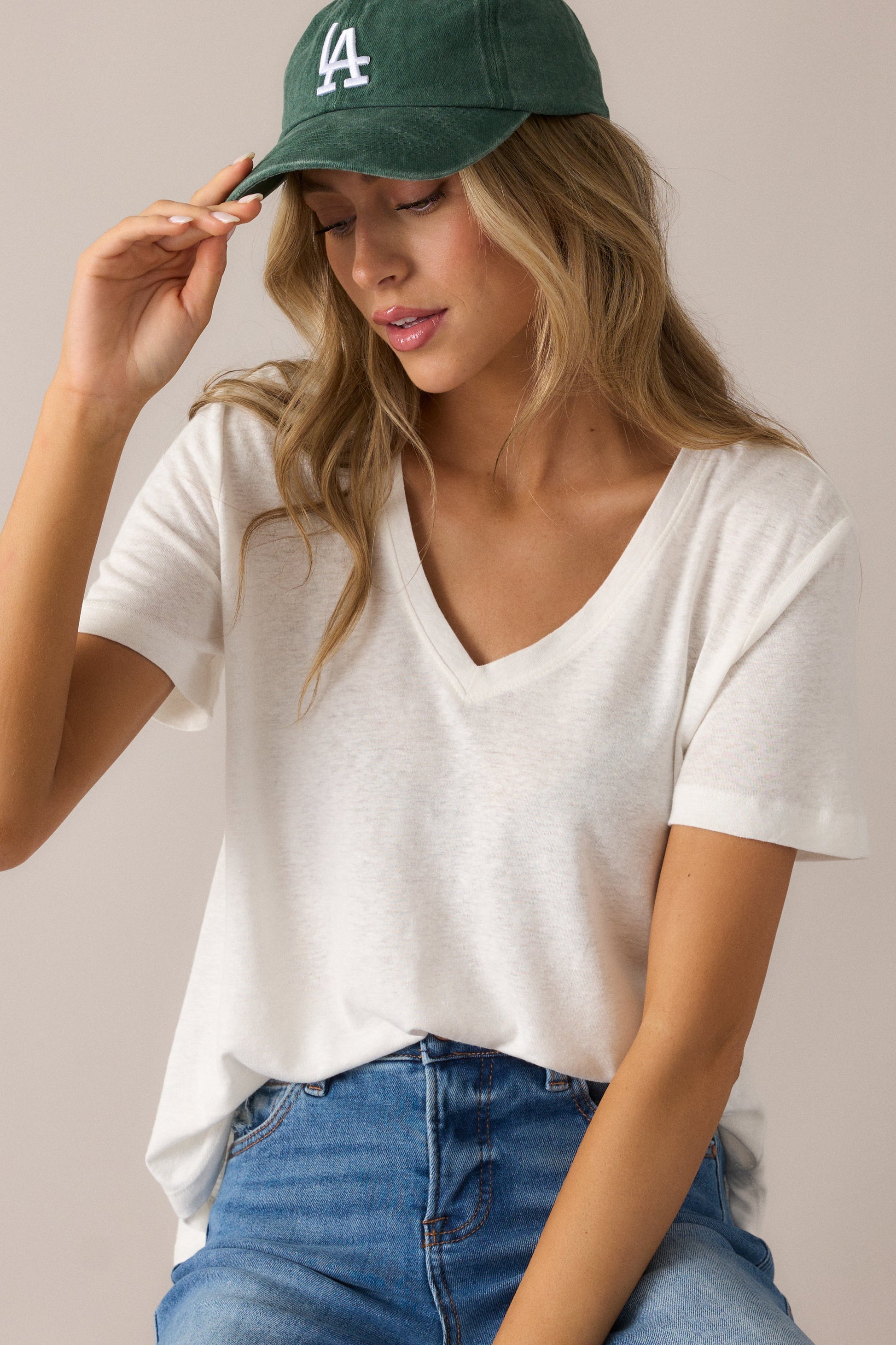 Introducing the All The Way Ivory V-Neckline Washed Tee - the ultimate casual top for any occasion. With a stylish v-neckline and soft washed fabric, this tee offers both comfort and style. Perfect for dressing up or down, this tee will become your go-to piece. Add it to your wardrobe today! This ivory tee features a v-neckline, relaxed fit, washed fabric, a scoop hemline, and short sleeves.