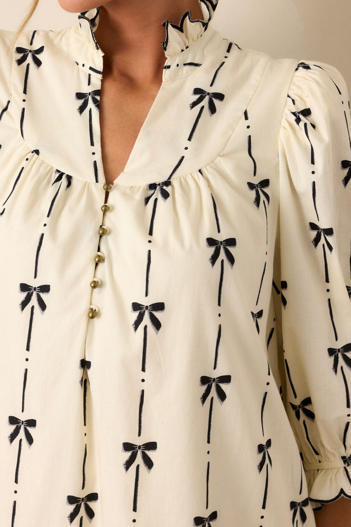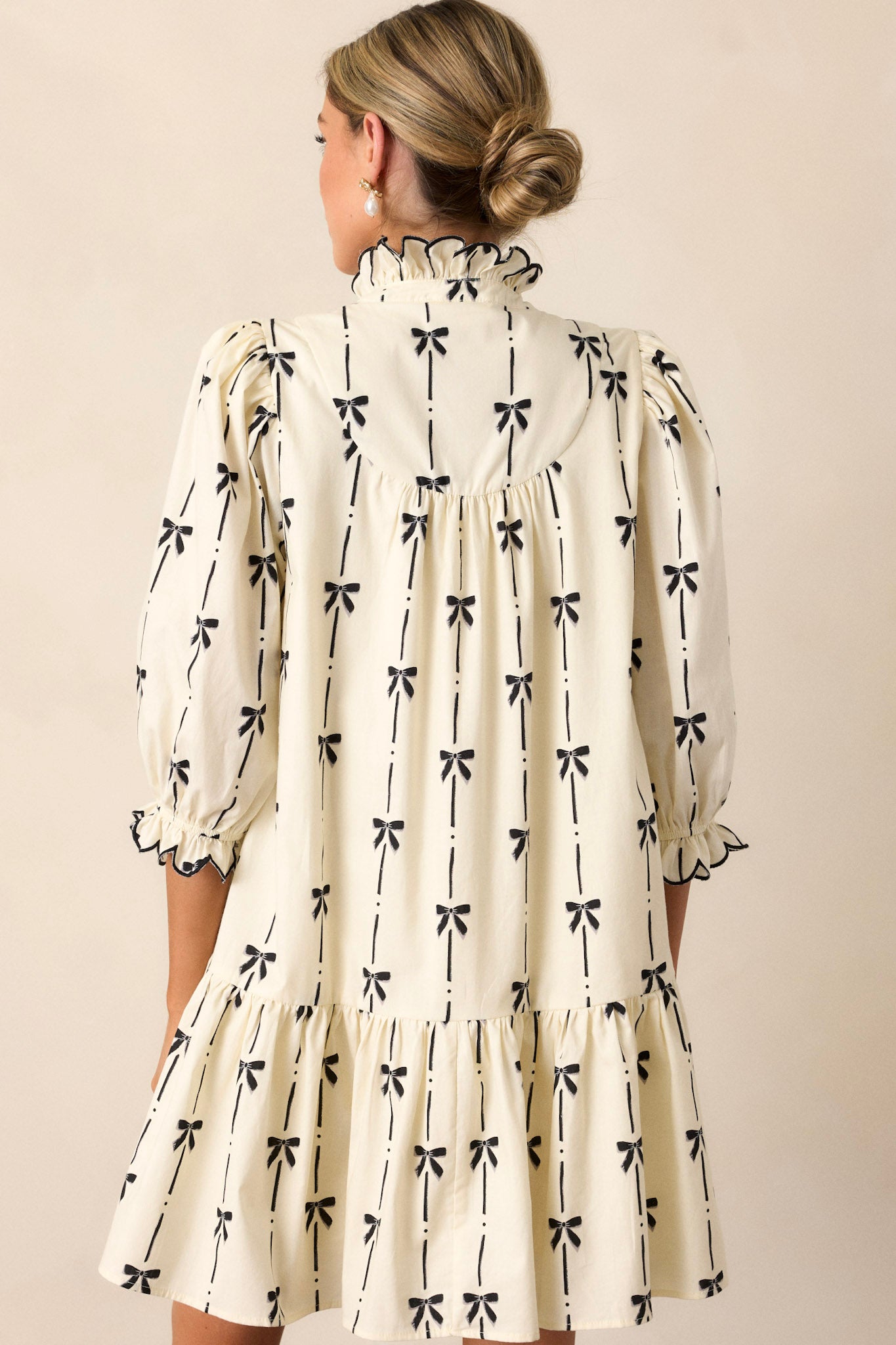 Unleash your inner fashionista in our All Tied Up Mini Dress! Made from 100% cotton, this ivory dress features charming puff sleeves and a flattering mini length. Perfect for any occasion, you'll feel confident and stylish in this must-have piece! This ivory dress features a ruffle v-neckline, elastic cuffed three-quarter length sleeves, a black bow print throughout, and two functional hip pockets.