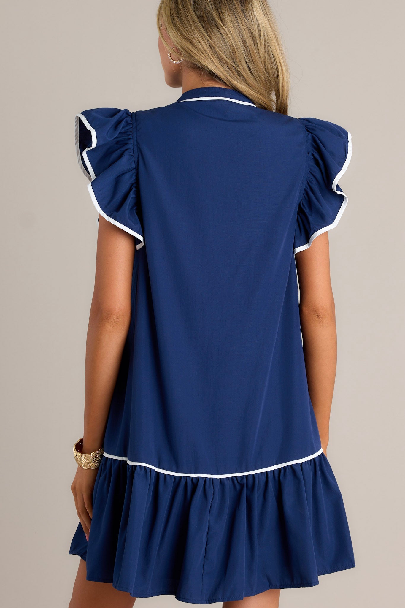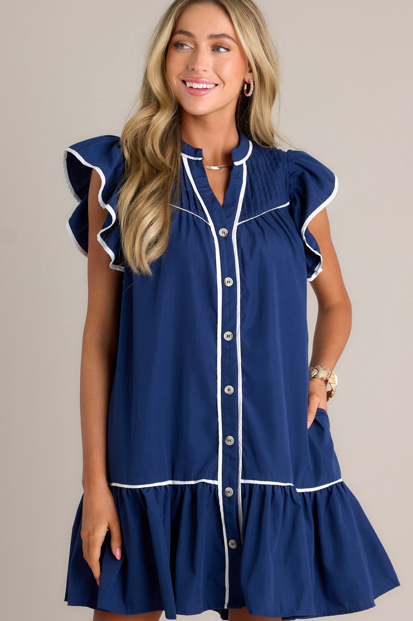 Step into style with this All Time Favorite Navy Button Front Mini Dress. The classic design and playful touches like front buttons and a mini length make it a wardrobe must-have. Perfect for any occasion, dress it up or down for a versatile and chic look. This navy mini dress features a v-neckline, a pleated chest, a full button front, functional hip pockets, a single tier, and short flutter sleeves.