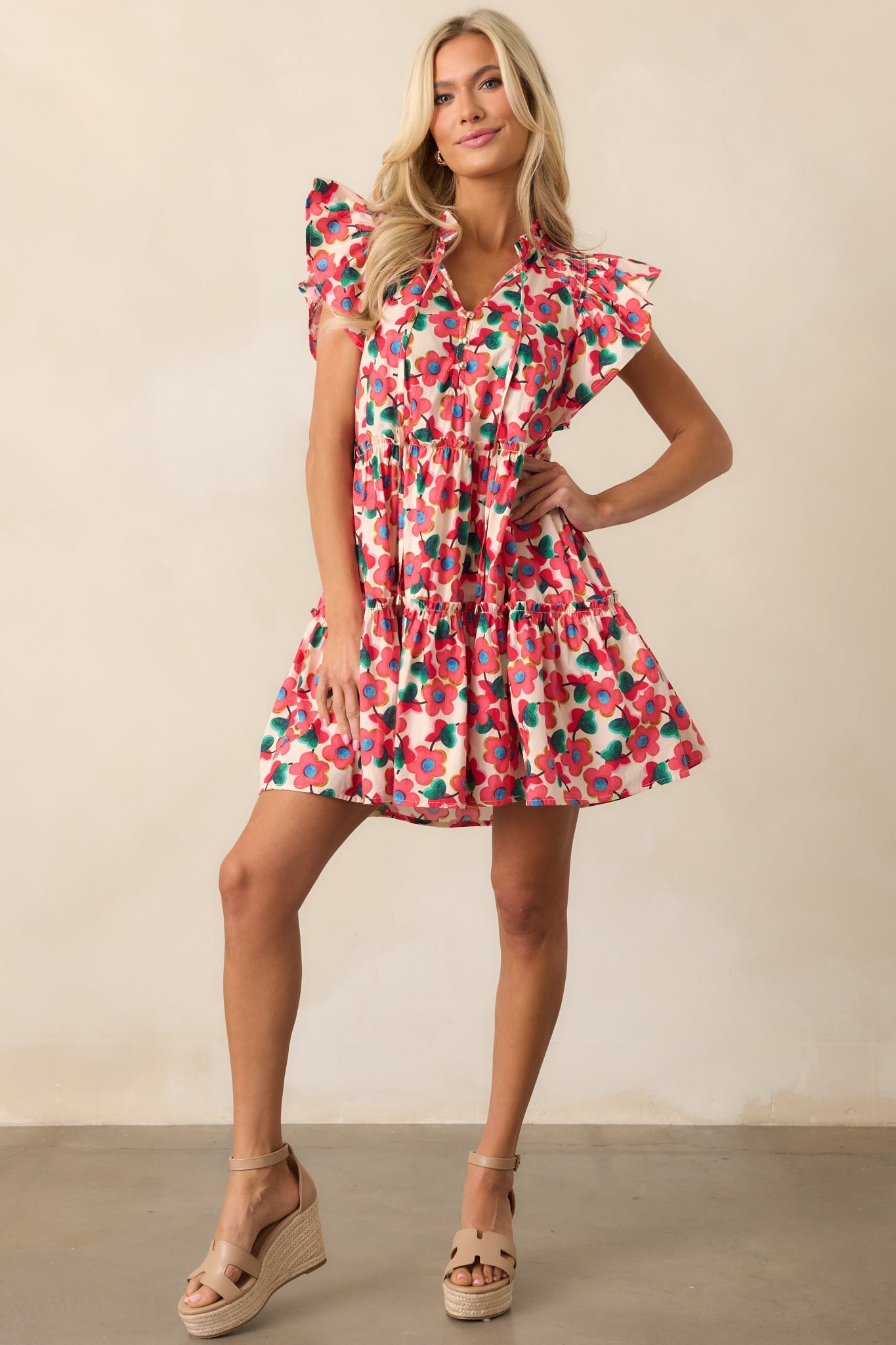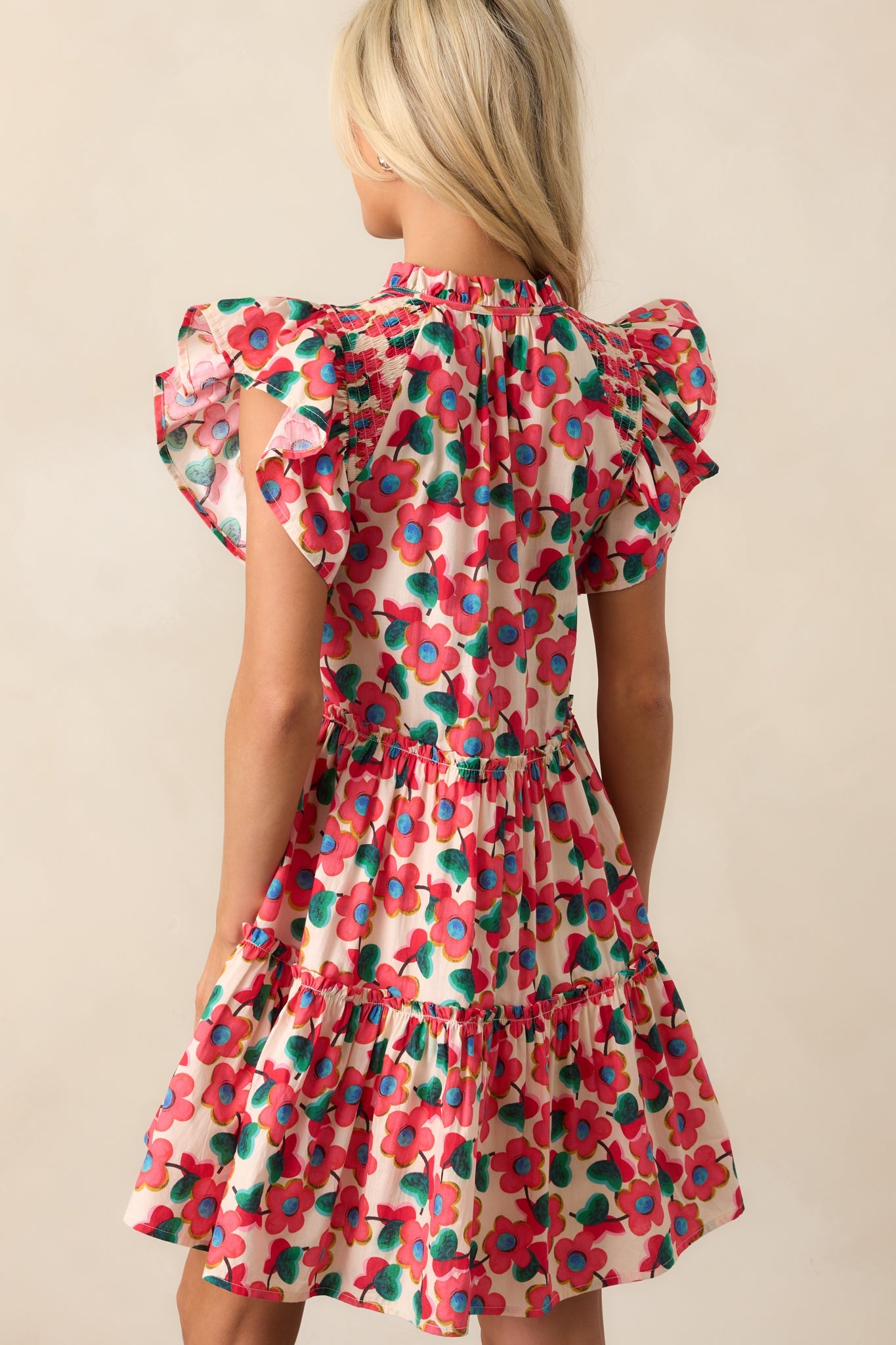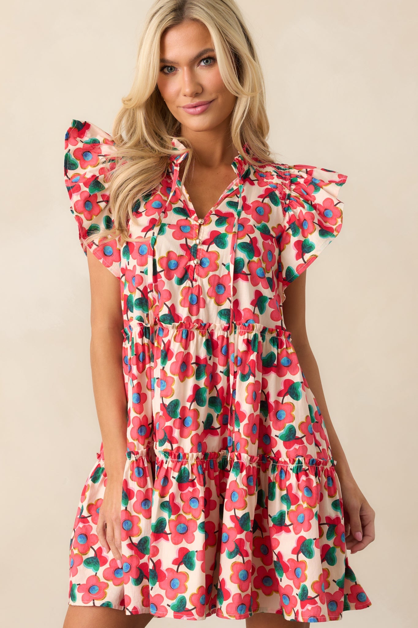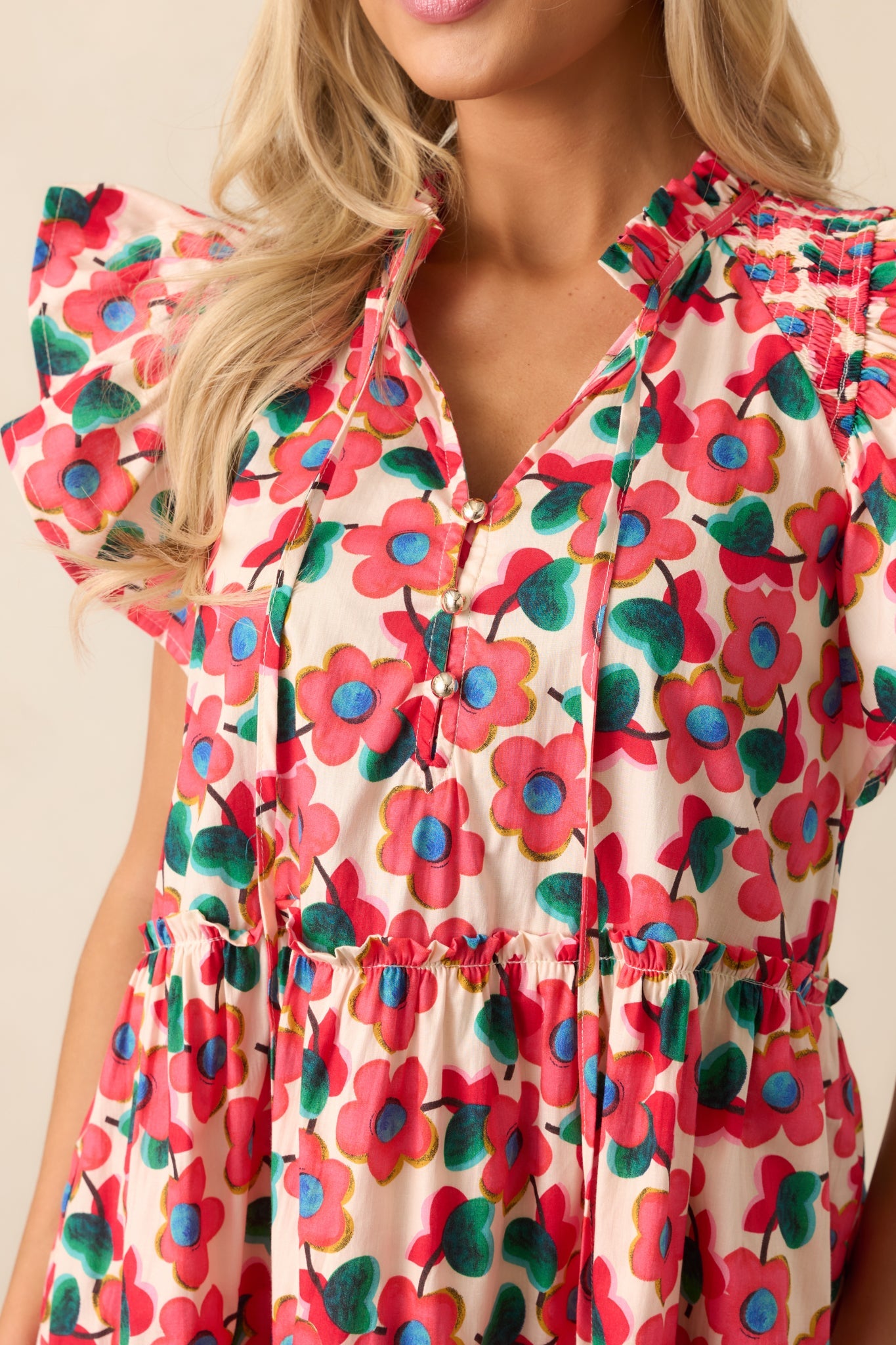 Bring charm to your wardrobe with the All You Need Red Floral Cotton Flutter Sleeve Mini Dress. This vibrant piece is perfect for a garden party or a summer brunch, offering a playful yet elegant look. Its red floral print and flutter sleeves add a touch of whimsy, making it a great choice for anyone who wants to add a bit of flair to their style. This red mini dress features a multicolor floral print, a v-neckline with 3 functional gold buttons, smocked shoulder panels, ruffle detailing throughout, short flutter sleeves, and functional pockets.