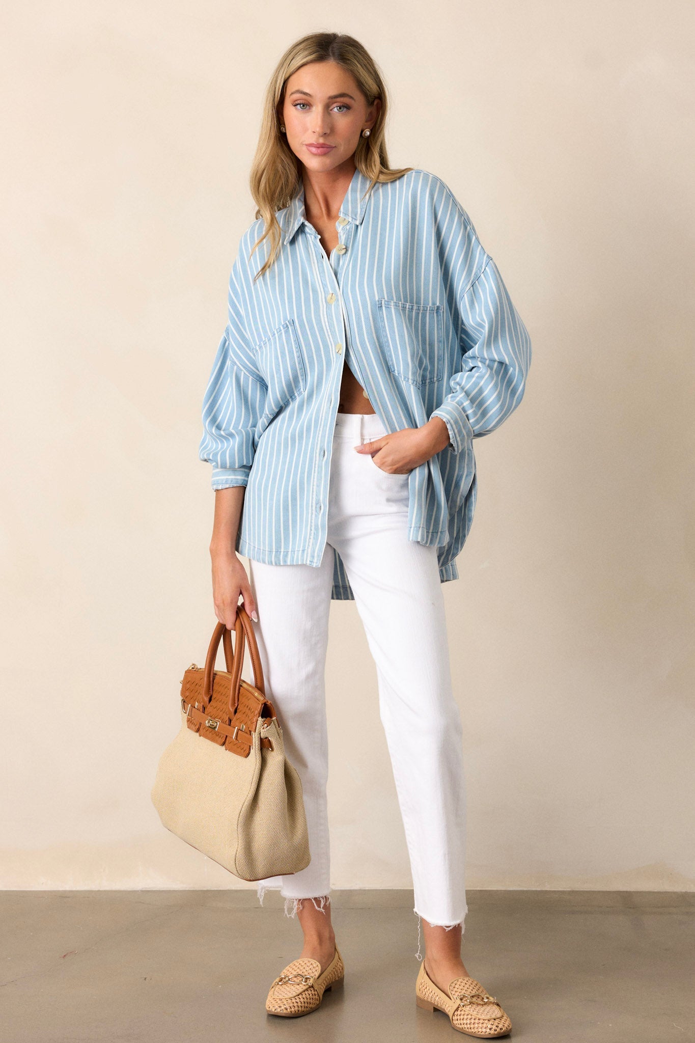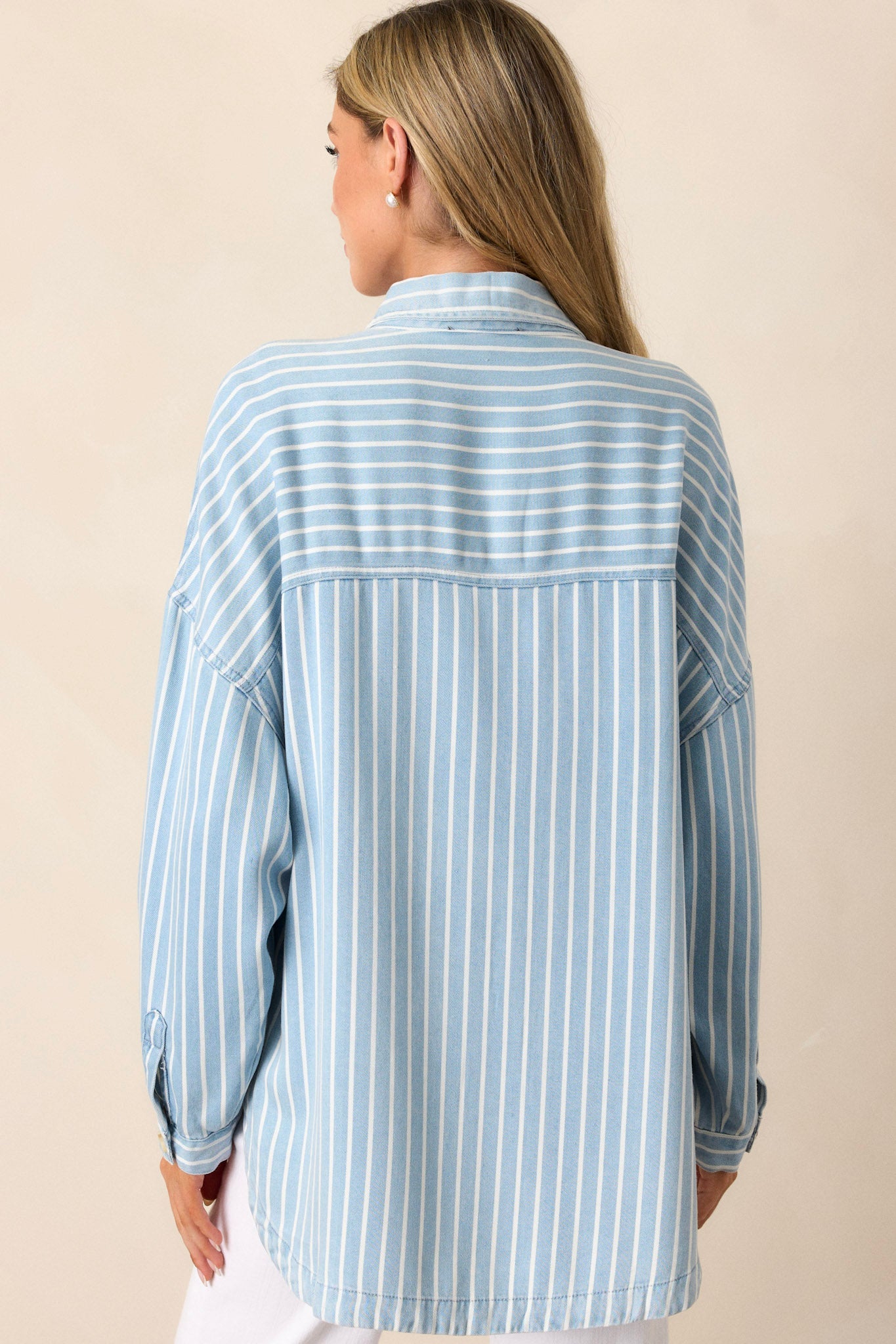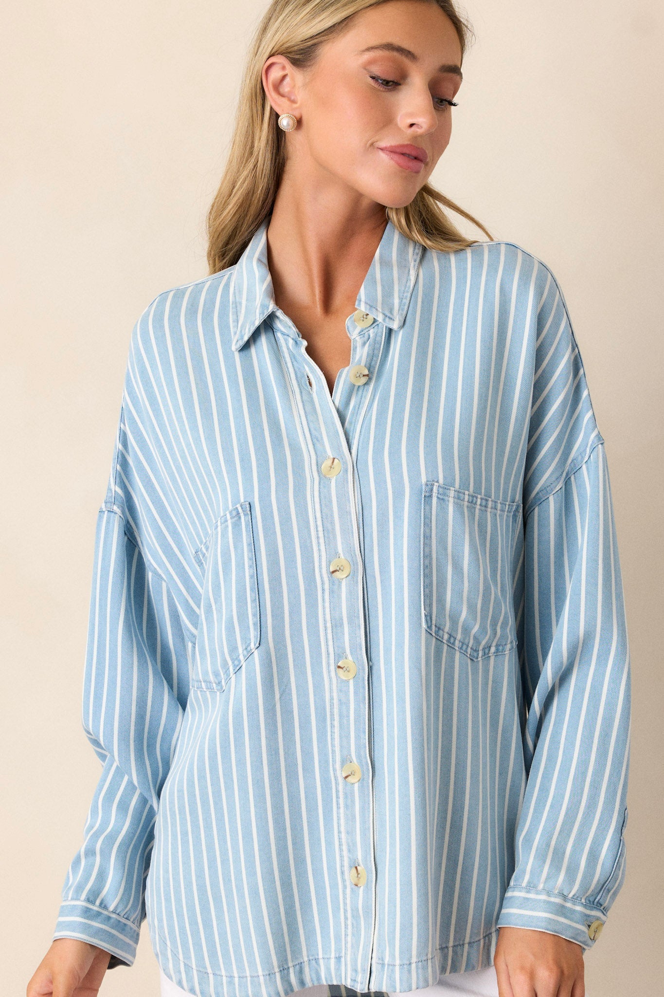 Looking for an effortless classic? This Always Lovely Blue Striped Top is your go-to for effortless, casual style. Throw it on and get ready for the compliments! This top features a collared neckline, functional buttons down the front, two functional bust pockets, long sleeves with buttoned cuffs, a scoop bottom hem, and a super soft material.
