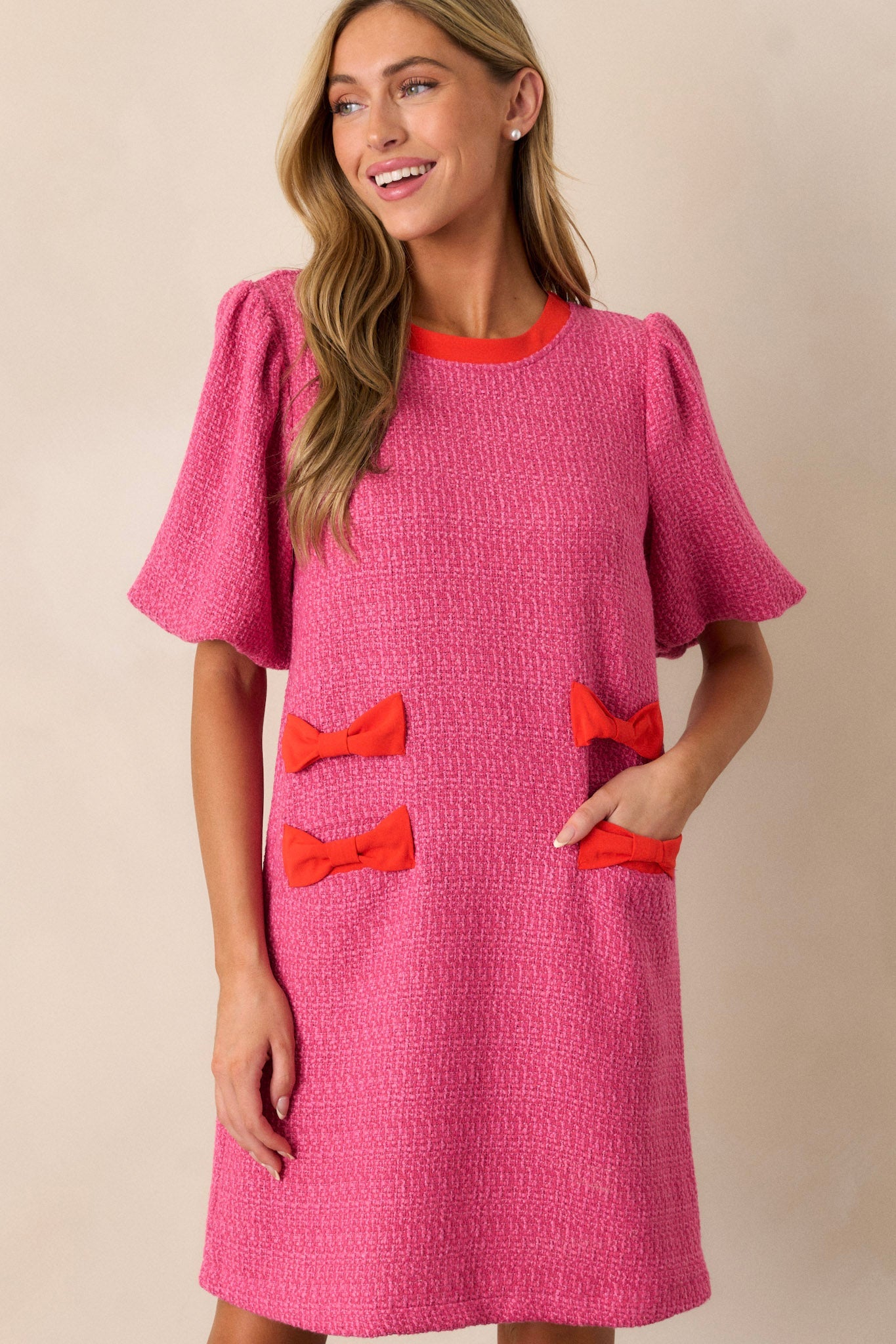 Looking for a stylish yet comfortable dress? Look no further than our Angel Eyes Pink Tweed Mini Dress. This dress features a soft tweed fabric that will keep you cozy all day, while the elegant design and pink color provides a chic and sophisticated look. Perfect for any occasion, this dress is a must-have in your wardrobe. This pink tweed dress features an orange high rounded neckline, a relaxed fit, orange bow detailing on the hips, functional hip pockets, a discrete back zipper and elastic cuffed short sleeves.
