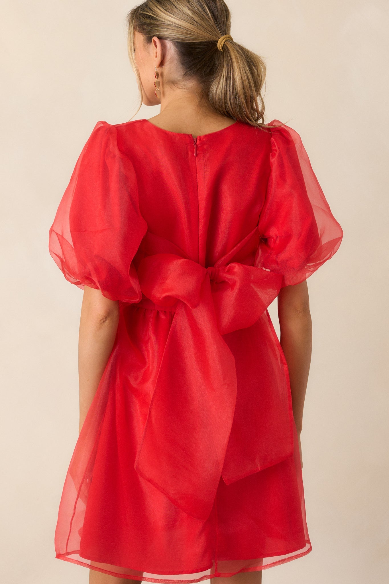 Enhance your wardrobe with our Another Kiss Red Puff Sleeve Mini Dress! The vibrant red color and puff sleeves add a touch of fun and femininity, making you stand out in any crowd. Perfect for a night out or a special occasion, this dress will make you feel confident and stylish. This red dress features a rounded neckline, self tie organza back detail, flare skirt, discrete back zipper and puff sleeves.