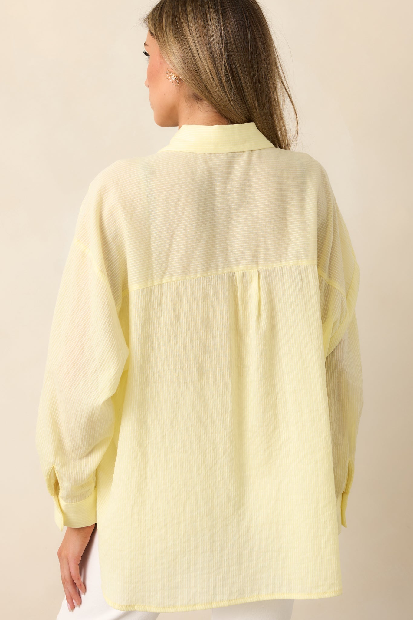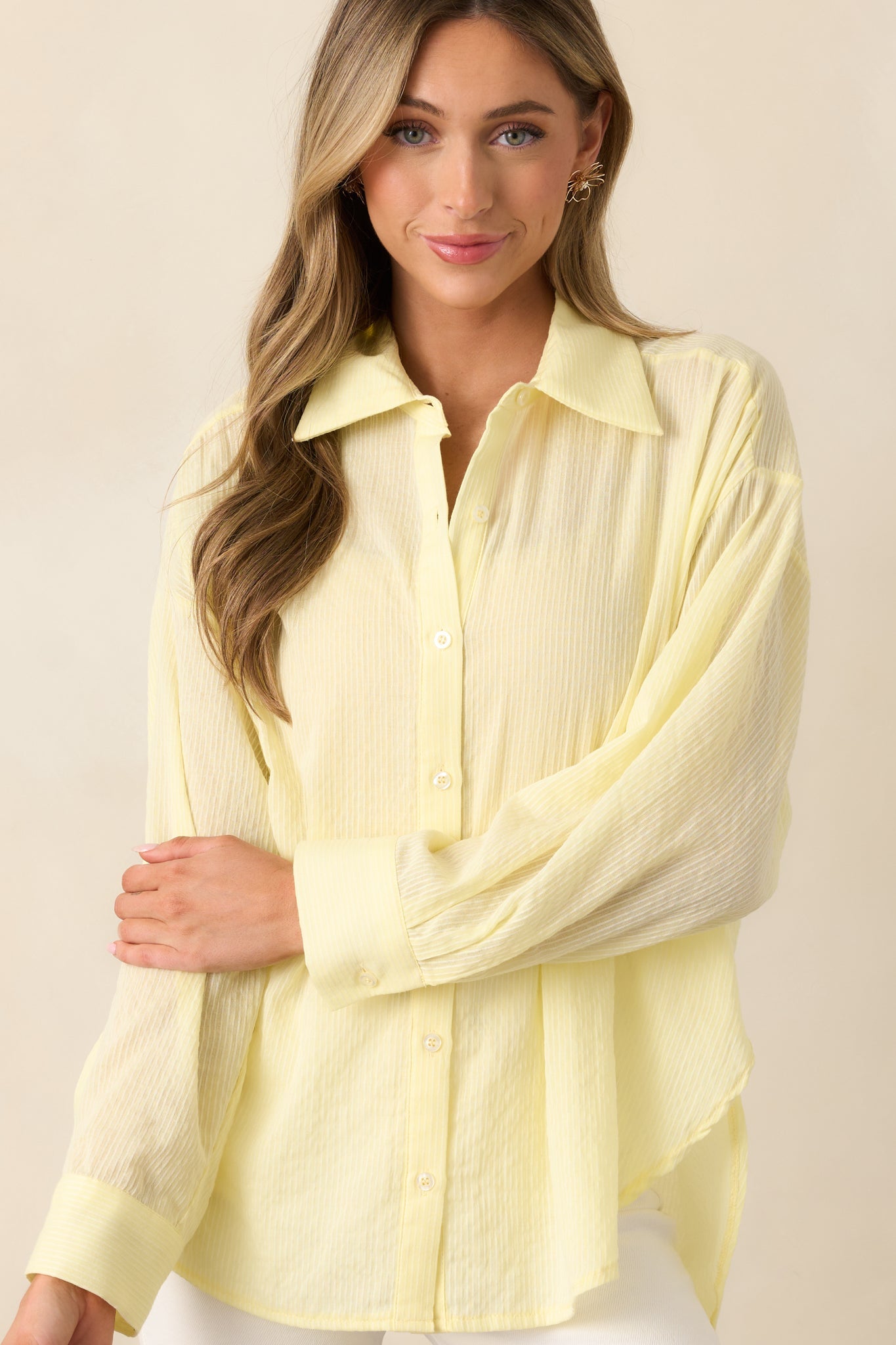 Introducing our Another Sunny Day Lemon Yellow Button Front Blouse! This must-have piece features a breezy button front design that will keep you cool on even the hottest days. Its vibrant lemon yellow color is sure to brighten up your wardrobe, perfect for any occasion. Stay stylish and comfortable all day long in this versatile and fashion-forward blouse. This yellow blouse features a collared neckline, button front design, textured material, and long sleeves with button cuffs.
