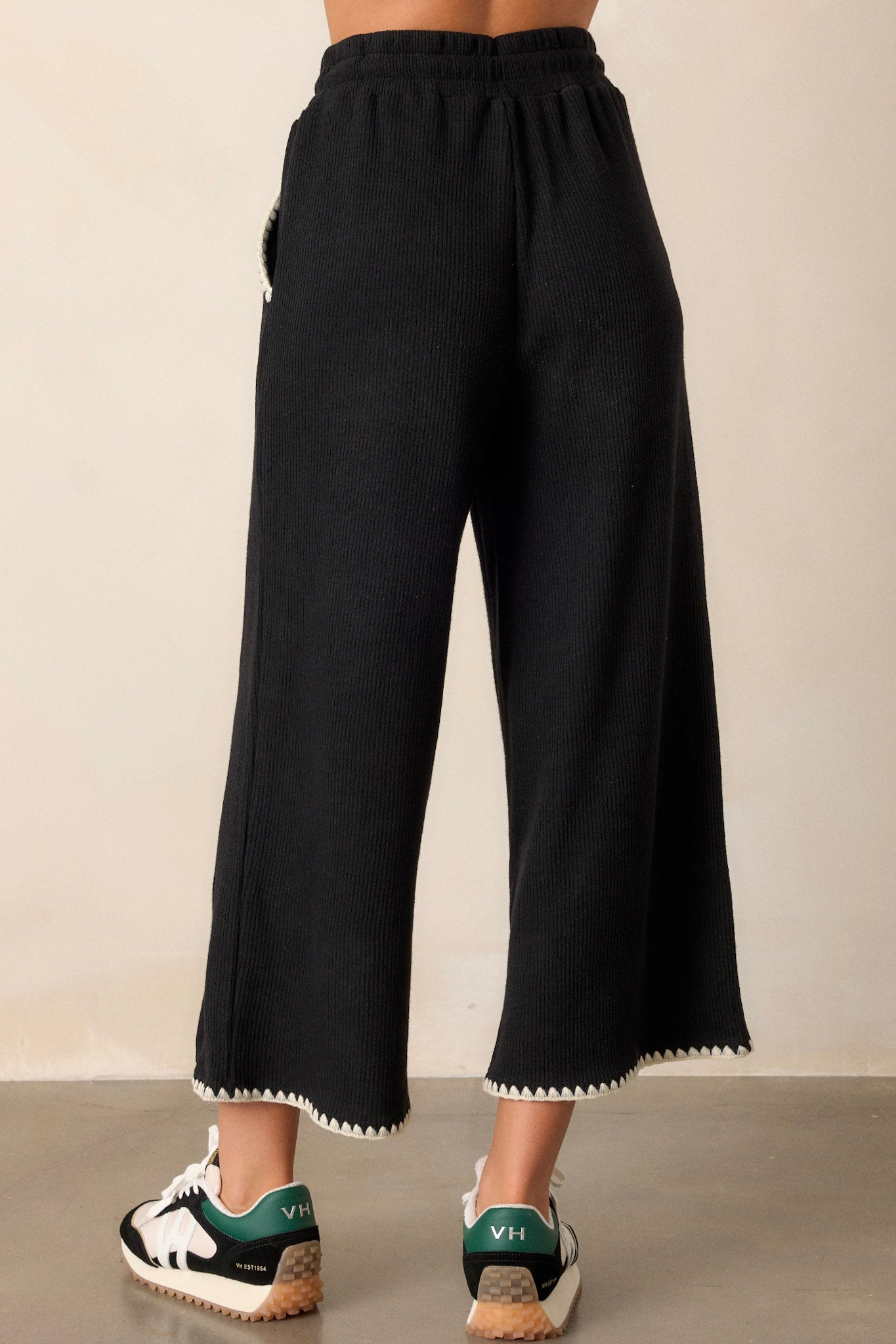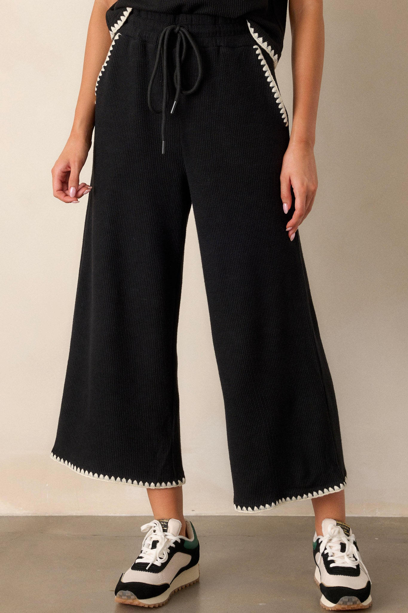 Elevate your casual style with our Anytime Now Black Blanket Stitch Wide Leg Pants. These pants feature a stylish and comfortable wide leg design, perfect for any occasion. The blanket stitching adds a unique touch to your look, while the stretchy material ensures all-day comfort. Upgrade your wardrobe now! These black pants feature an elastic waistband, an adjustable drawstring, ivory blanket stitch detailing, functional hip pockets, a soft knit material, and a wide leg.