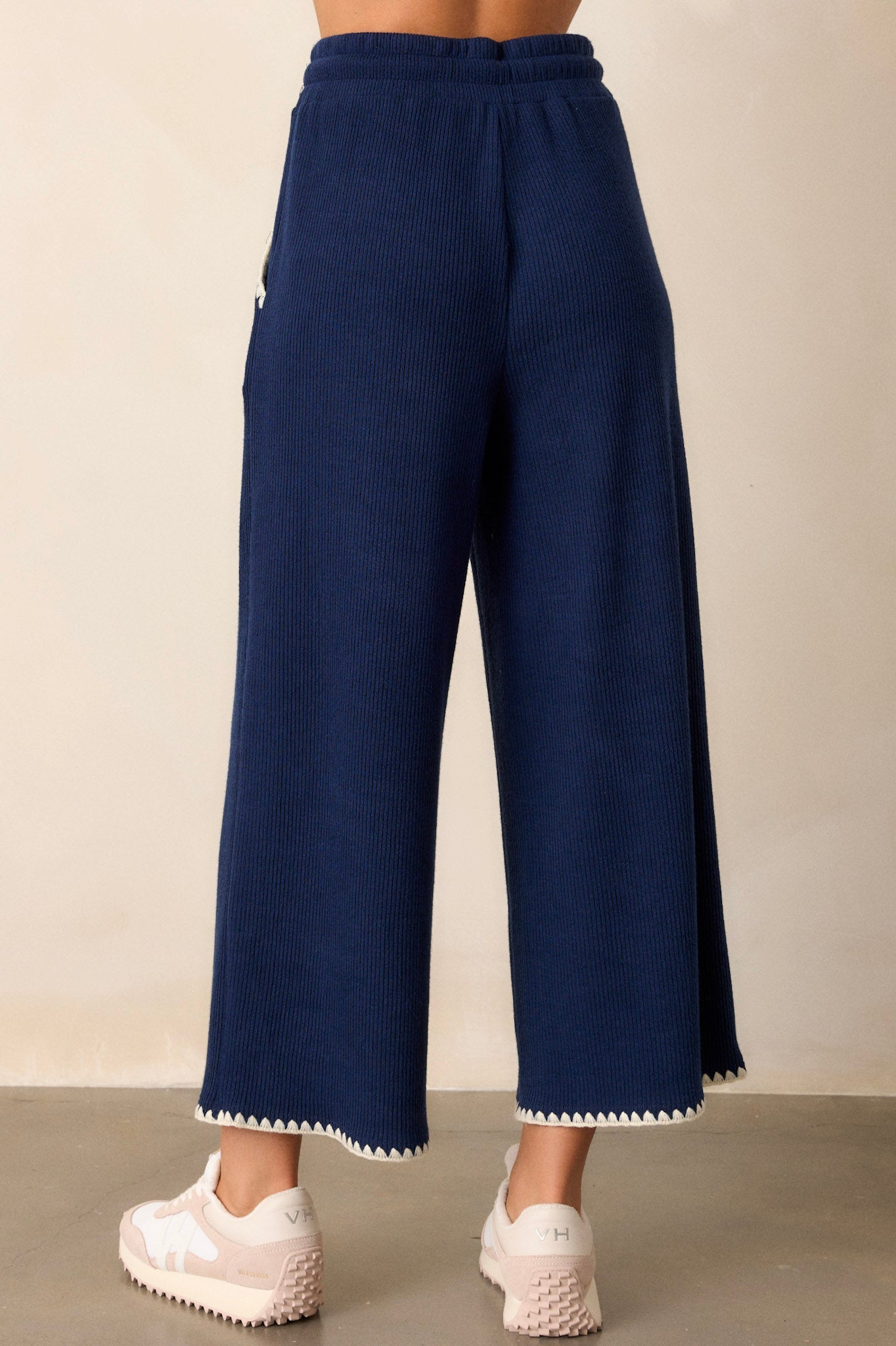 Elevate your casual style with our Anytime Now Navy Blanket Stitch Wide Leg Pants. These pants feature a stylish and comfortable wide leg design, perfect for any occasion. The blanket stitching adds a unique touch to your look, while the stretchy material ensures all-day comfort. Upgrade your wardrobe now! These navy pants feature an elastic waistband, an adjustable drawstring, ivory blanket stitch detailing, functional hip pockets, a soft knit material, and a wide leg.