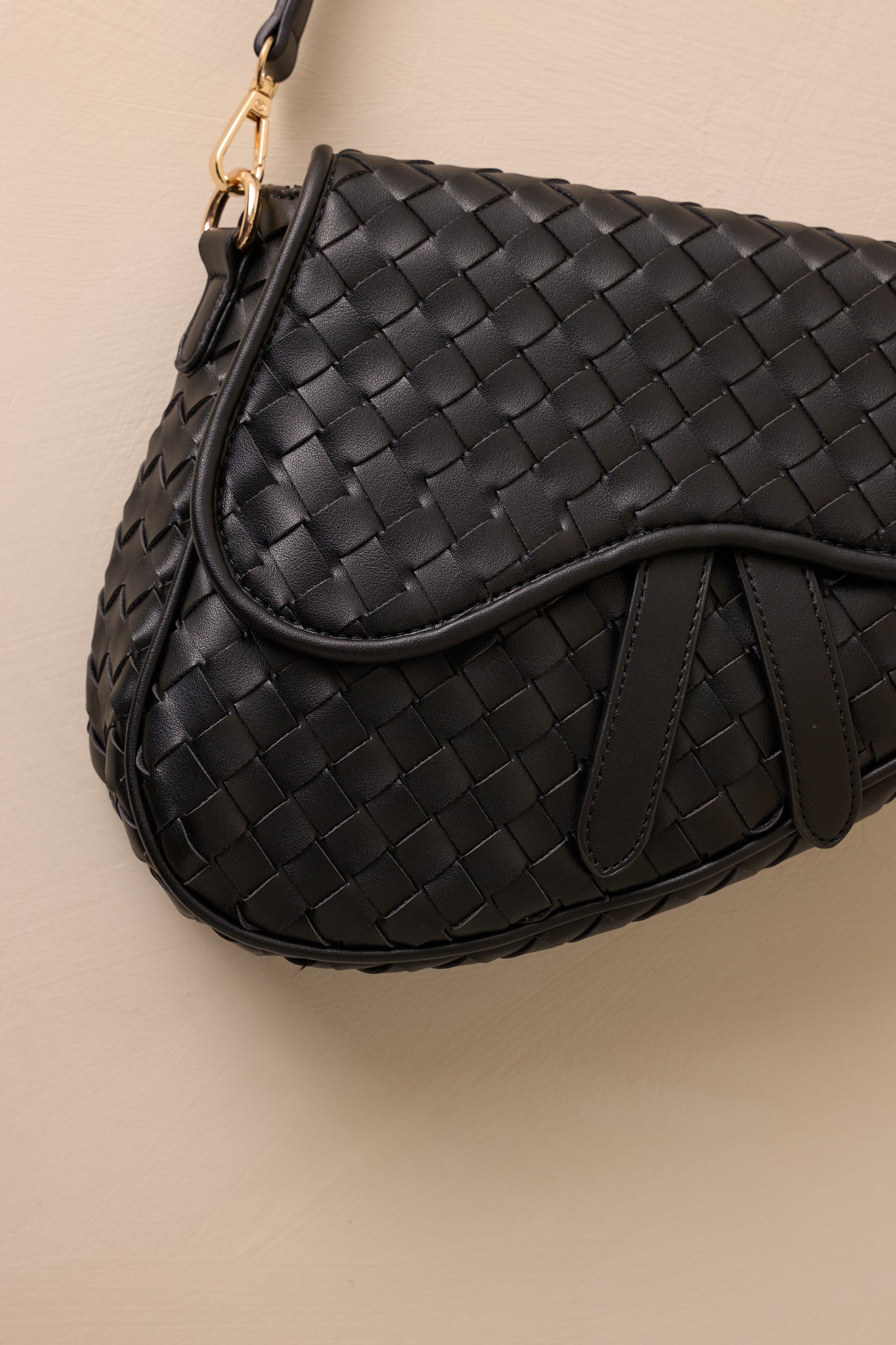 Upgrade your style with our Around City Streets woven black saddlebag. Perfect for navigating the city streets, this saddlebag is both stylish and practical. Its woven design adds a touch of sophistication, while its spacious interior allows you to carry all your essentials on the go. Travel in style and convenience with our saddlebag. This black handbag features gold hardware, faux leather, a woven design, a magnetic snap closure, a zipper pocket, and an additional strap.