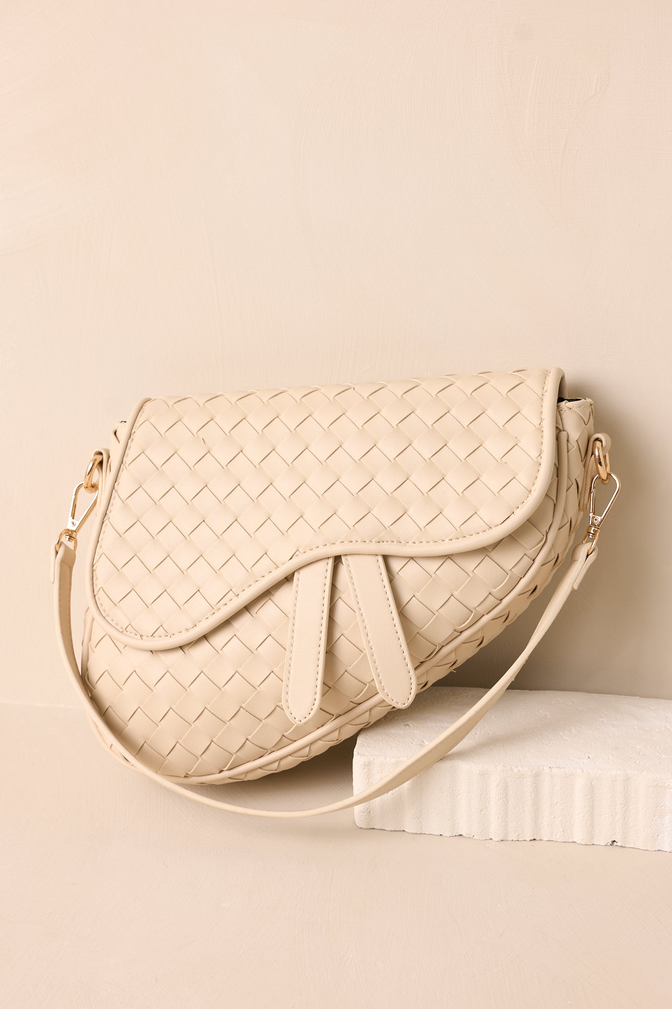Upgrade your style with our Around City Streets woven ivory saddlebag. Perfect for navigating the city streets, this saddlebag is both stylish and practical. Its woven design adds a touch of sophistication, while its spacious interior allows you to carry all your essentials on the go. Travel in style and convenience with our saddlebag. This ivory handbag features gold hardware, faux leather, a woven design, a magnetic snap closure, a zipper pocket, and an additional strap.
