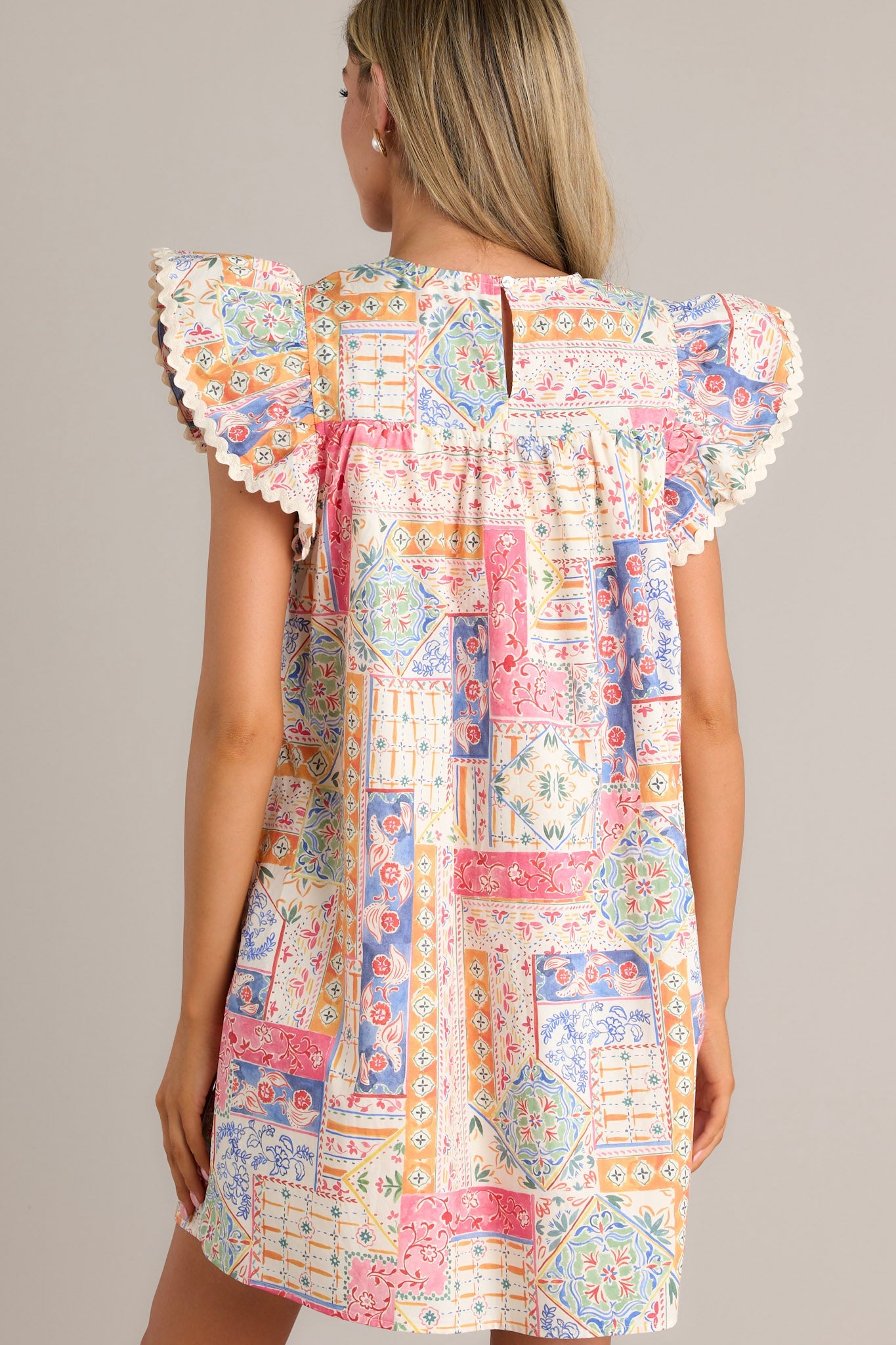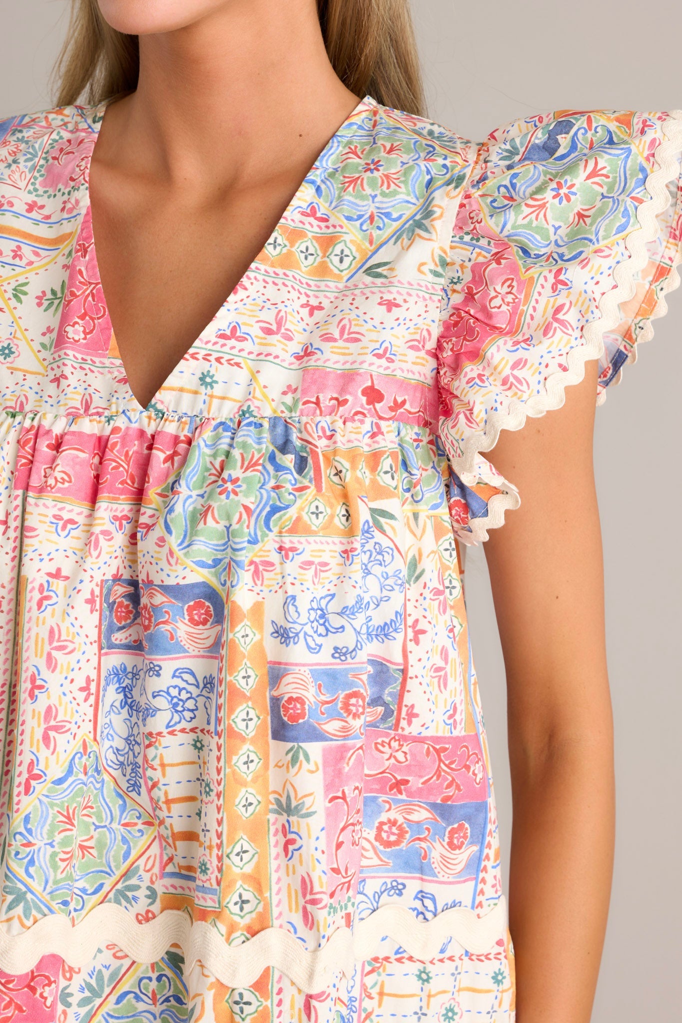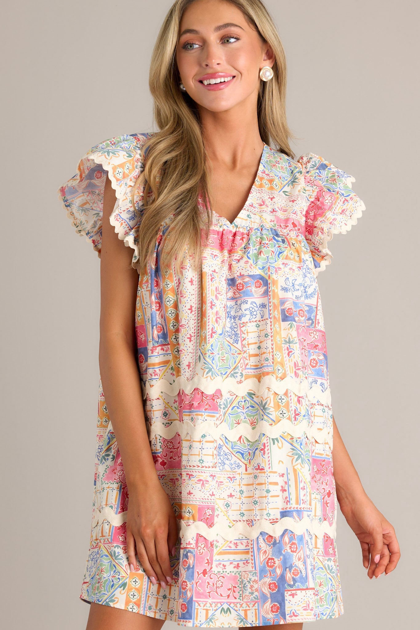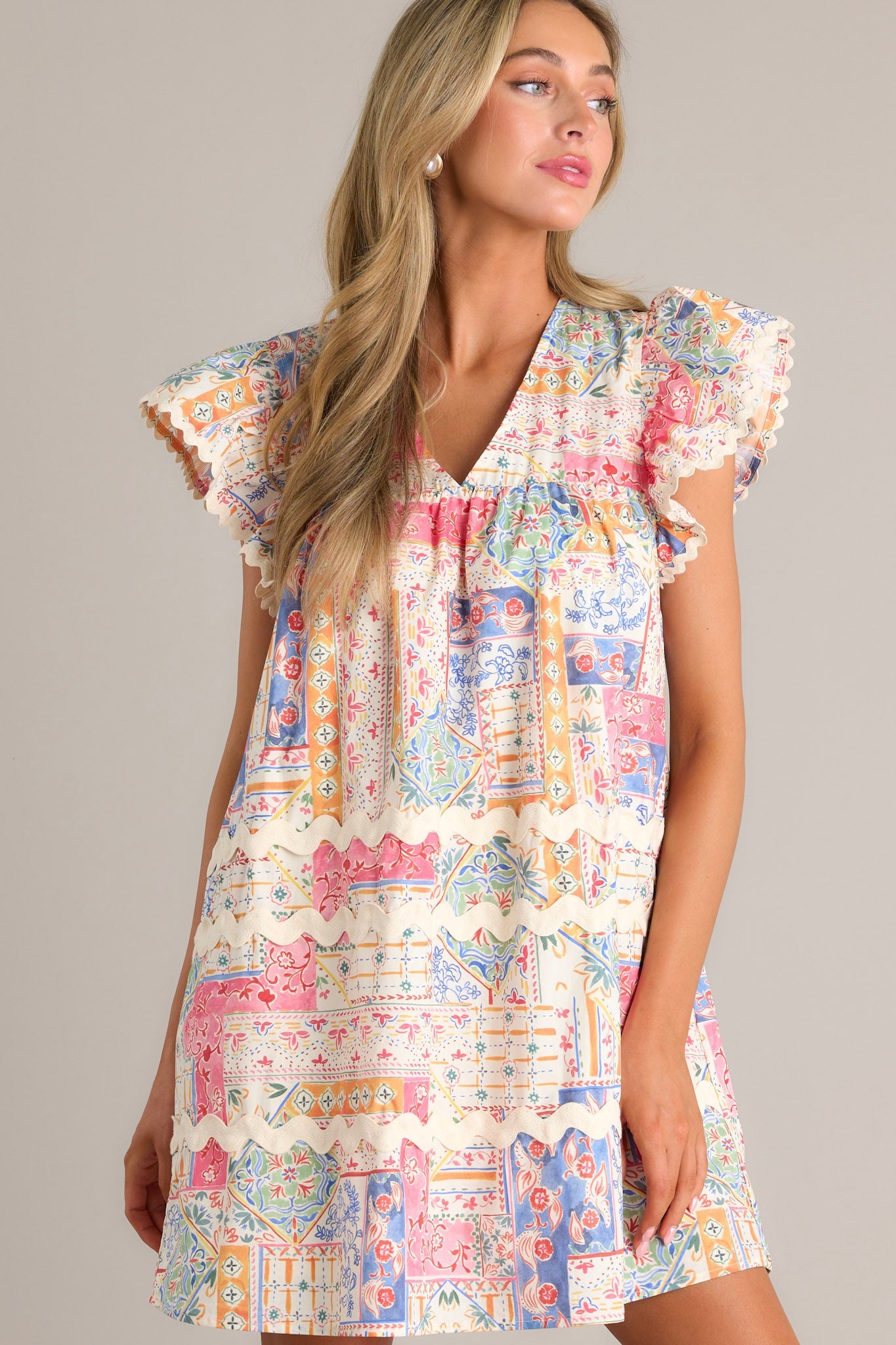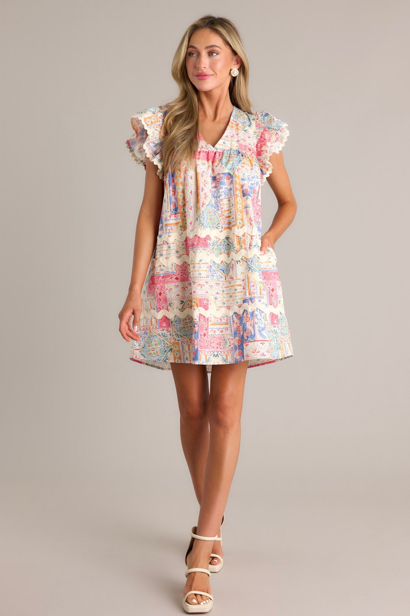 Get ready for a chic and playful look with our Artisan Affair Mini Dress! Made with 100% cotton and featuring a beautiful ivory multi patchwork design, this dress is perfect for any occasion. Mix and match with your favorite accessories for a unique and stylish outfit. This patchwork mini dress features a v-neckline, a unique patchwork design, functional hip pockets, ricrac detailing, and ricrac trim flutter sleeves.