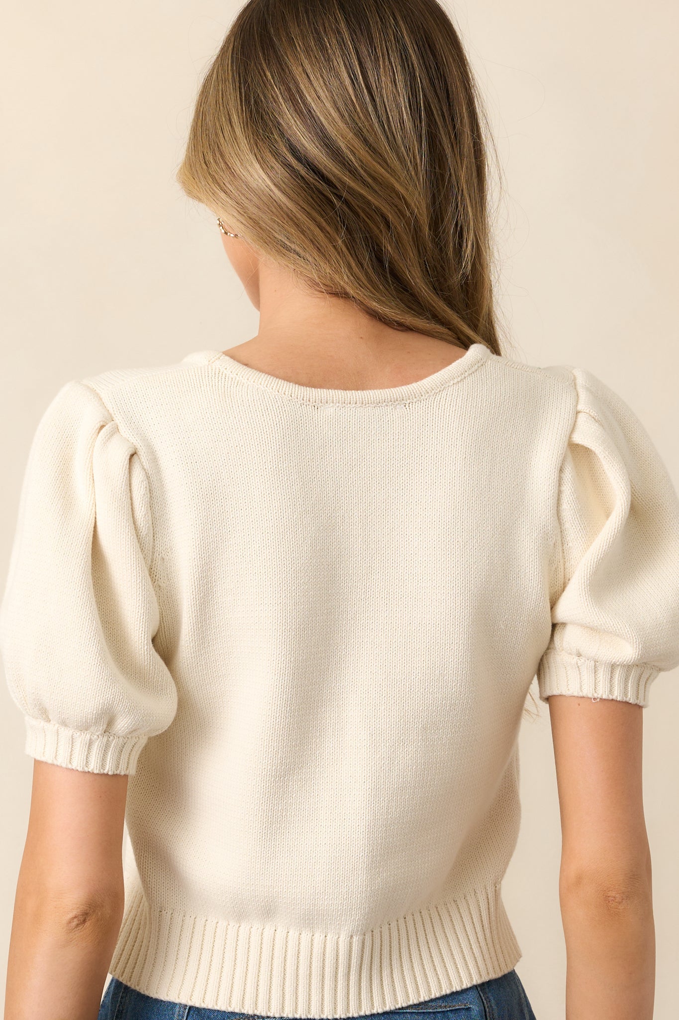 The As The Story Unfolds Ivory Cherry Embroidered Knit Top brings a sweet, nostalgic charm to any outfit. Effortlessly playful yet timeless, it’s the perfect piece for adding a hint of whimsy to your wardrobe. this ivory top features a scoop neckline, knit fabric, 3D cherry embroidered appliqués throughout the front, short puff sleeves, ribbed hemlines, and a cropped length.