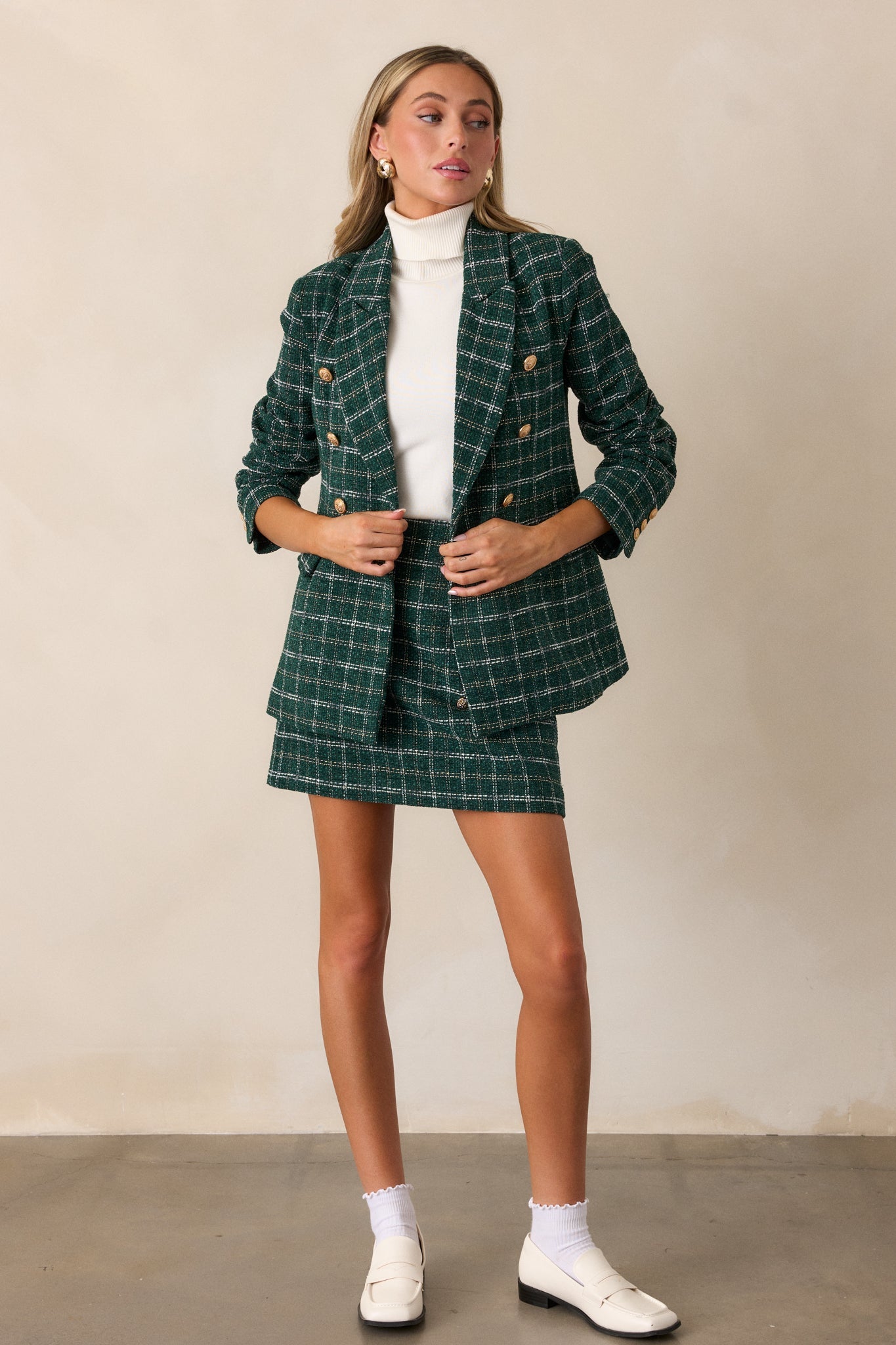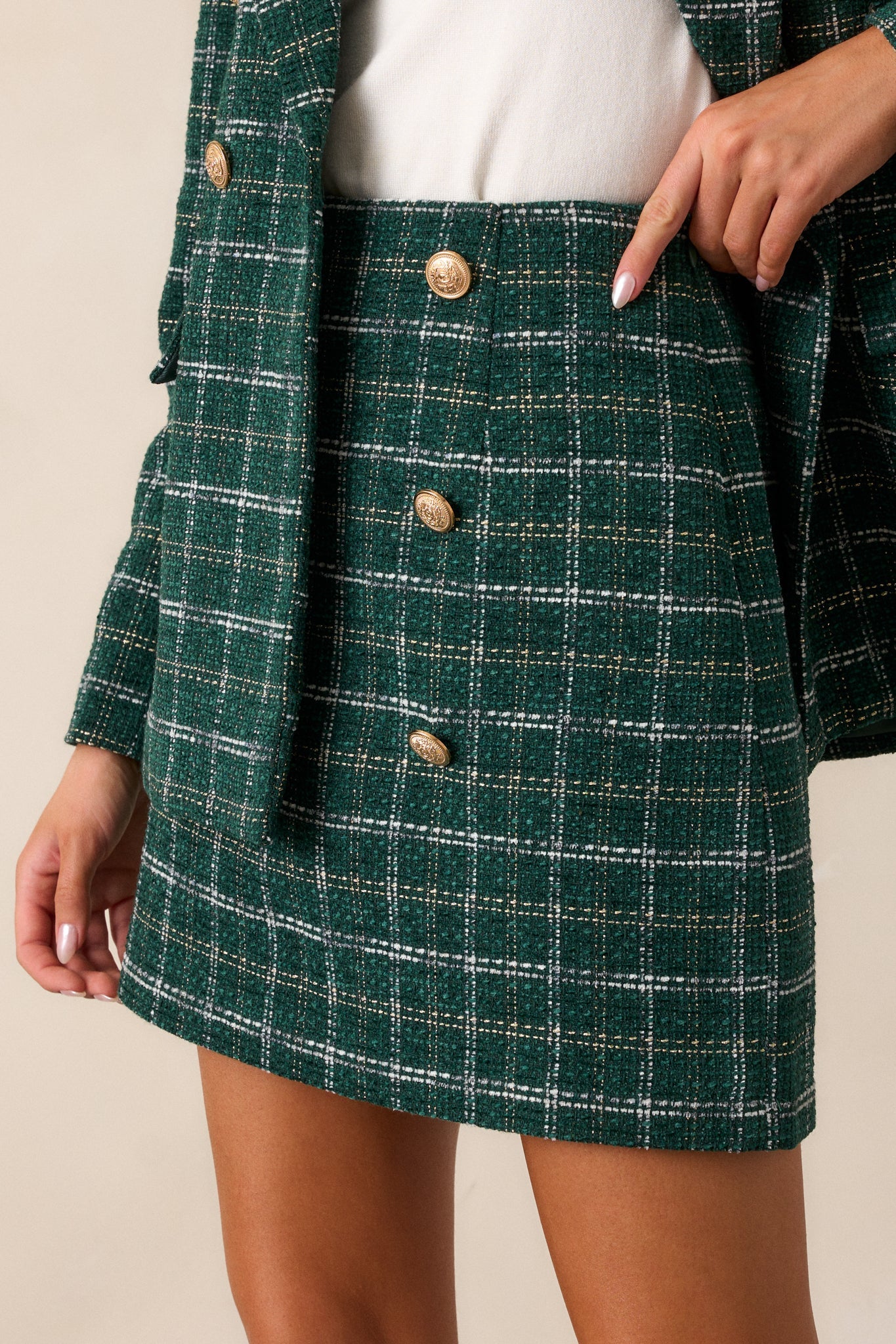 Unleash your unique style with our Authentically You Forest Green Tweed Mini Skirt. This skirt offers a classic and sophisticated look. The forest green color adds a touch of nature to your wardrobe, perfect for any season. Express yourself confidently with this must-have piece. This forest green mini skirt features a fitted design, tweed fabric with gold and white stitching, gold embellished buttons and a discrete side zipper.