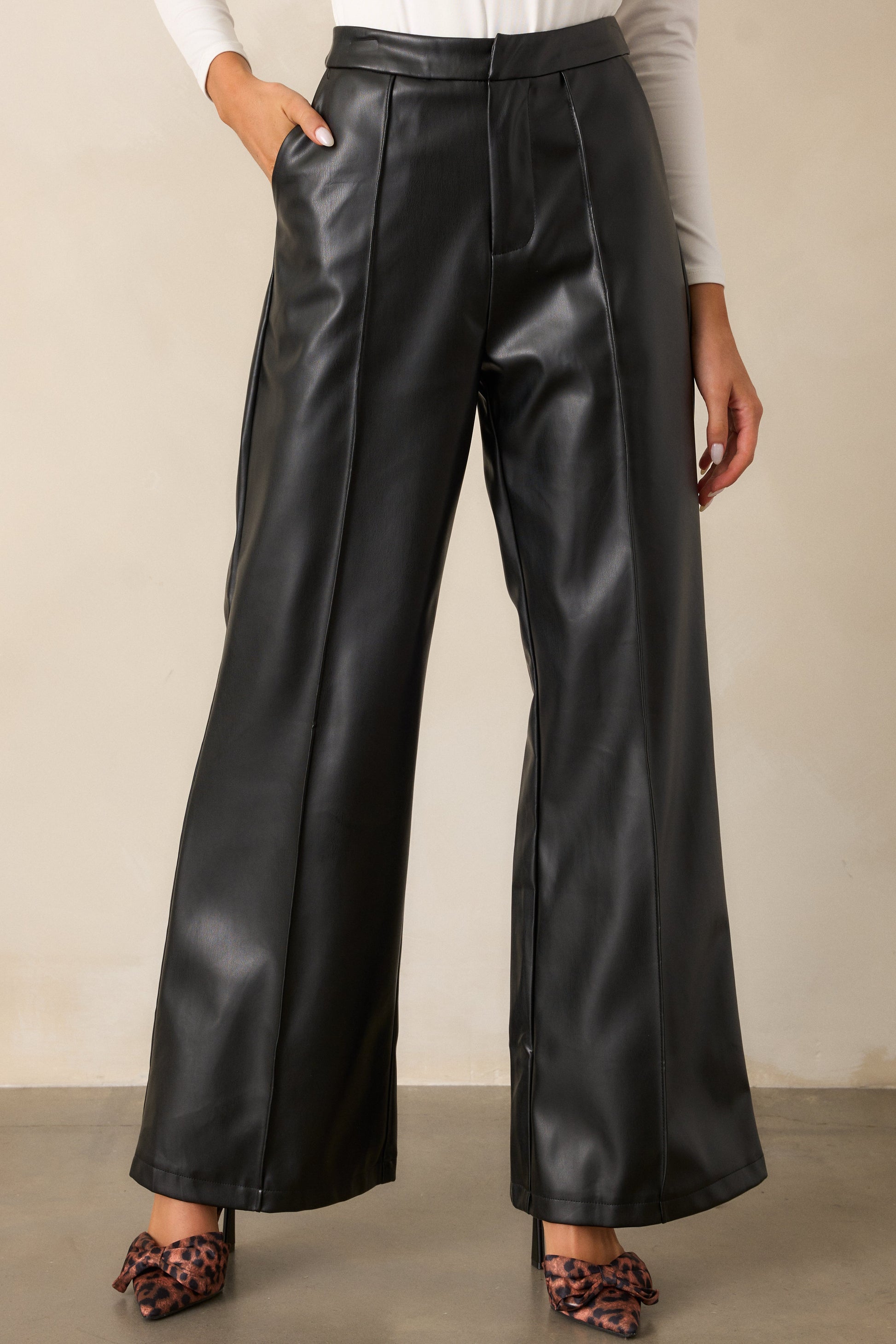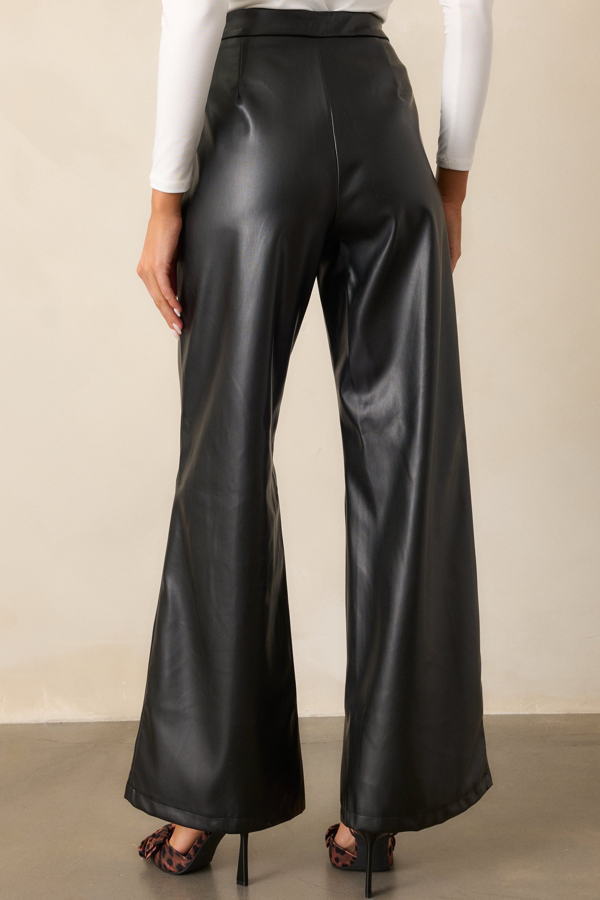 Upgrade your wardrobe with our Back And Better Black Faux Leather Pants. Made with faux leather, these pants are both stylish and comfortable. Perfect for a night out or a day at the office, these pants will elevate any outfit. Say goodbye to boring pants and hello to fashion-forward style. These pants feature a high rise, a zipper and hook and eye closure, functional pockets at the hips, a wide leg, and a soft feel inside.