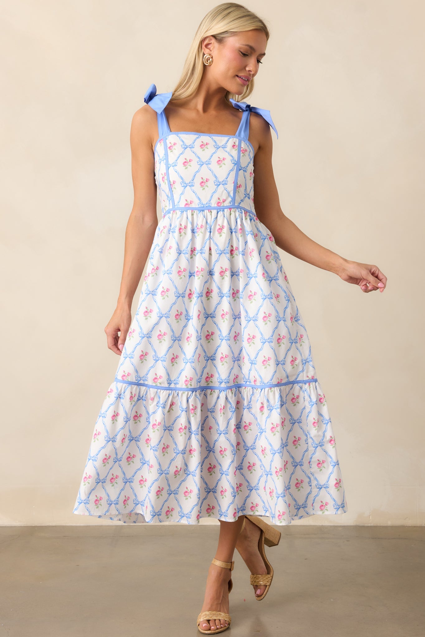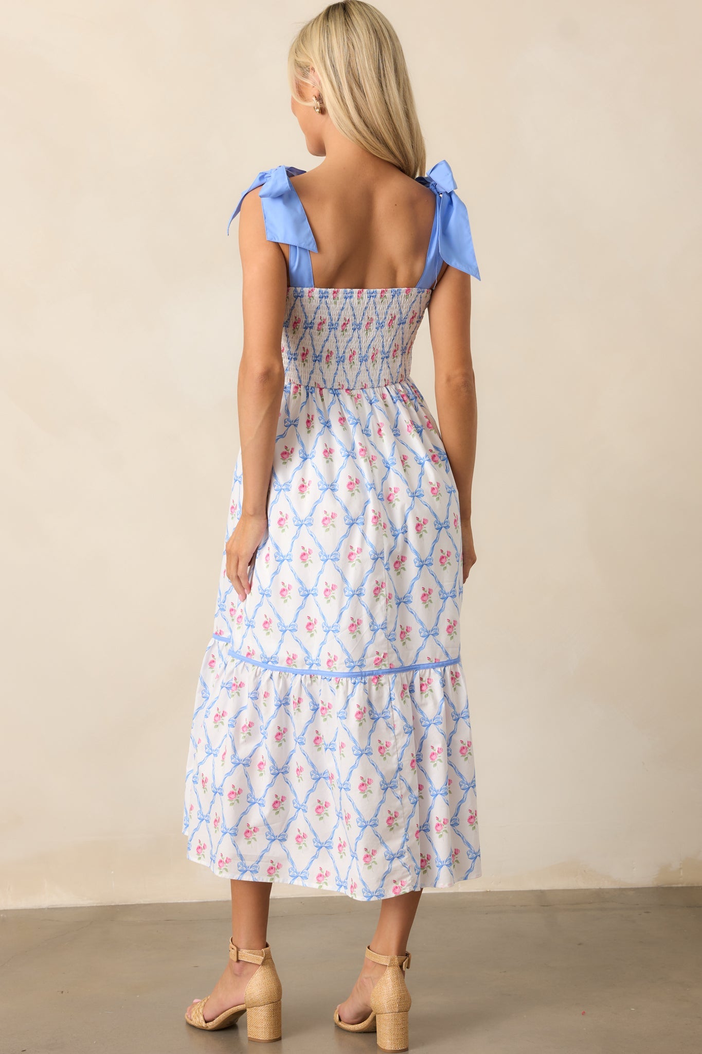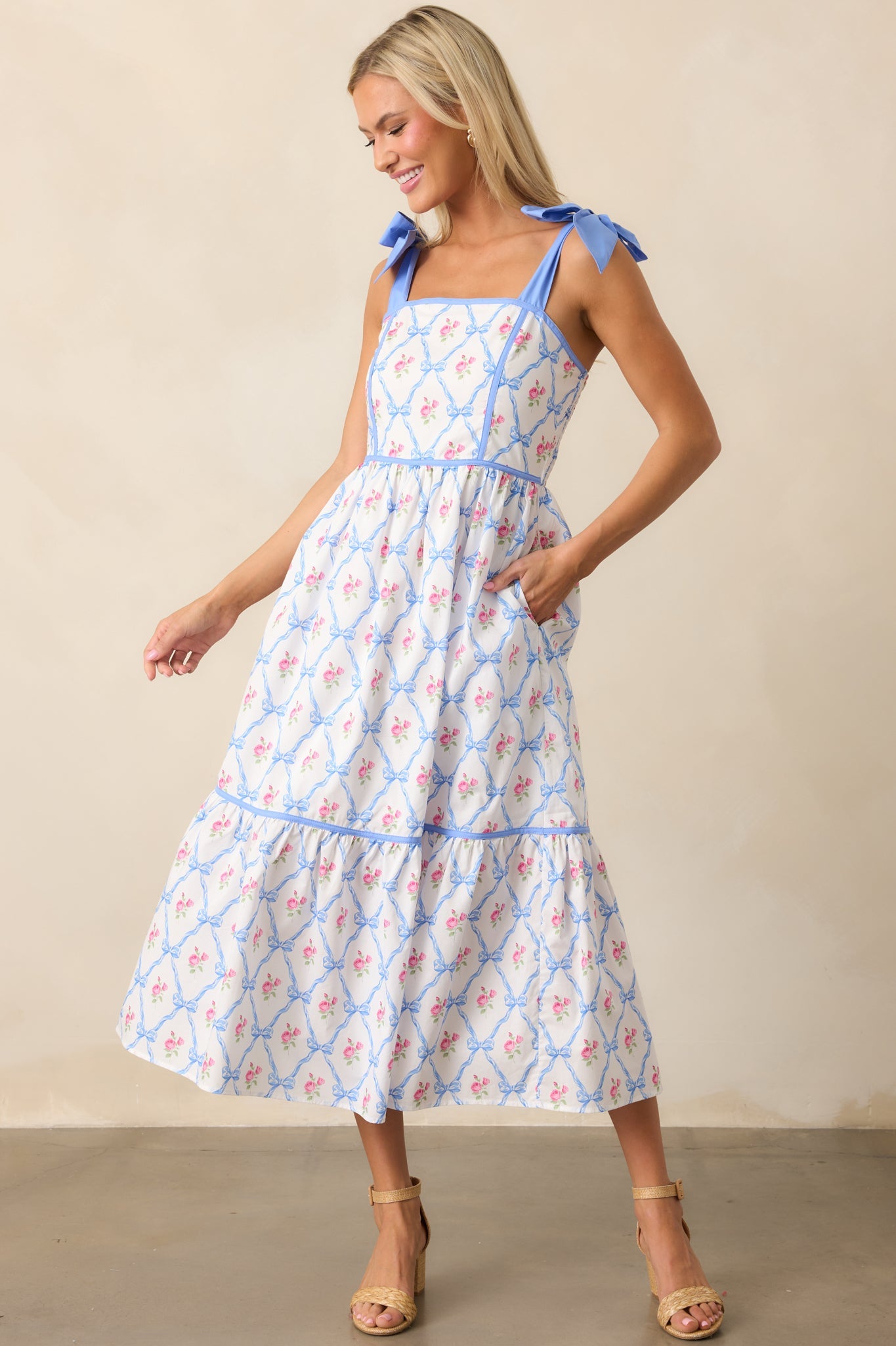 Be the star of the show in our Ballet Recital Cotton Blue Bow Midi Dress! Made with soft, breathable cotton, this dress is perfect for twirling on stage. The elegant blue bow adds a touch of whimsy to the classic midi silhouette. Shine bright and feel confident in this stunning dress! This blue dress features self tie blue ribbon straps, a square neckline, smocked back detailing, functional pockets.