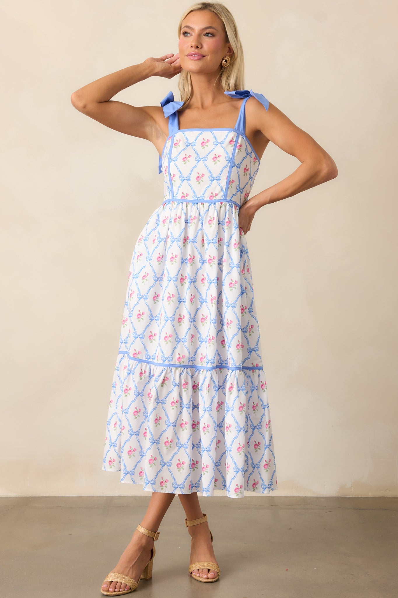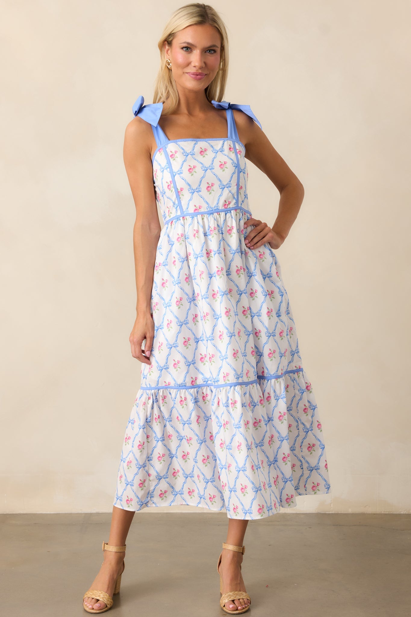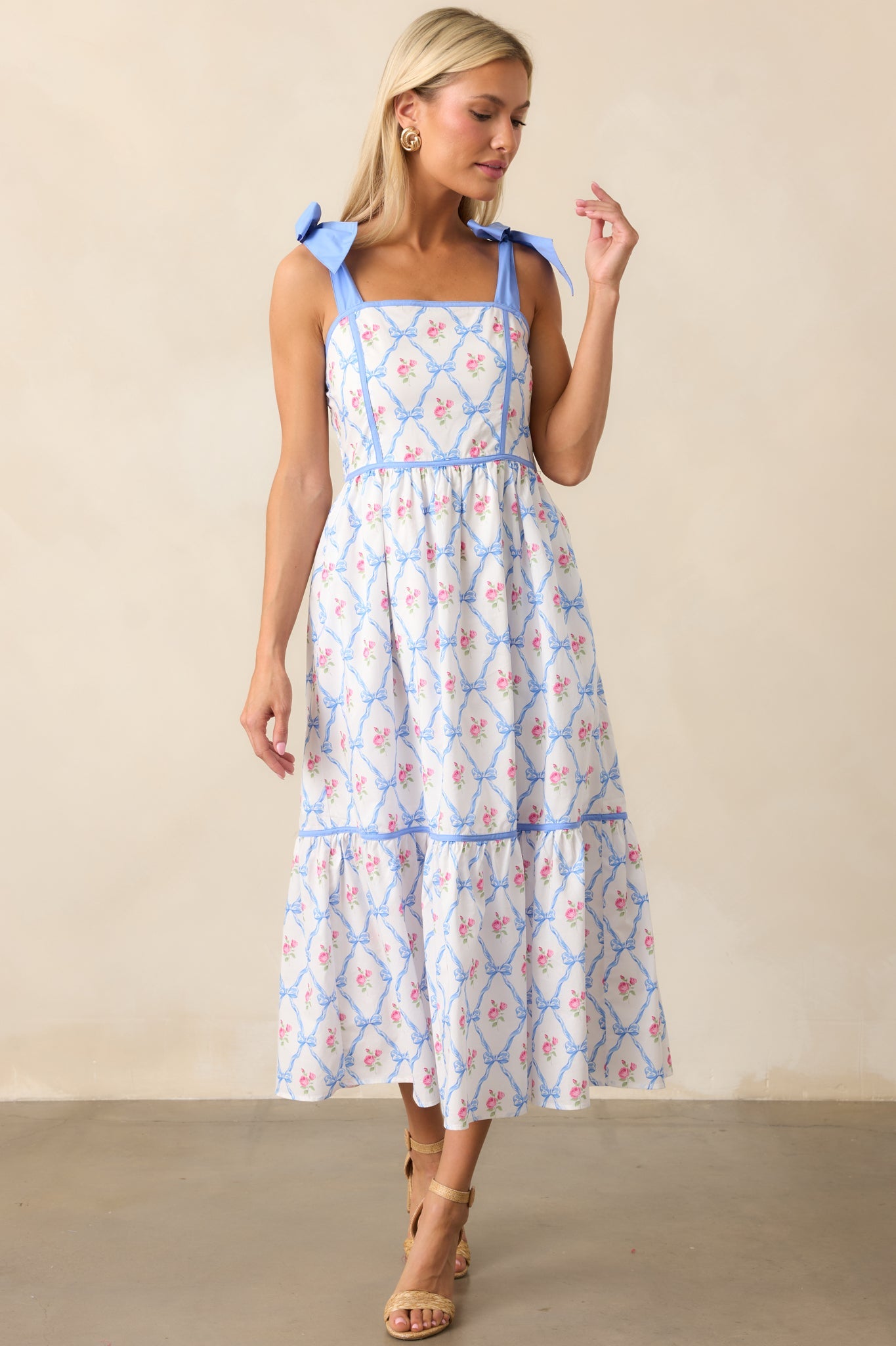 Be the star of the show in our Ballet Recital Cotton Blue Bow Midi Dress! Made with soft, breathable cotton, this dress is perfect for twirling on stage. The elegant blue bow adds a touch of whimsy to the classic midi silhouette. Shine bright and feel confident in this stunning dress! This blue dress features self tie blue ribbon straps, a square neckline, smocked back detailing, functional pockets.