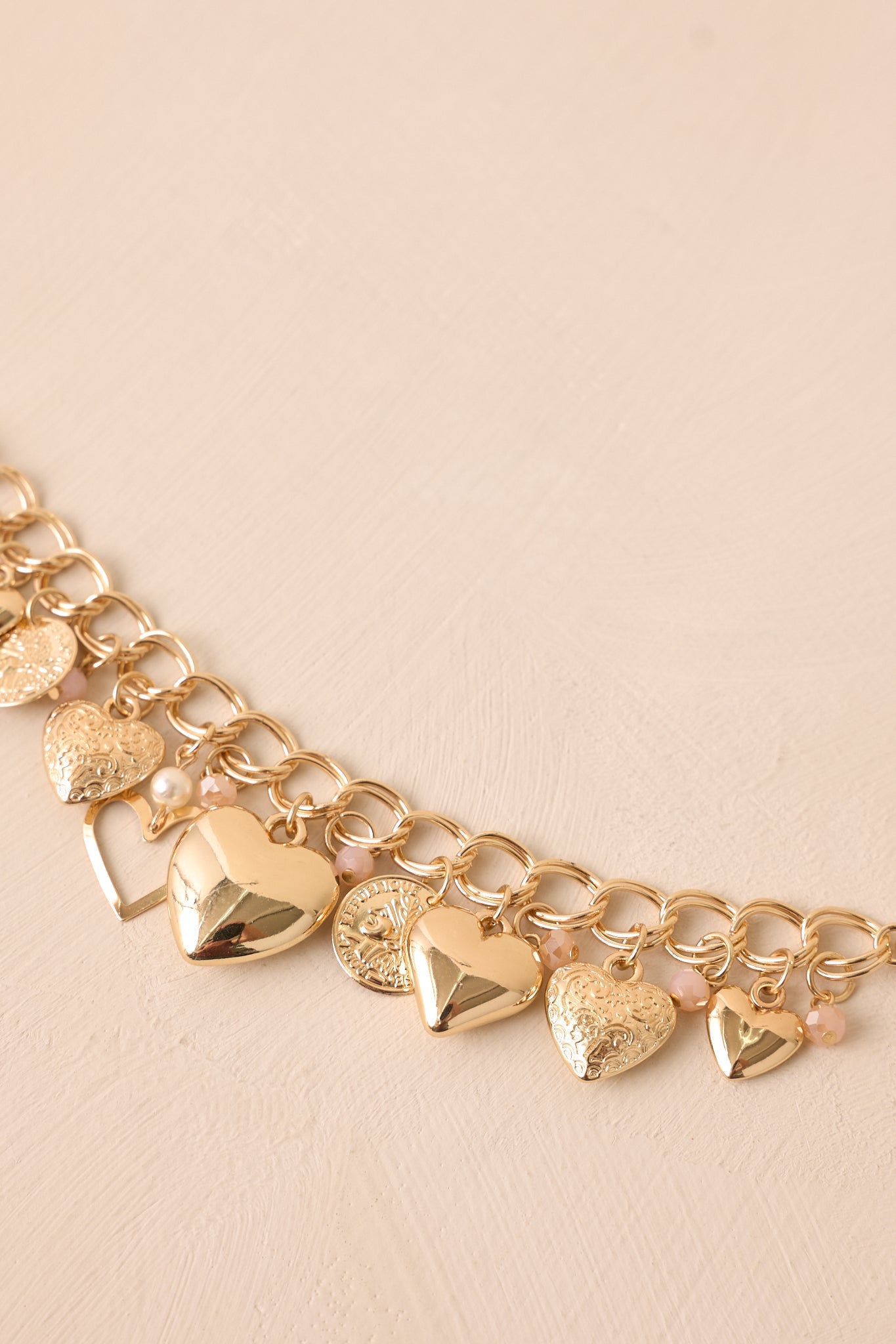 This charming Be Mine Gold Heart Charm Bracelet is the perfect way to express your love. The delicate gold heart charms adds a touch of elegance to any outfit, making it a versatile and romantic accessory. Show your special someone how much they mean to you with this beautifully crafted bracelet. This gold charm bracelet features gold hardware, a large gold chain, gold jump rings to connect the charms, varying textured and sized heart charms, small pink accent beading and a large lobster claw closure.