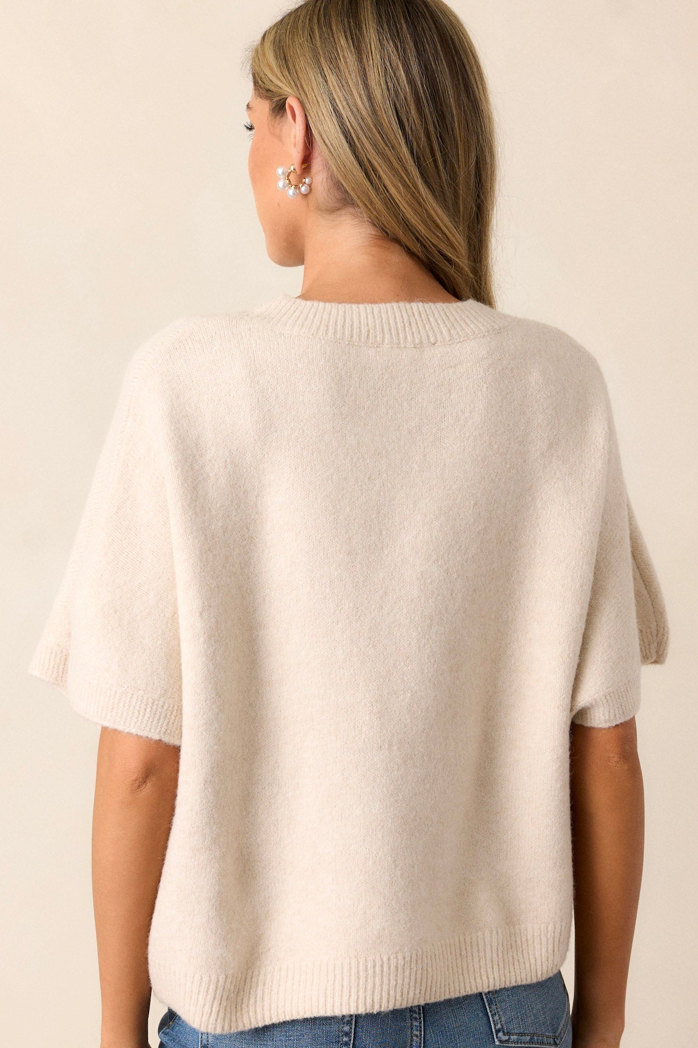 Introducing the Be The One Ecru Faux Pearl & Bow Sweater Top! This cozy sweater features beautiful faux pearl detailing and a cute bow accent. Stay warm and stylish this season with this must-have piece. Perfect for any occasion, this sweater will keep you looking and feeling your best. This ecru beige sweater features a ribbed crew neckline, faux ivory pearl and bow embellishments, a slightly cropped length, and short sleeves.
