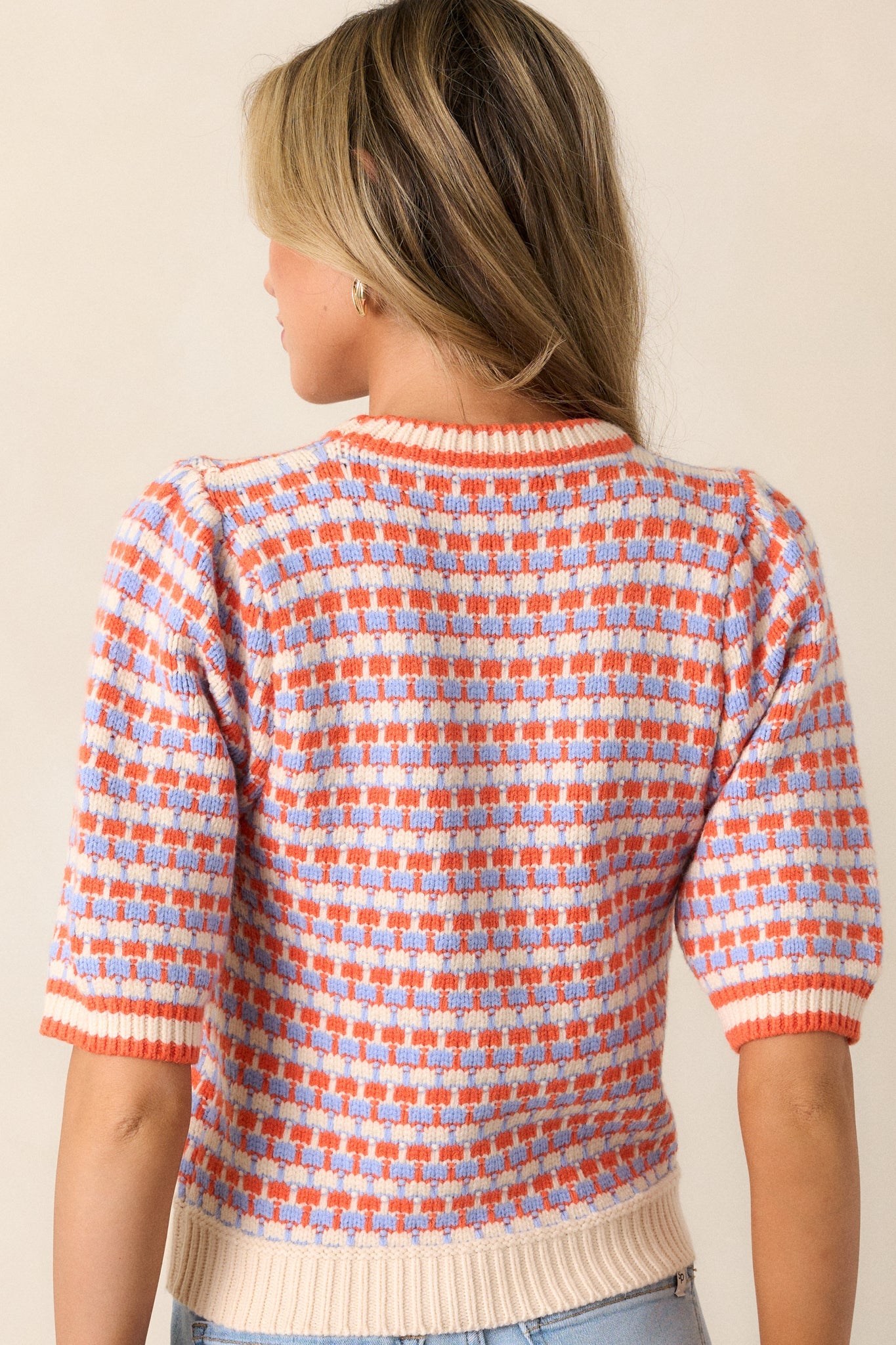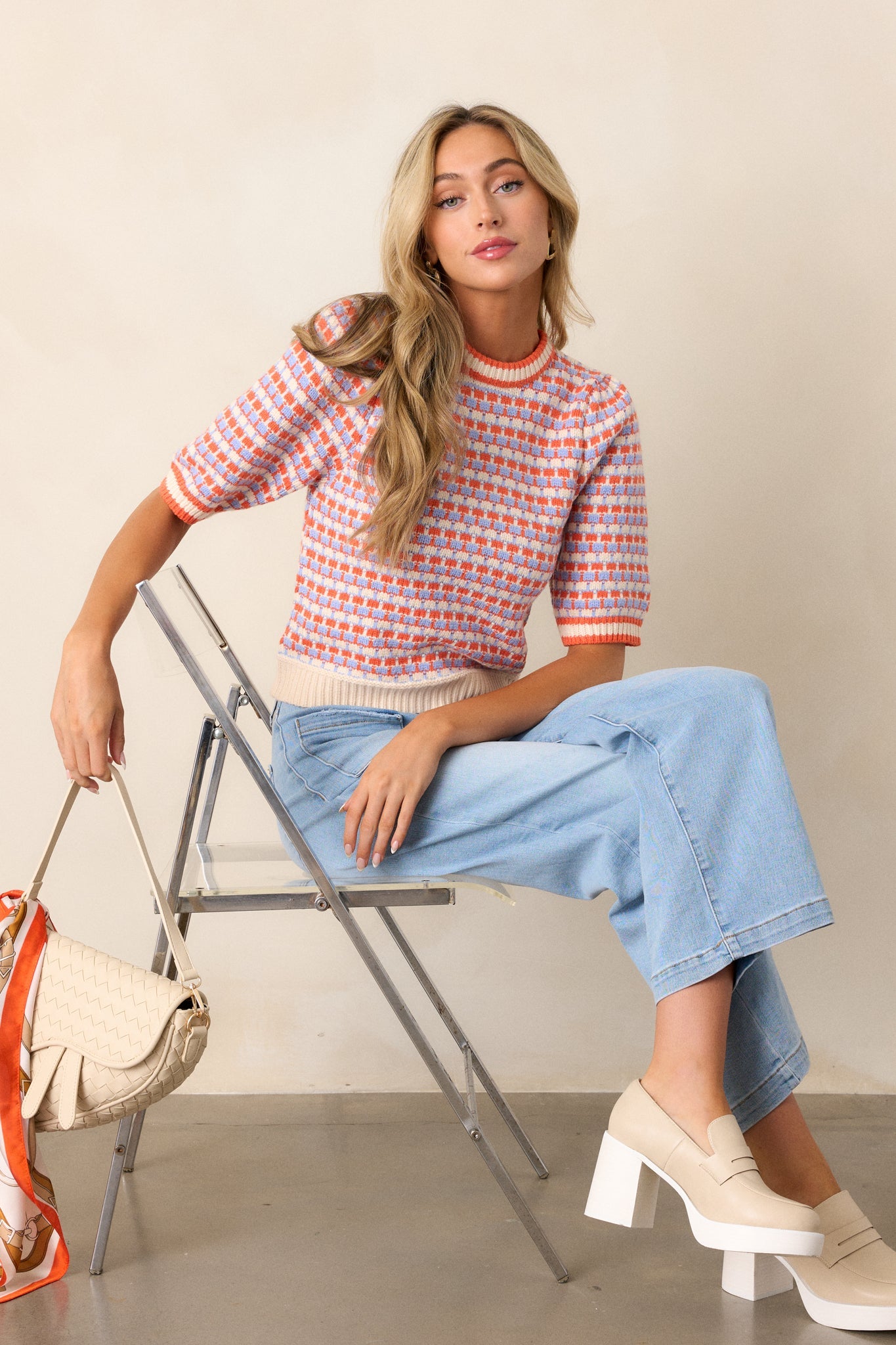 This Be There For You Ivory Stripe Knit Short-Sleeve Sweater is a perfect addition to any wardrobe. With its soft and comfortable material, it is perfect for a cozy day at home or a casual outing with friends. Its timeless design and relaxed fit will make you feel effortlessly stylish. Stay cozy and chic with this sweater by your side. This ivory stripe sweater features a ribbed high neckline, a multi color stripe design, a soft knit texture, an ivory ribbed hemline and short sleeves.