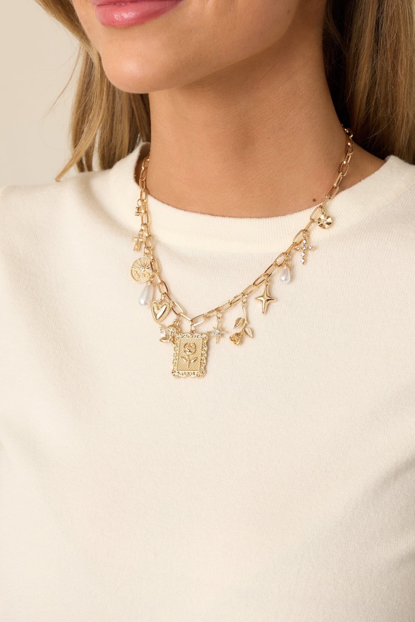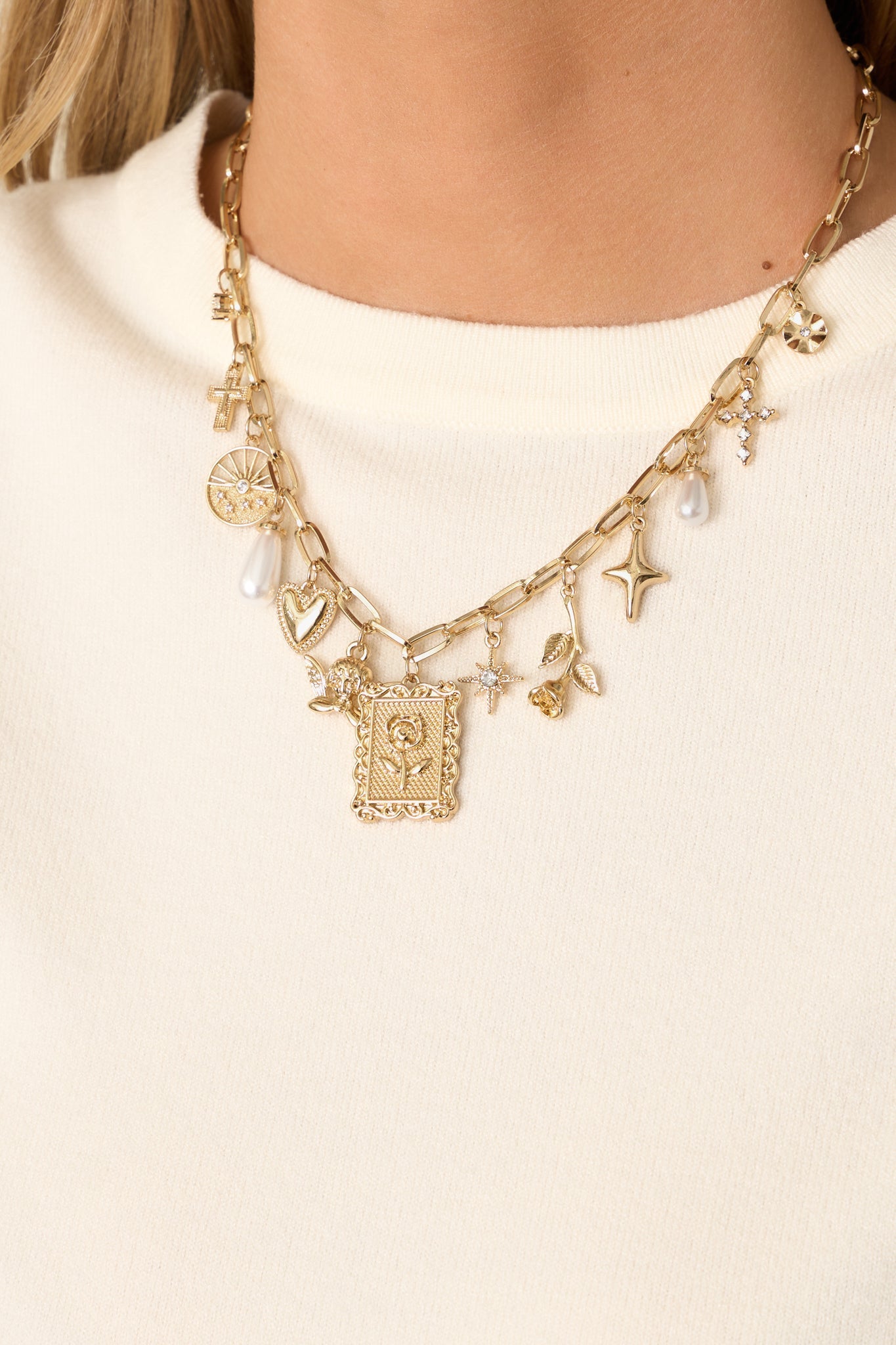 Indulge in luxury with our Beauty & Bliss Gold Rose Charm Necklace. The elegant design of the gold rose charm exudes beauty and sophistication, making it the perfect accessory for any occasion. With its adjustable chain, this necklace is versatile and can be worn with any outfit. Elevate your style with this stunning piece. This gold charm necklace features a medium sized rectangular chain, a variety of gold & ivory faux pearl charms, multiple floral charms, some star charms, two cross charms, an angel charm, two ivory faux pearl drop charms, and a lobster claw closure.