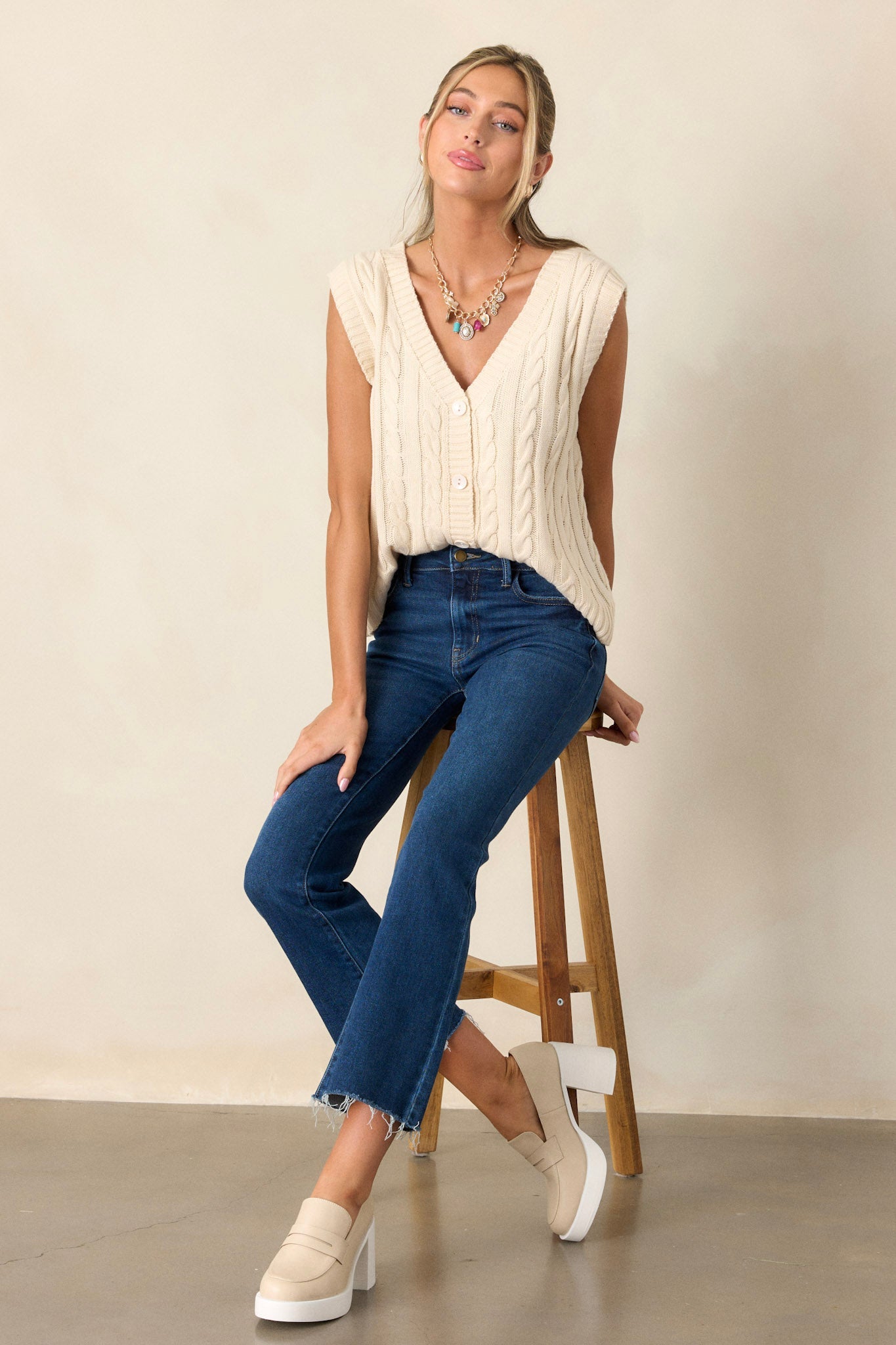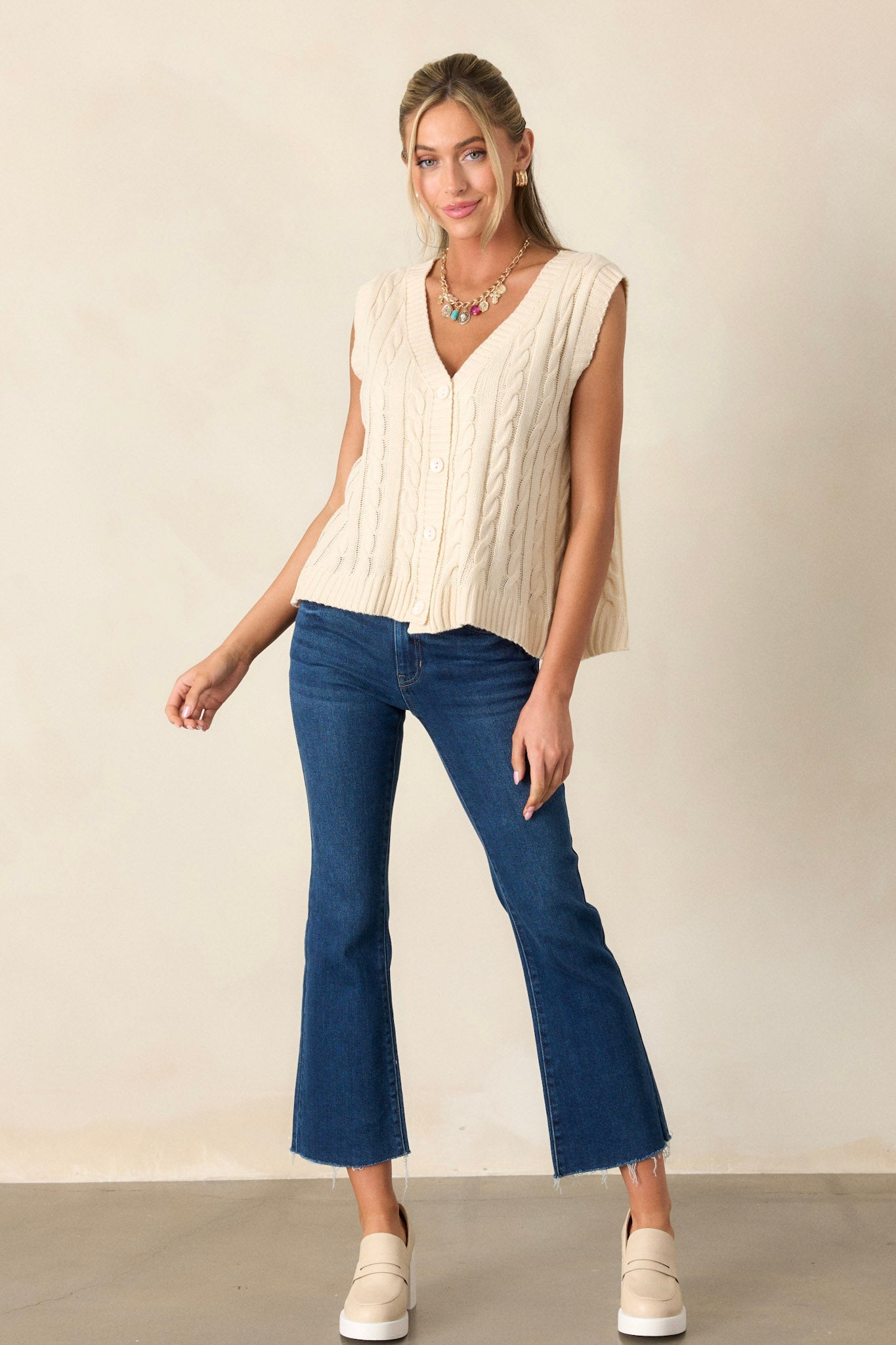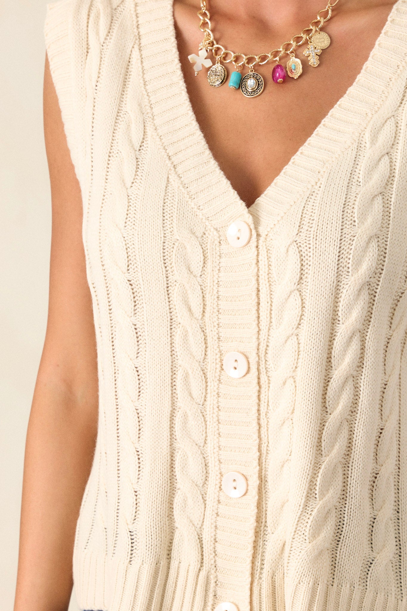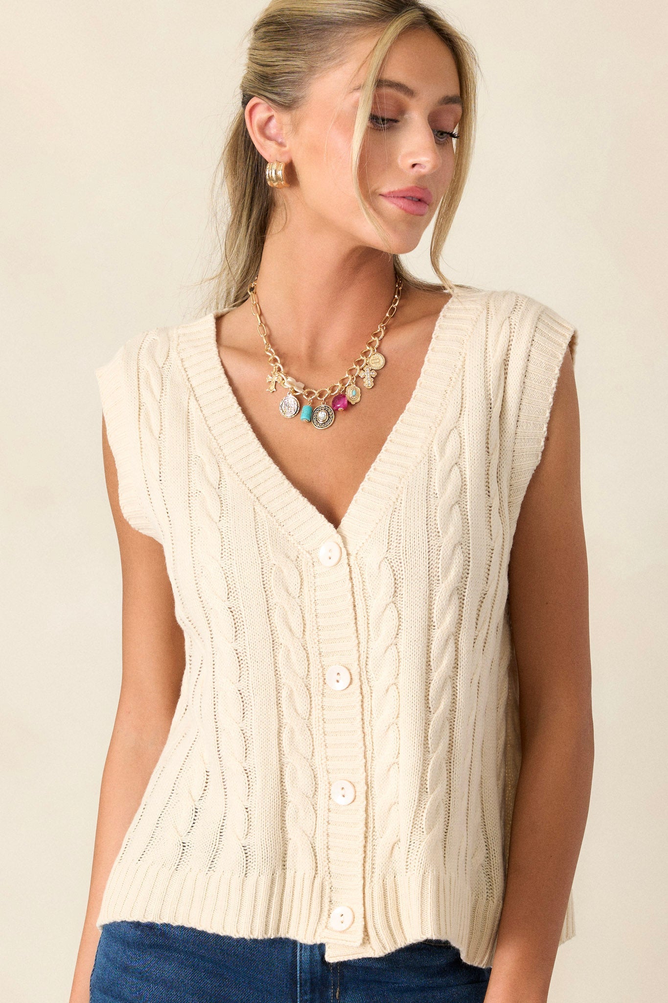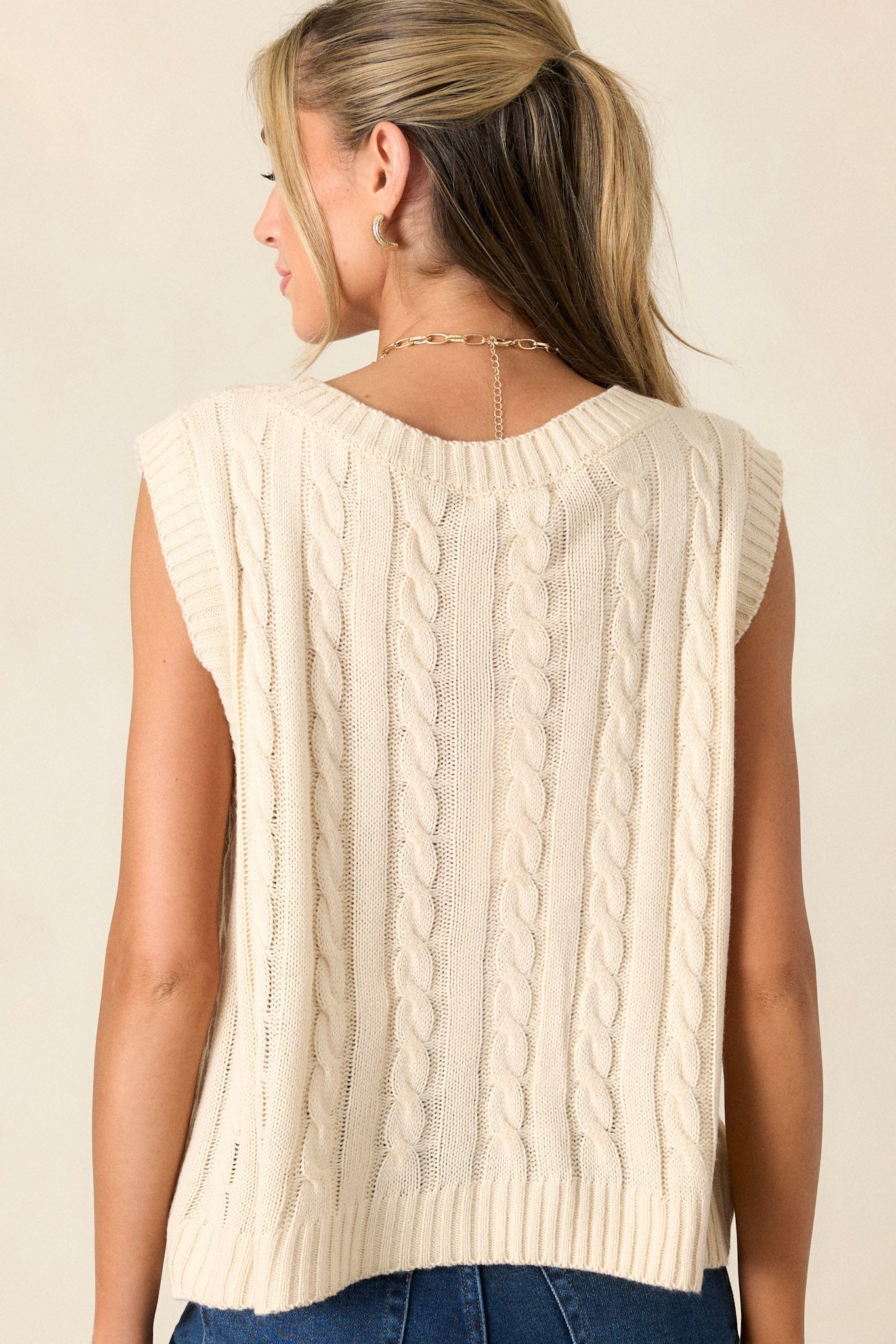 Stay cozy and stylish with our Behind Blue Eyes Light Beige Sweater Vest. Perfect for layering, this vest will keep you warm and add a touch of elegance to any outfit. With its soft material and versatile design, it's the ultimate must-have for your wardrobe. This sweater vest features a v-neckline, a cable-knit design, and a ribbed waistline.