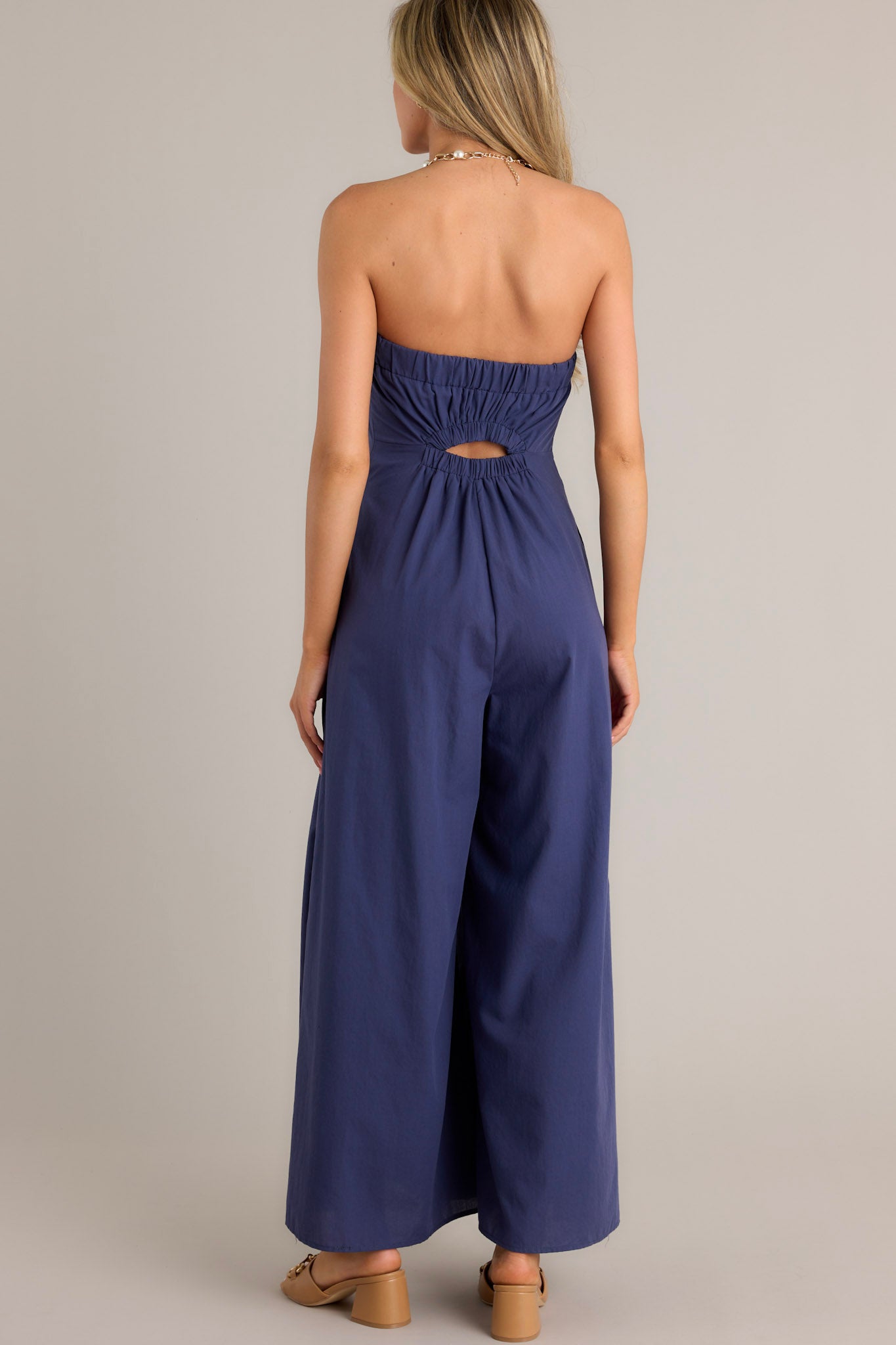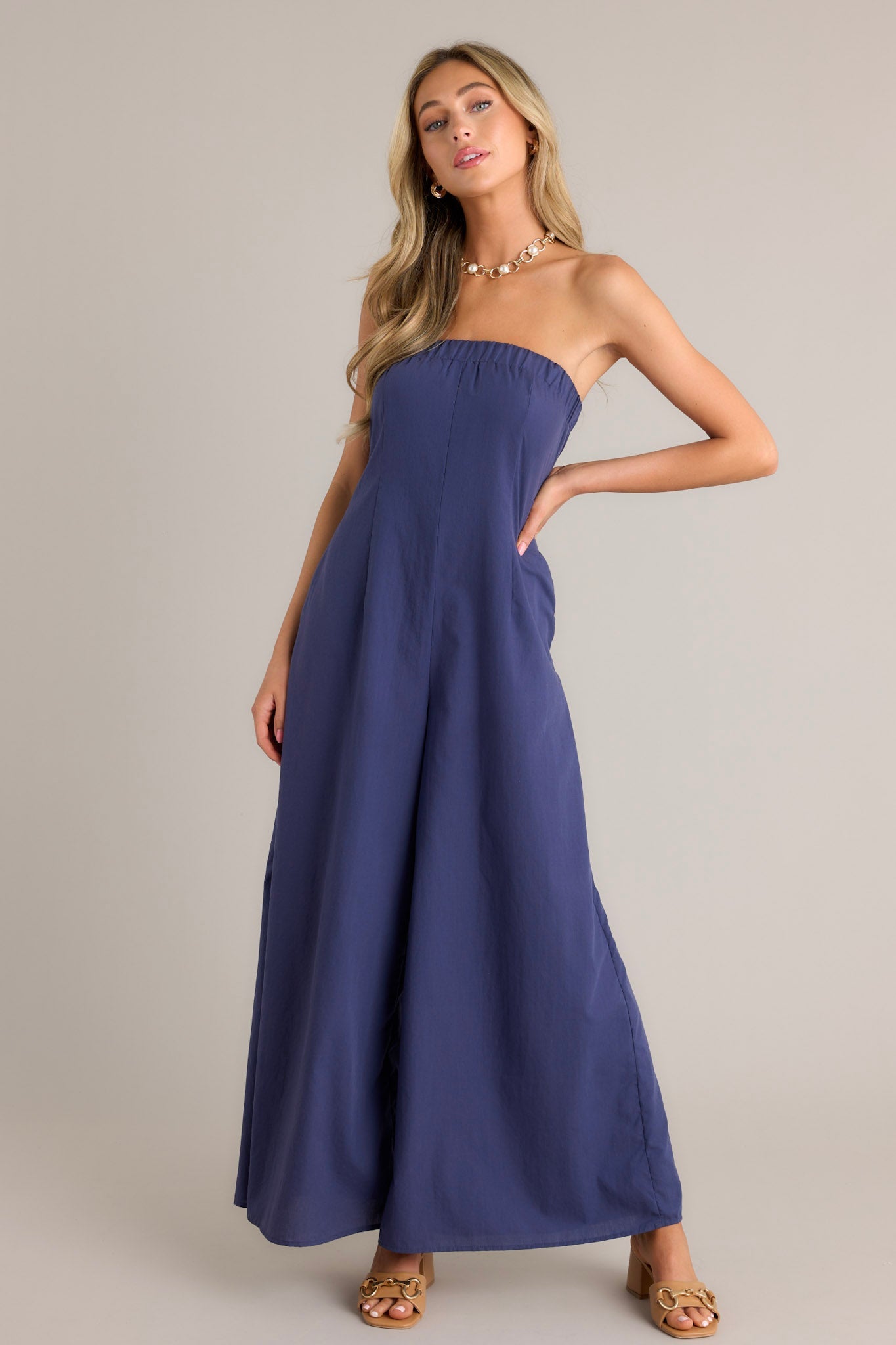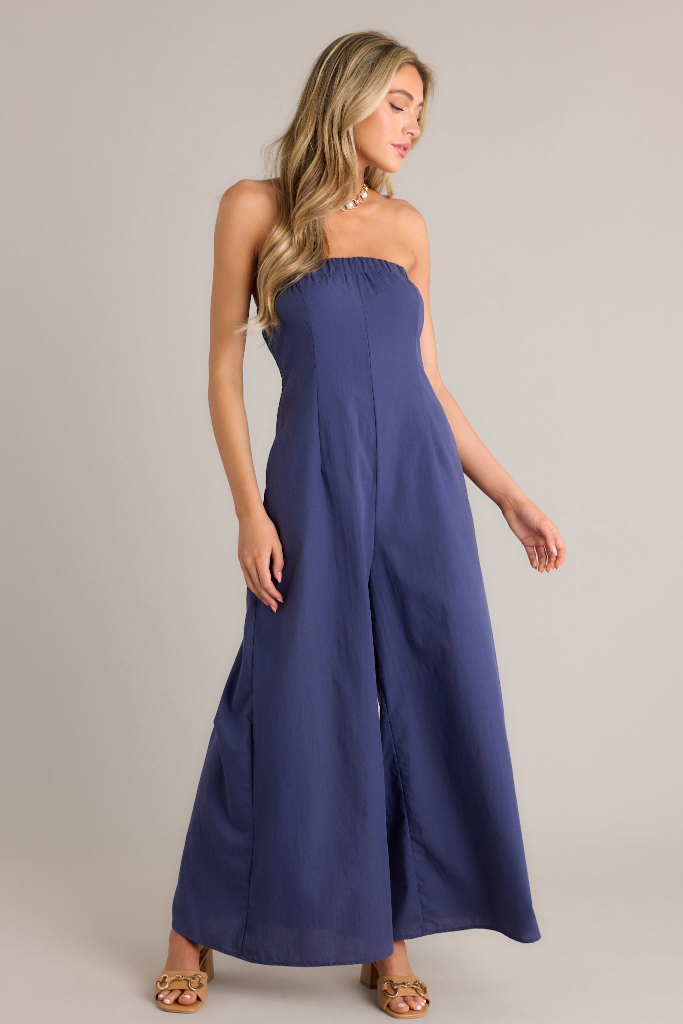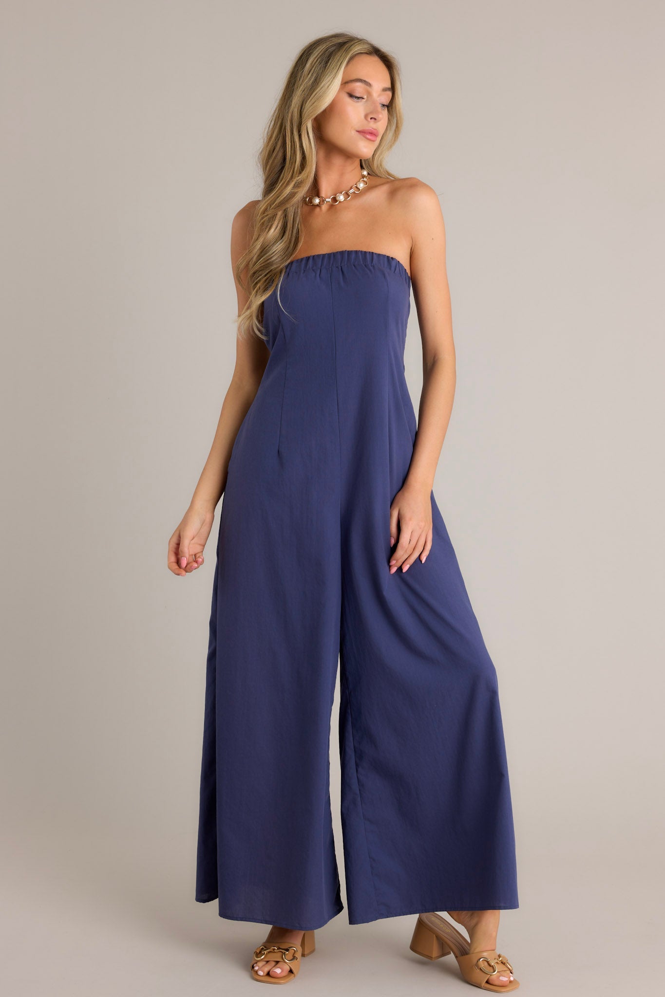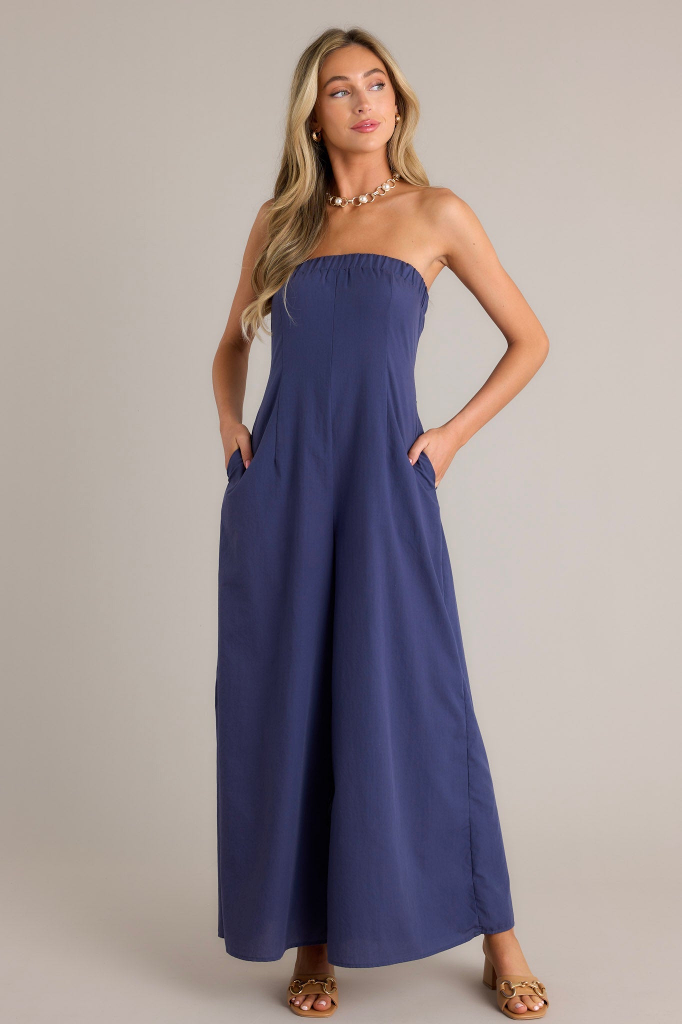 Get ready to turn heads in the Behind The Smile Navy Strapless Jumpsuit! With its flattering silhouette and trendy strapless design, this jumpsuit will bring out your playful side. The perfect statement piece for any occasion, this jumpsuit will have you smiling from ear to ear! This navy jumpsuit features an elastic strapless neckline, a discrete side zipper, an elastic cut-out in the back, functional hip pockets, and a wide leg.
