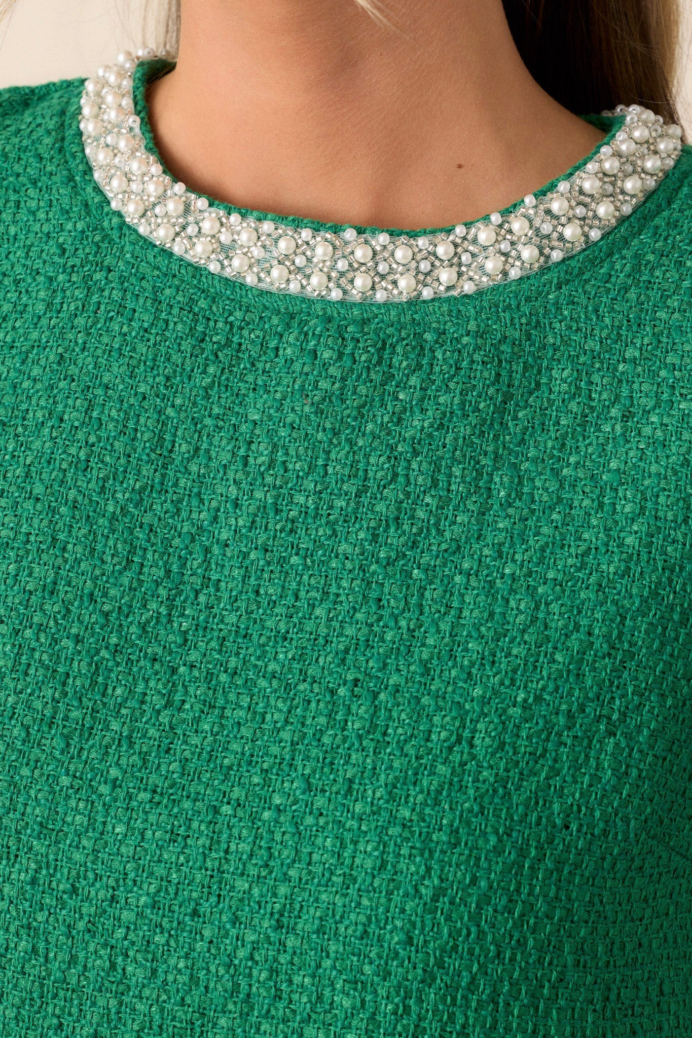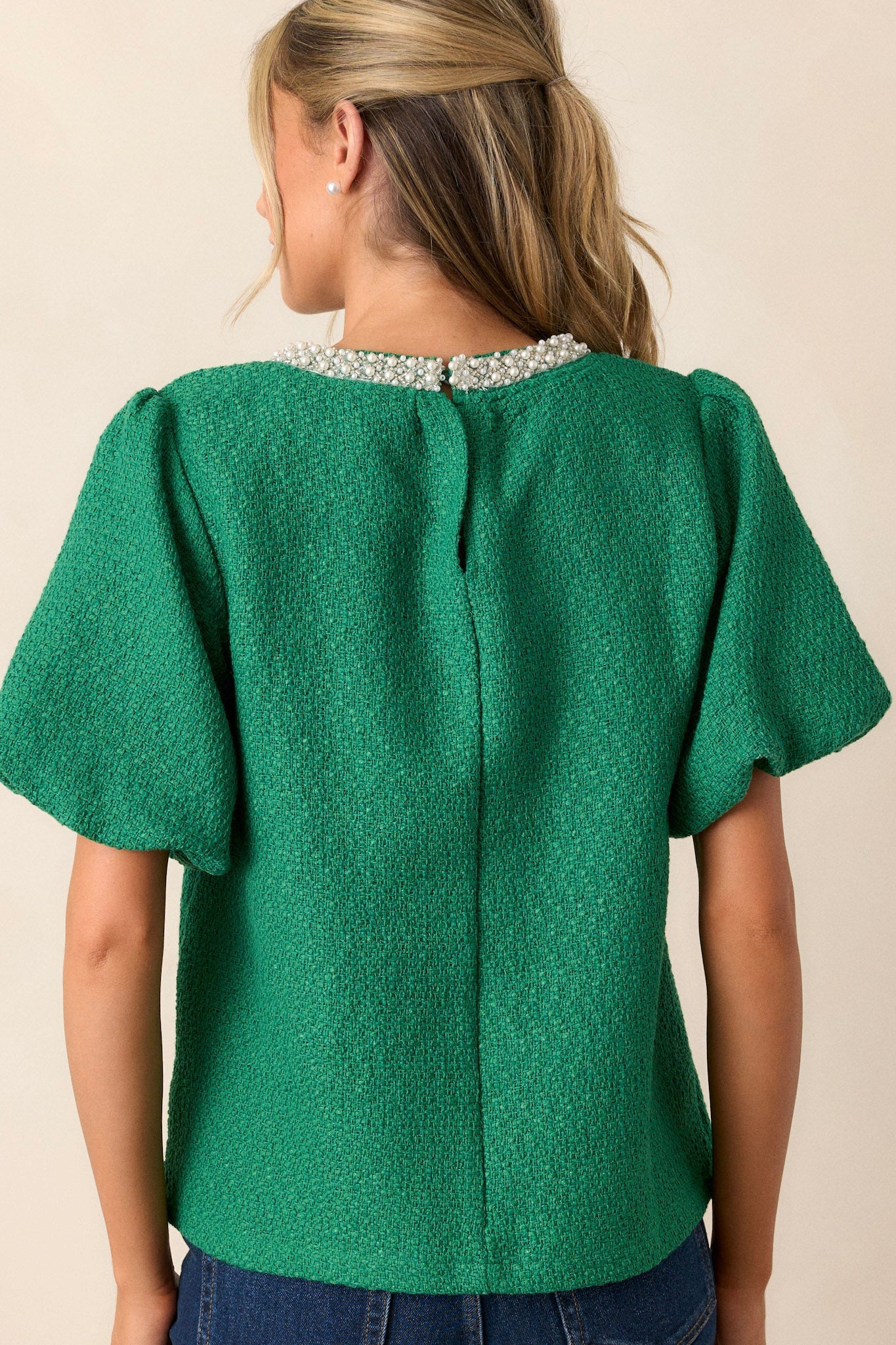 Turn heads with our Bejeweled Jade Green Bubble Sleeve Top. Perfect for adding a touch of glamour to any outfit, this top will have you feeling like a true fashionista. (Jade you look!) This unique top features a stunning jade green color and eye-catching jewel embellishments on the collar.