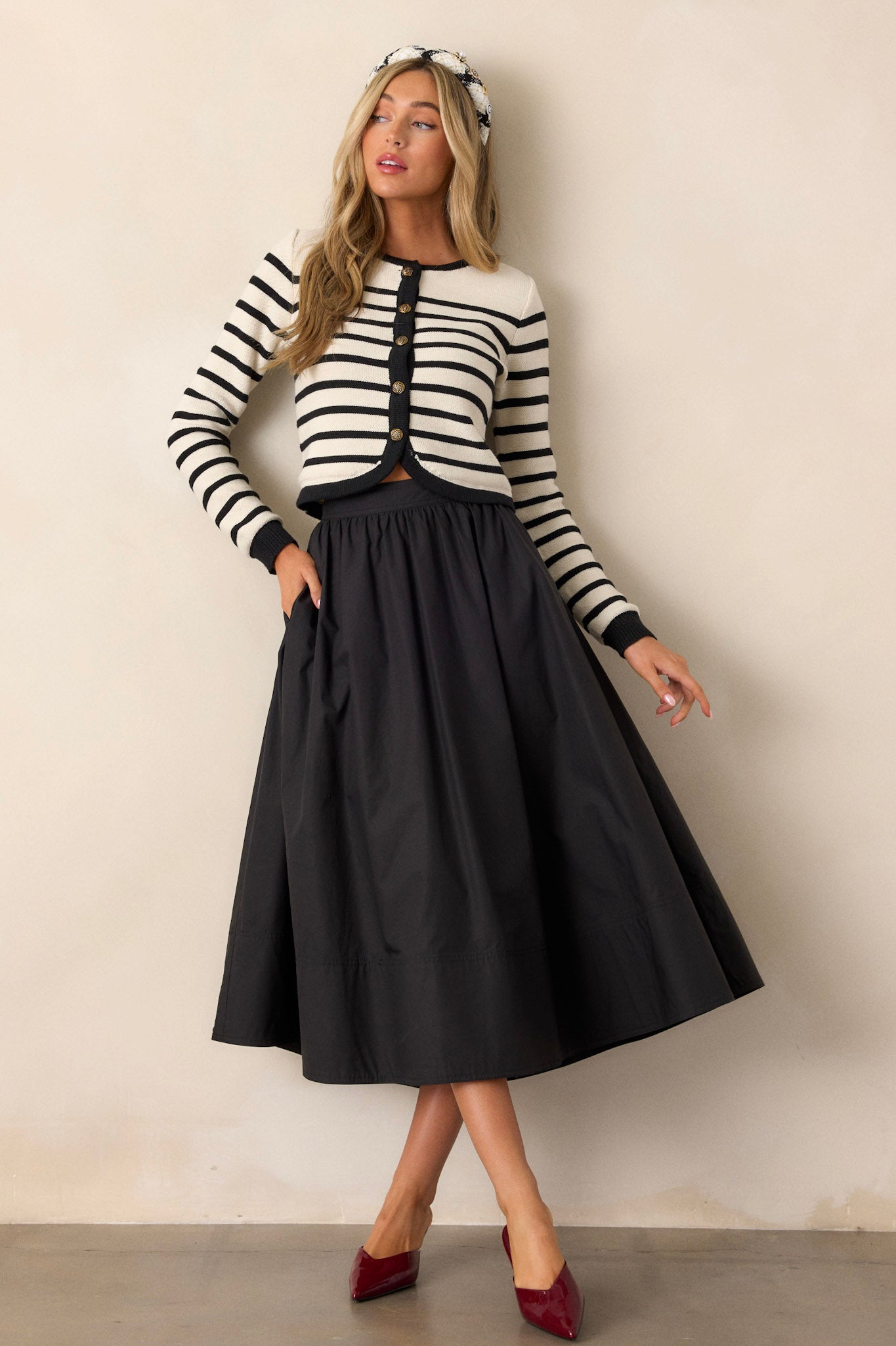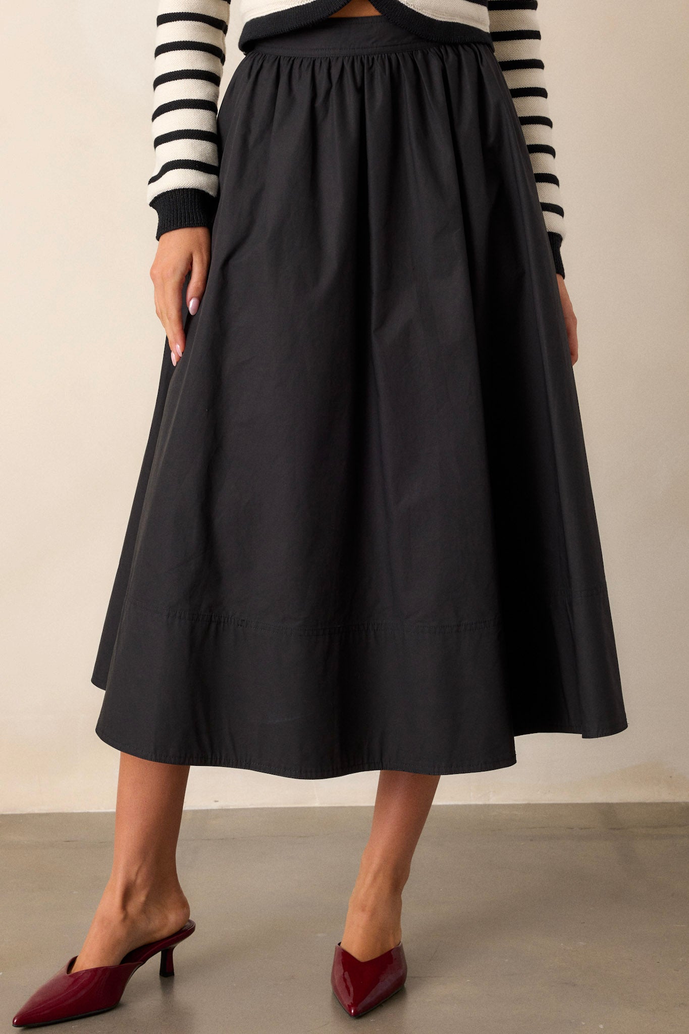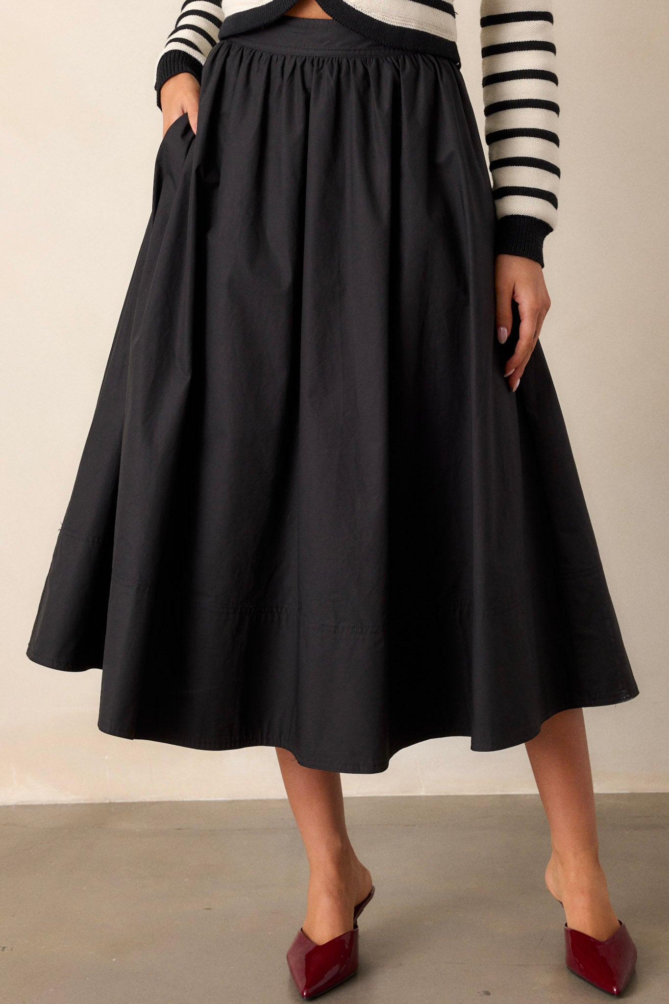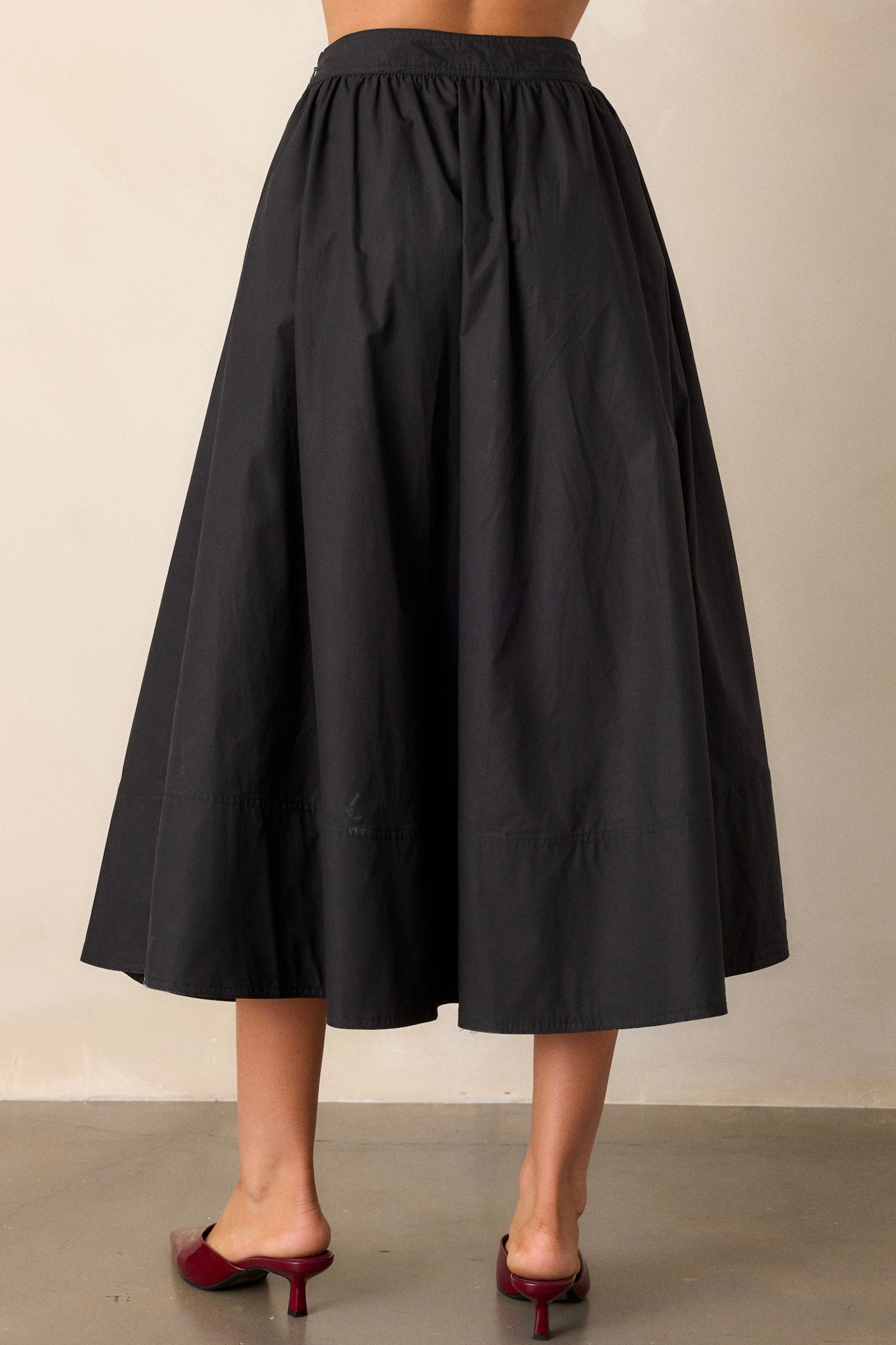 Unleash your inner fashionista with the Beneath The Surface 100% Cotton Black Midi Skirt. This versatile skirt is the perfect addition to any wardrobe, offering endless styling options. Its sleek black design adds a touch of edginess to any outfit, while its midi length provides the perfect balance of comfort and style. Say goodbye to boring outfits and hello to effortless chic with this must-have skirt. This black 100% cotton midi skirt features a high waisted design, a discrete side zipper, functional hip pockets, and a thick hemline.