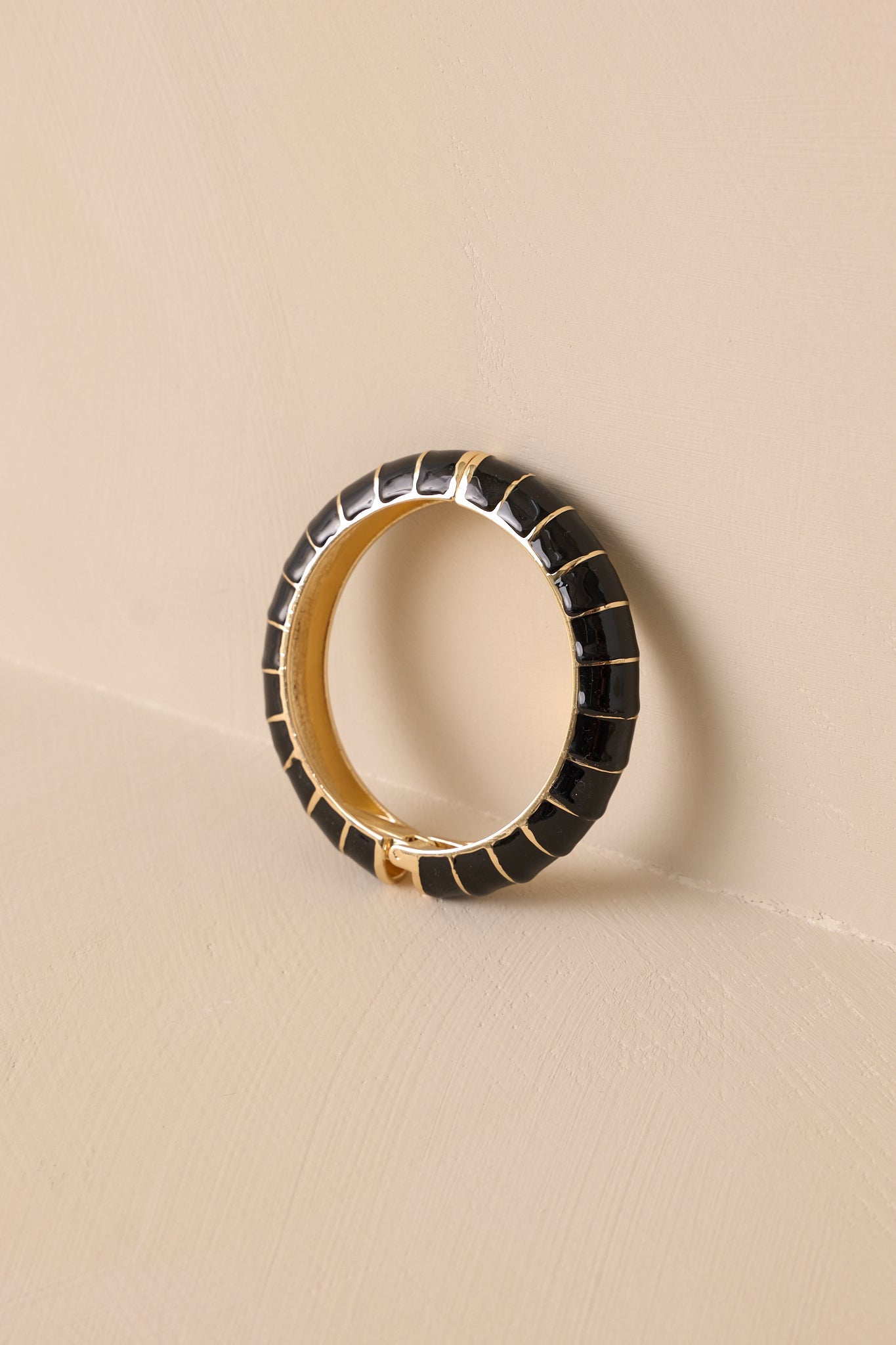 Upgrade your jewelry game with our Better Miss Me Black & Gold Hinged Bracelet. Made with high-quality materials, this bracelet adds a touch of sophistication to any outfit. The hinged design ensures a comfortable fit while its sleek black and gold color combination adds an elegant touch. This hinged bracelet features a black and gold pattern, a gold inside, and a hinge closure.
