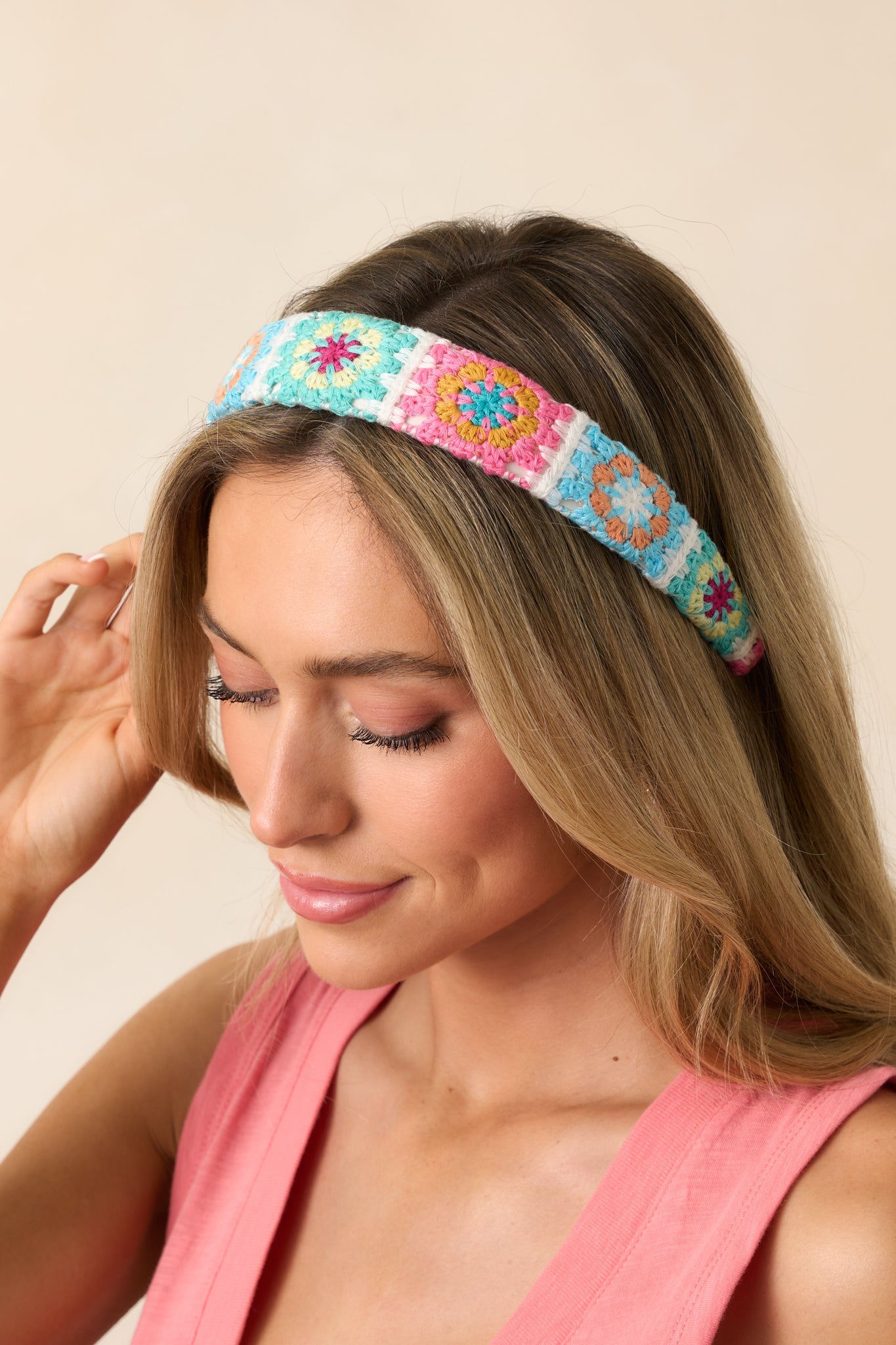 The Better Together Blue Crochet Granny Square Headband is a charming accessory that celebrates the joy of connection. It adds a playful touch to your look, reminding you that life is sweeter when shared with others. This blue headband features a multicolor crochet granny square design, a white headband base, and a classic headband shape.