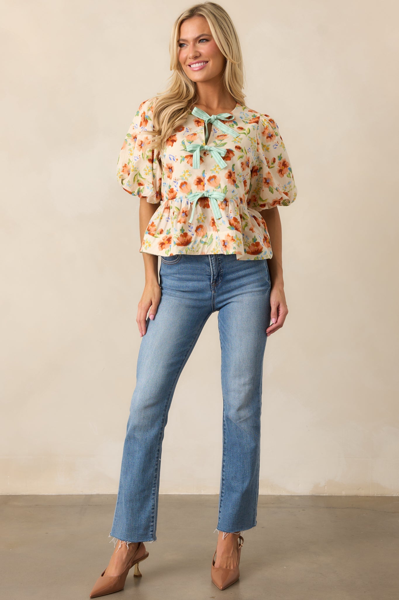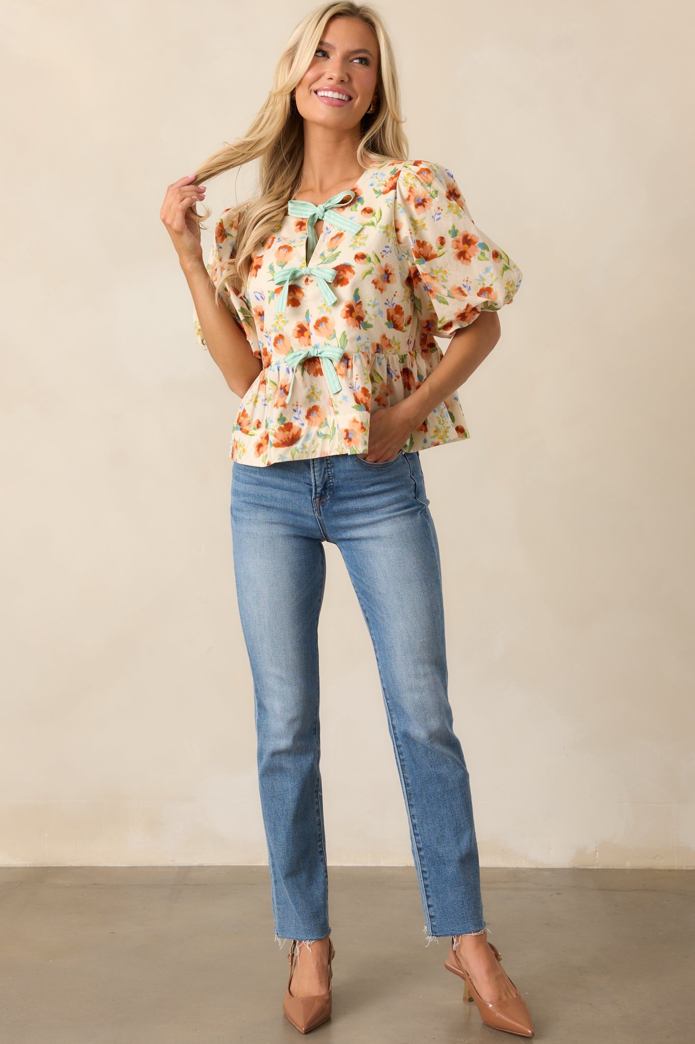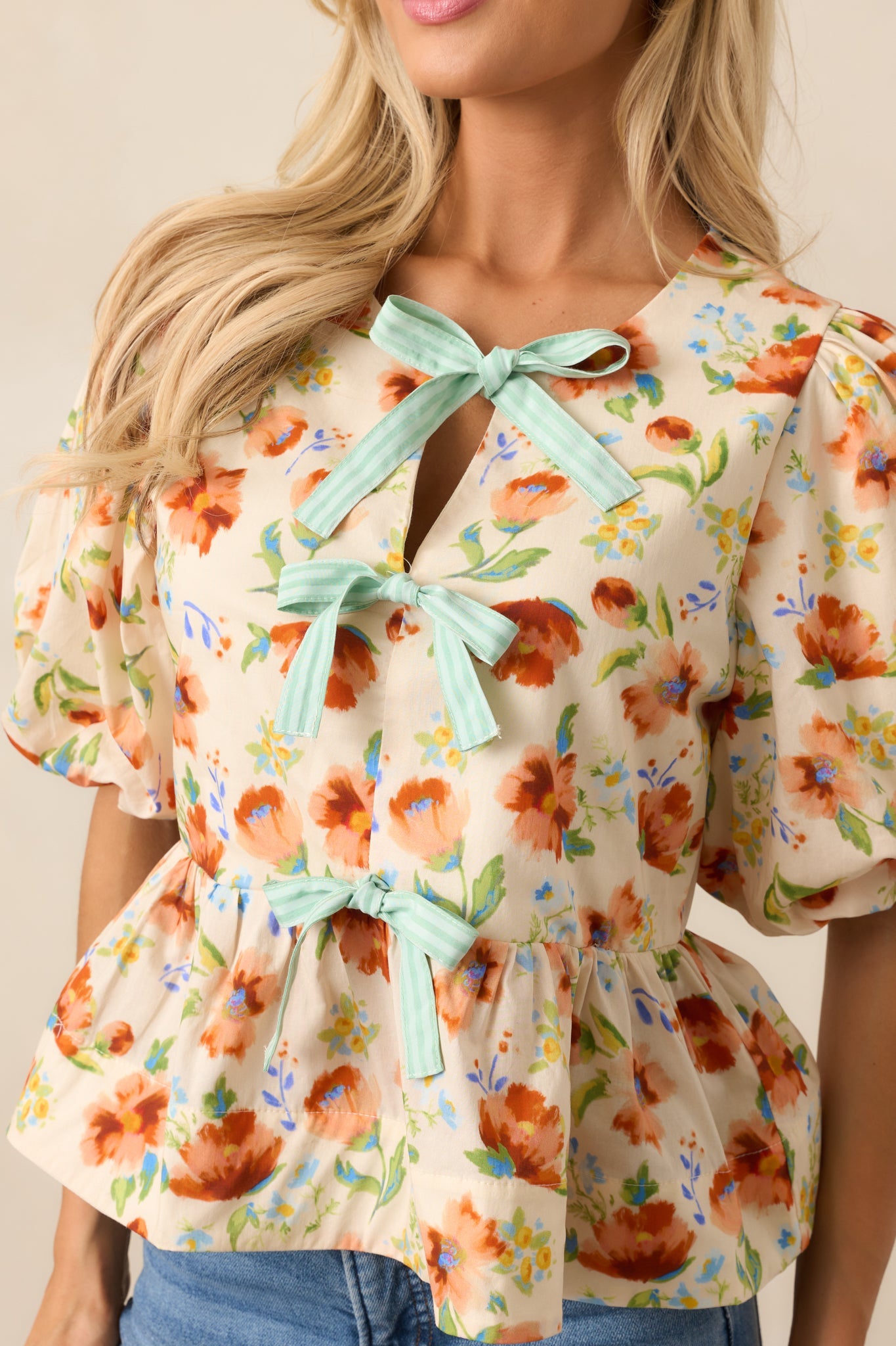 The Beyond Compare Ecru Floral Cotton Bow Front Peplum Top is a true standout. It's a charming choice for those who appreciate the beauty of being one-of-a-kind, with a unique charm that sets you apart from the rest. This ecru beige top features a round neckline, self-tie monochrome green stripe bow front, short puff sleeves with elastic cuffs, and a peplum silhouette.