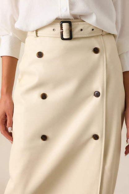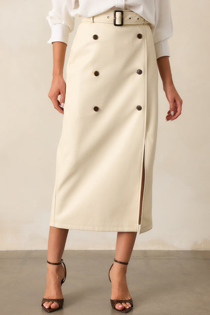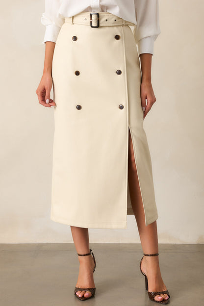 Experience elegance and comfort with our Beyond The Storm Ecru Faux Leather Midi Skirt. Made from faux leather, this skirt is perfect for any occasion. With its versatile ecru color, it can easily be dressed up or down. Stay stylish and confident, no matter what the weather may bring. This faux leather ecru midi skirt features a high waisted design, an optional belt with a tortoise shell buckle, a functional tortoise shell button front, midi length, and side slit.