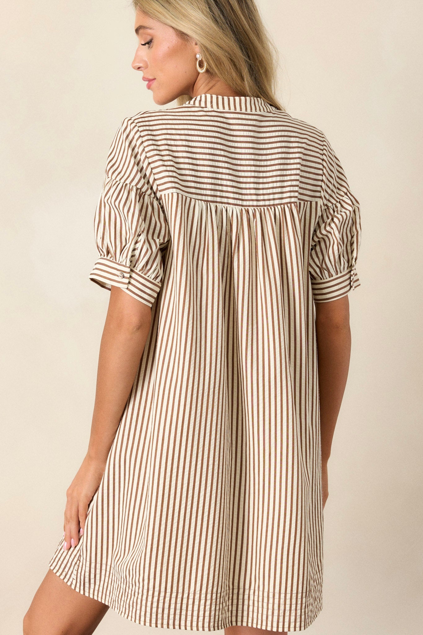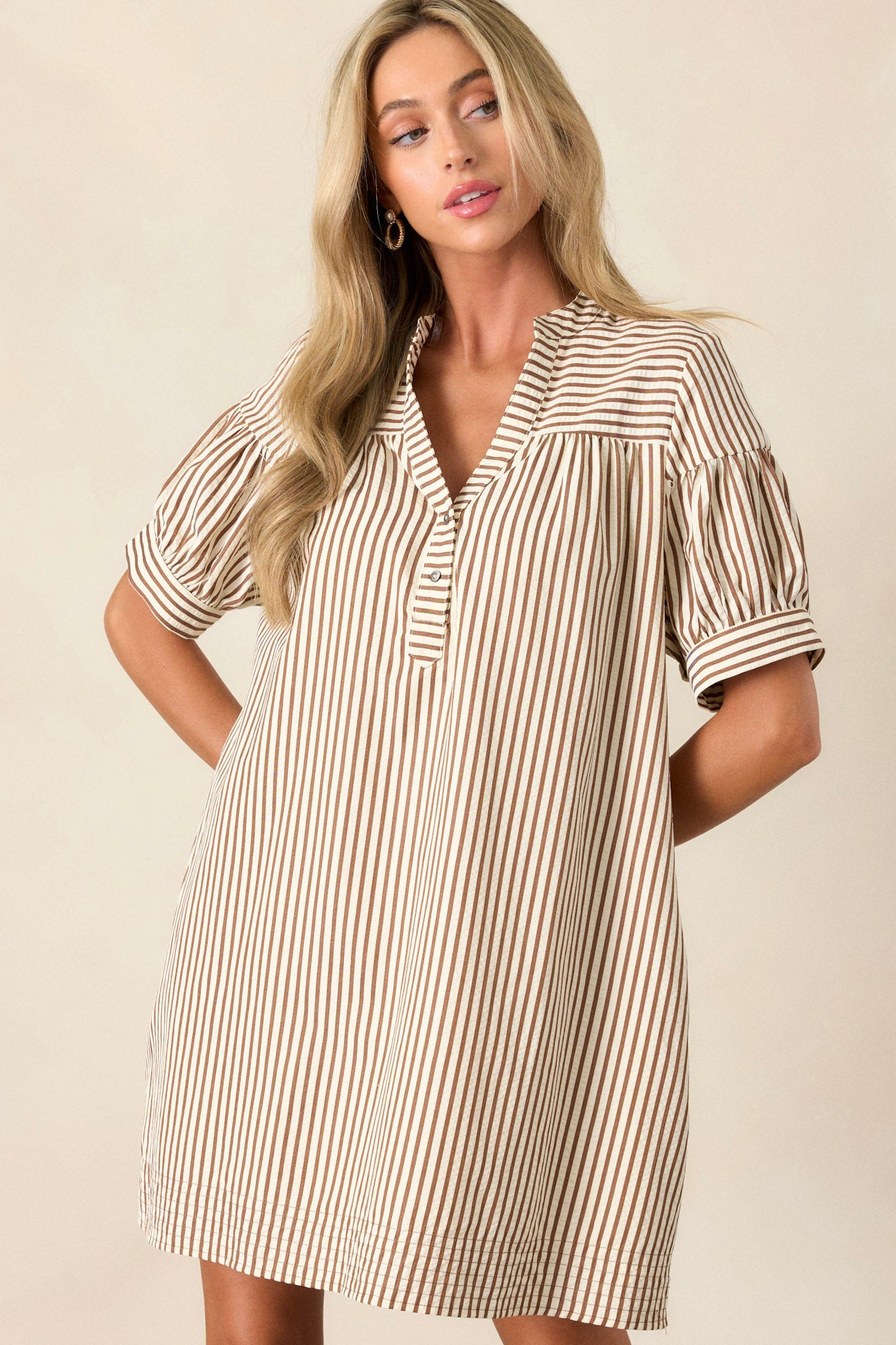 Look effortlessly chic in our Bitter Sweet Symphony Brown Stripe Mini Dress. Made with a classic brown and white stripe pattern, this dress is perfect for any casual or semi-formal occasion. The lightweight fabric and flattering silhouette provide both comfort and style. Elevate your wardrobe and feel confident in this versatile dress. This brown stripe dress features a v-neckline, a button up bust, a relaxed fit, a vertical brown and white stripe design and short sleeves.