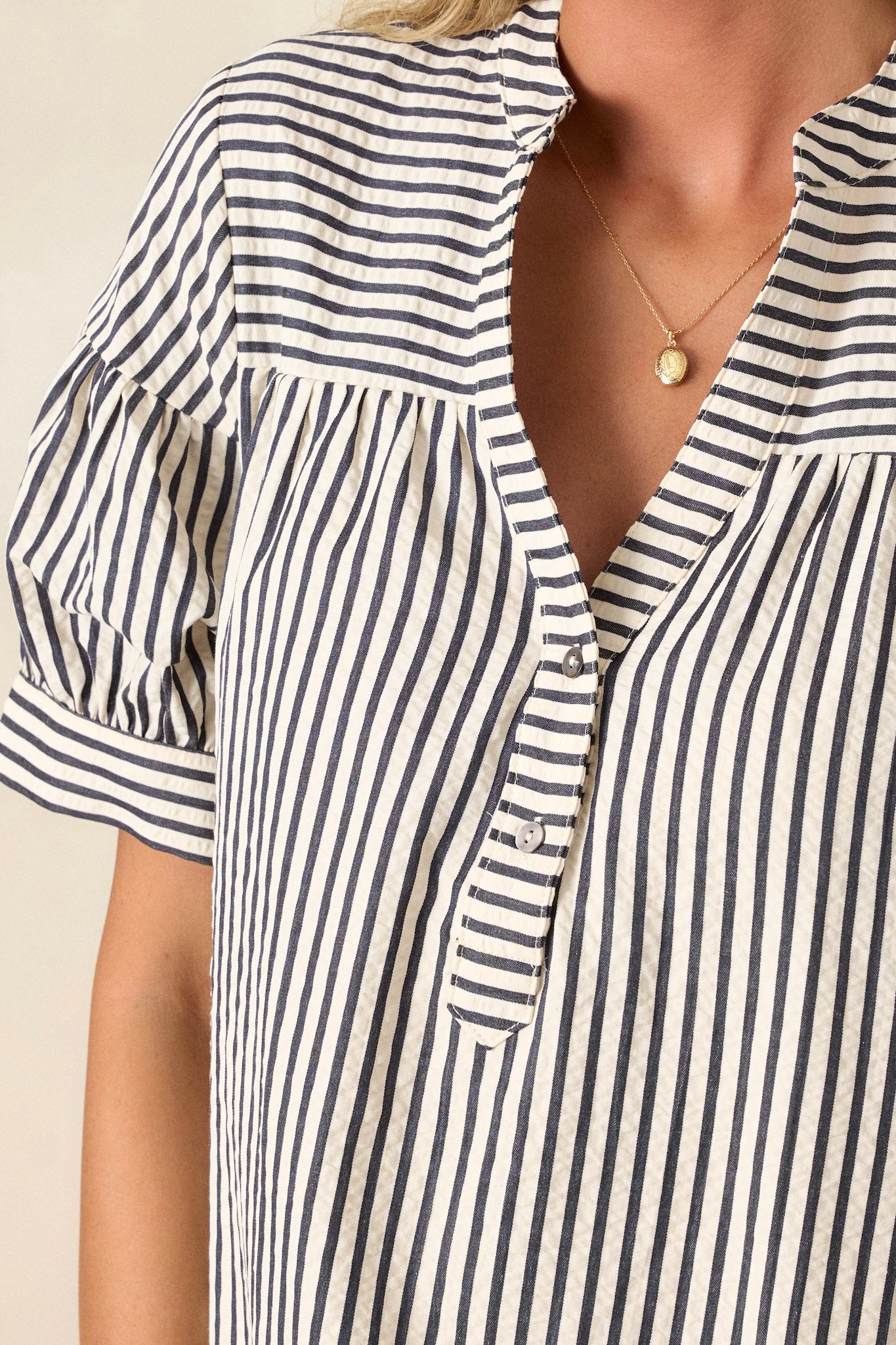 Look effortlessly chic in our Bitter Sweet Symphony Navy Stripe Mini Dress. Made with a classic navy and white stripe pattern, this dress is perfect for any casual occasion. The lightweight fabric and flattering silhouette provide both comfort and style. Elevate your wardrobe and feel confident in this versatile dress. This mini dress features a v-neckline, a button up bust, a relaxed fit, a vertical navy and white stripe design, and short sleeves.
