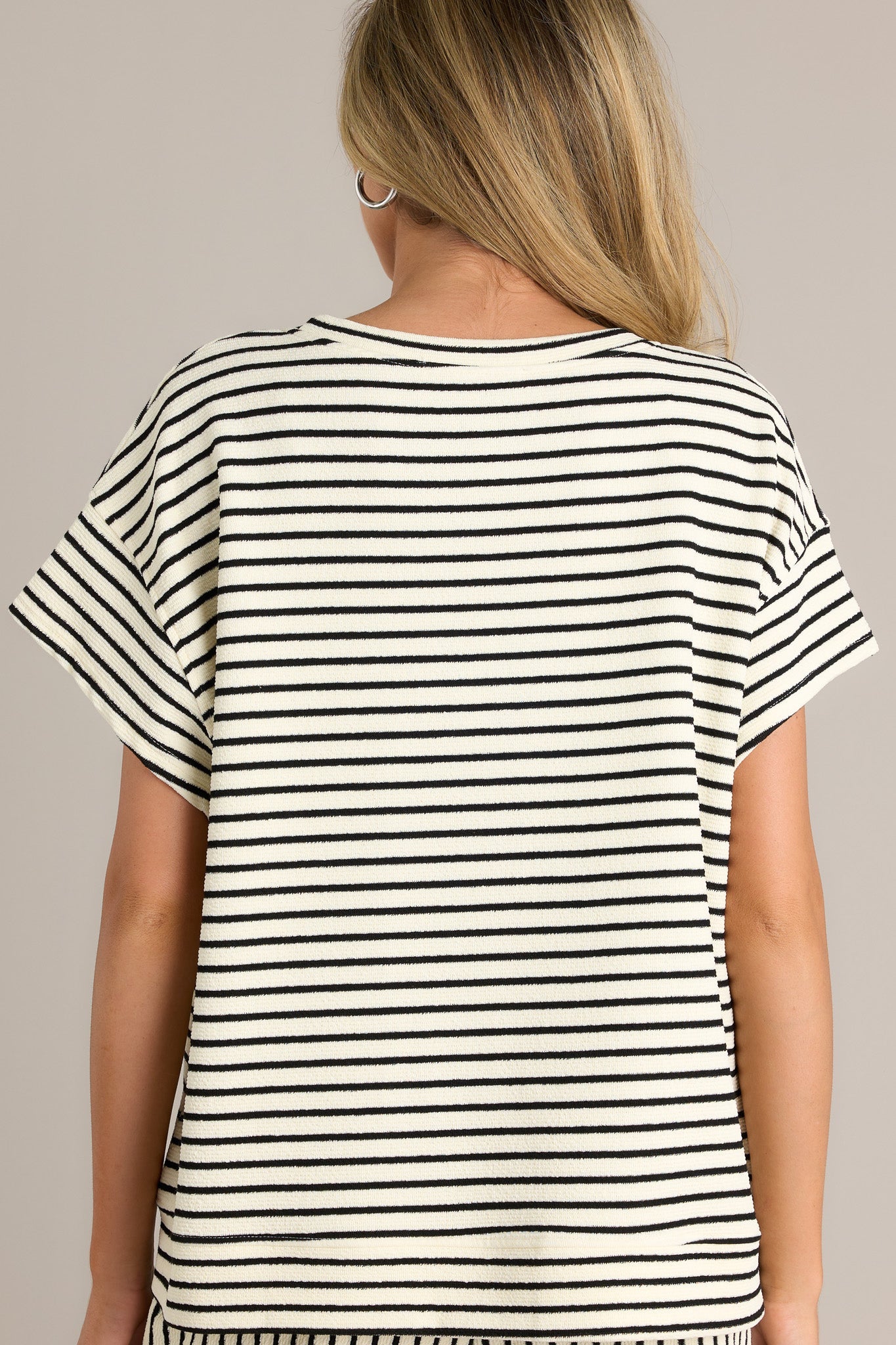 Experience pure bliss in our black stripe top! With a flattering fit and trendy stripe pattern, this top will have you feeling on top of the world. Perfect for any occasion, it's the perfect addition to your wardrobe. This black stripe top features a crew neckline, a thick textured material, a thick hemline, and short sleeves.
