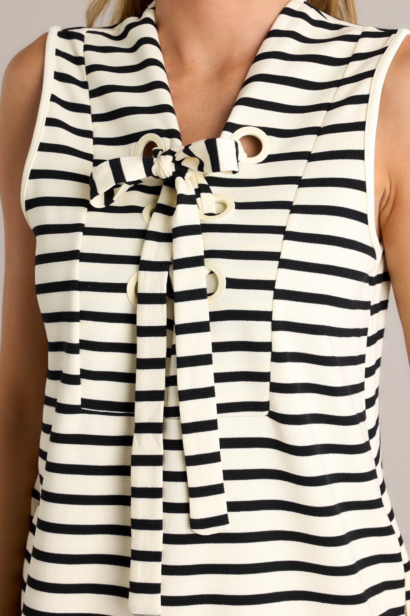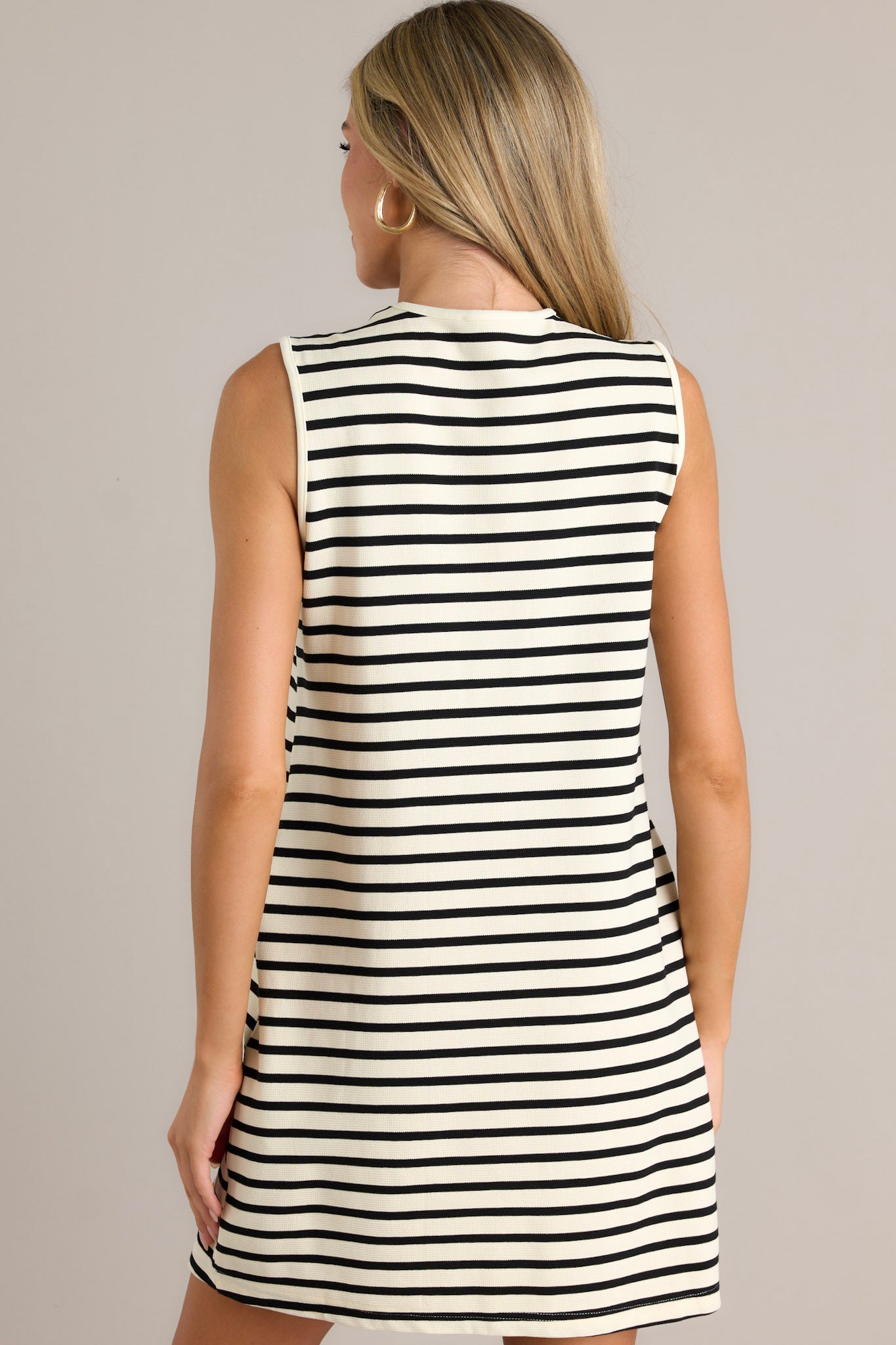 Take a stroll in style with the Blissful Strolls Black Sleeveless Mini Dress. This trendy dress features a flattering sleeveless design that will keep you cool and comfortable during those hot summer days. The ivory color adds a touch of sophistication while the mini length adds a fun and playful touch. Perfect for any occasion, this dress will have you looking and feeling your best! This black sleeveless mini dress features a v-neckline a cut out design on the chest, a self-tie waist belt, functional hip pockets, a horizontal stripe design and a sleeveless design.
