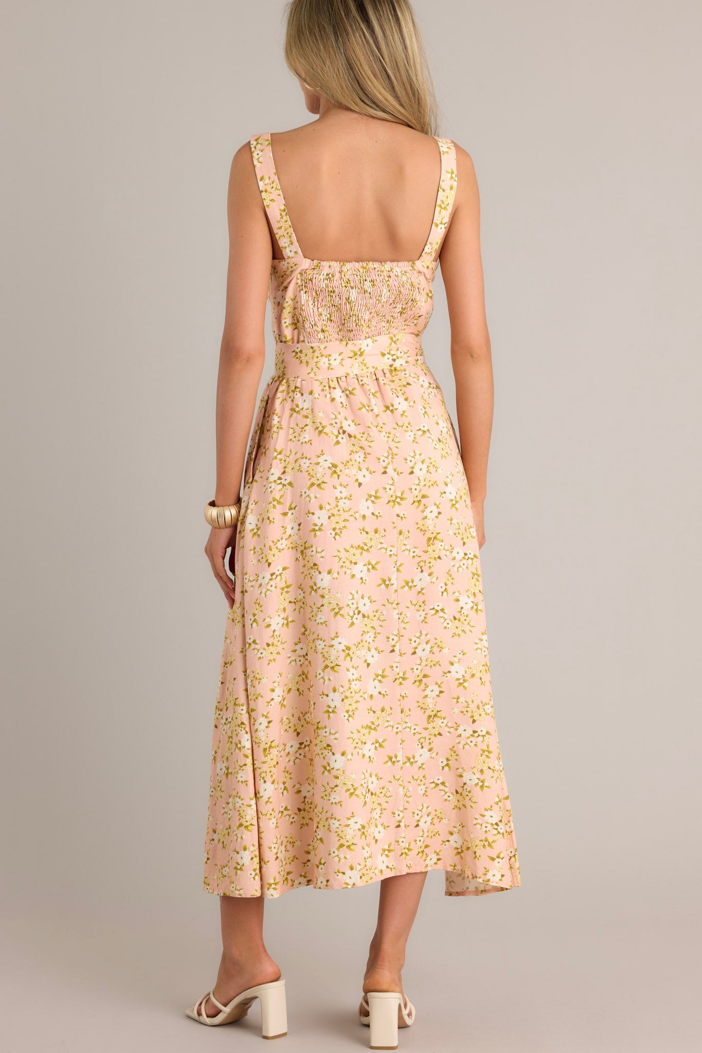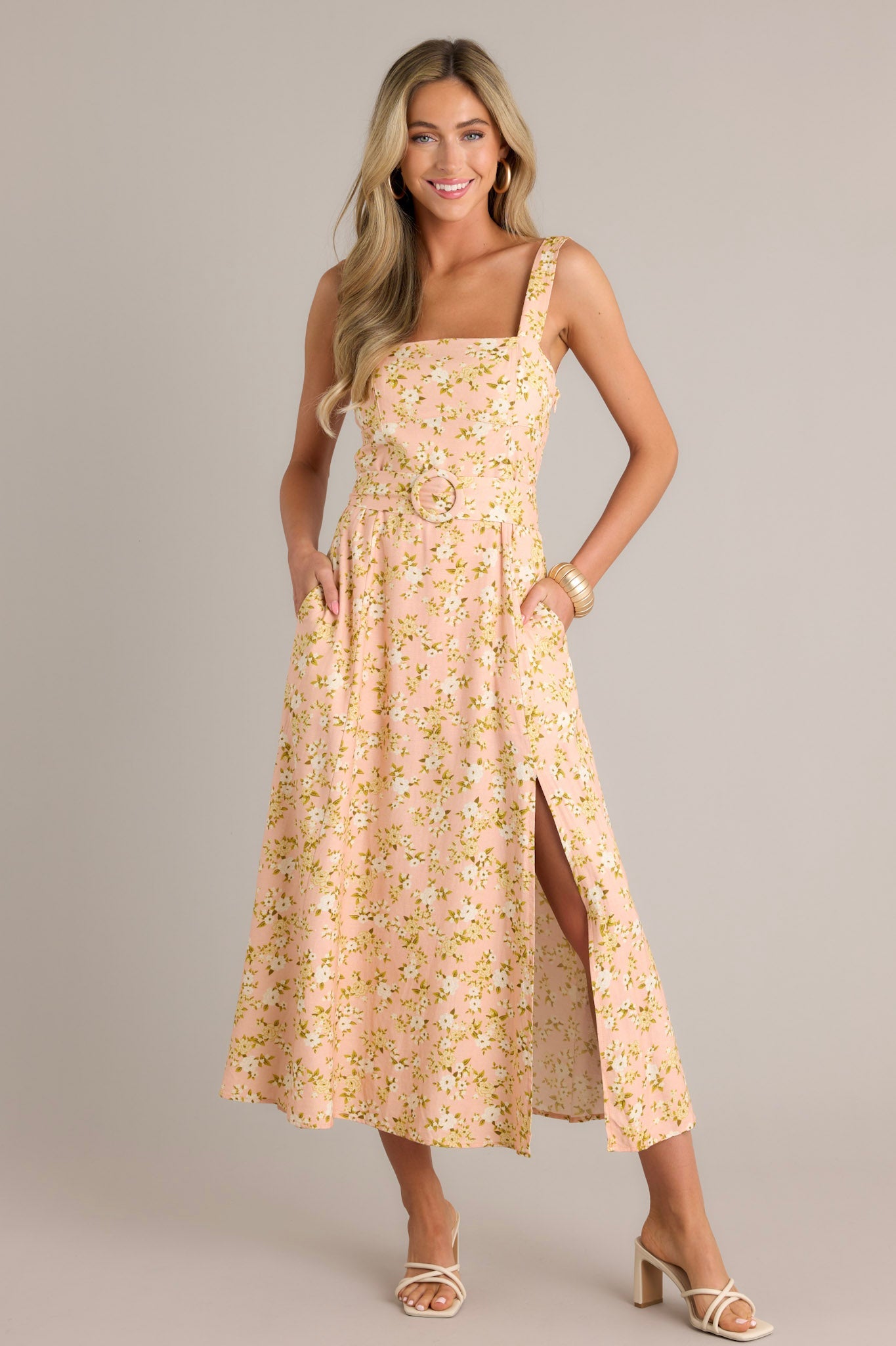 Get ready to bloom in style with our Blooming Grace Orange Peach Floral Maxi Dress! This playful dress features a stunning orange peach floral pattern that will make you stand out. With its maxi length, you'll stay comfortable and fashionable all day long. Perfect for any occasion, this dress will bring a touch of grace to your wardrobe. This peach maxi dress features a square neckline, thick adjustable straps, a smocked back insert, a discrete zipper, a functional pull-through waist belt, belt loops, functional hip pockets, and a front slit.