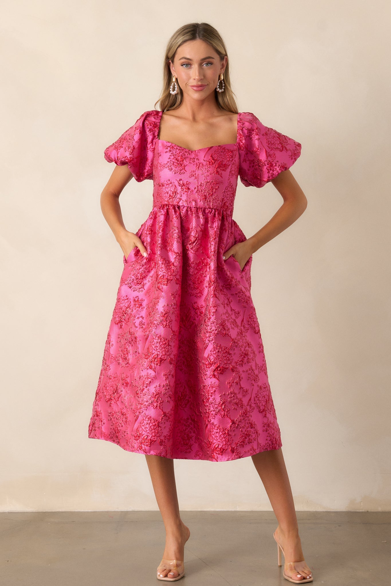 Elevate your style with our Blooming Hearts Pink Floral Jacquard Midi Dress. Crafted with a beautiful floral jacquard pattern, this dress exudes elegance and charm. The midi length offers a versatile and sophisticated look, perfect for any occasion. Feel confident and stunning in this must-have addition to your wardrobe. This pink midi dress features a sweetheart neckline, fit and flare design, smocked back, discrete back zipper, sparkle red detailing throughout, and puff sleeves.