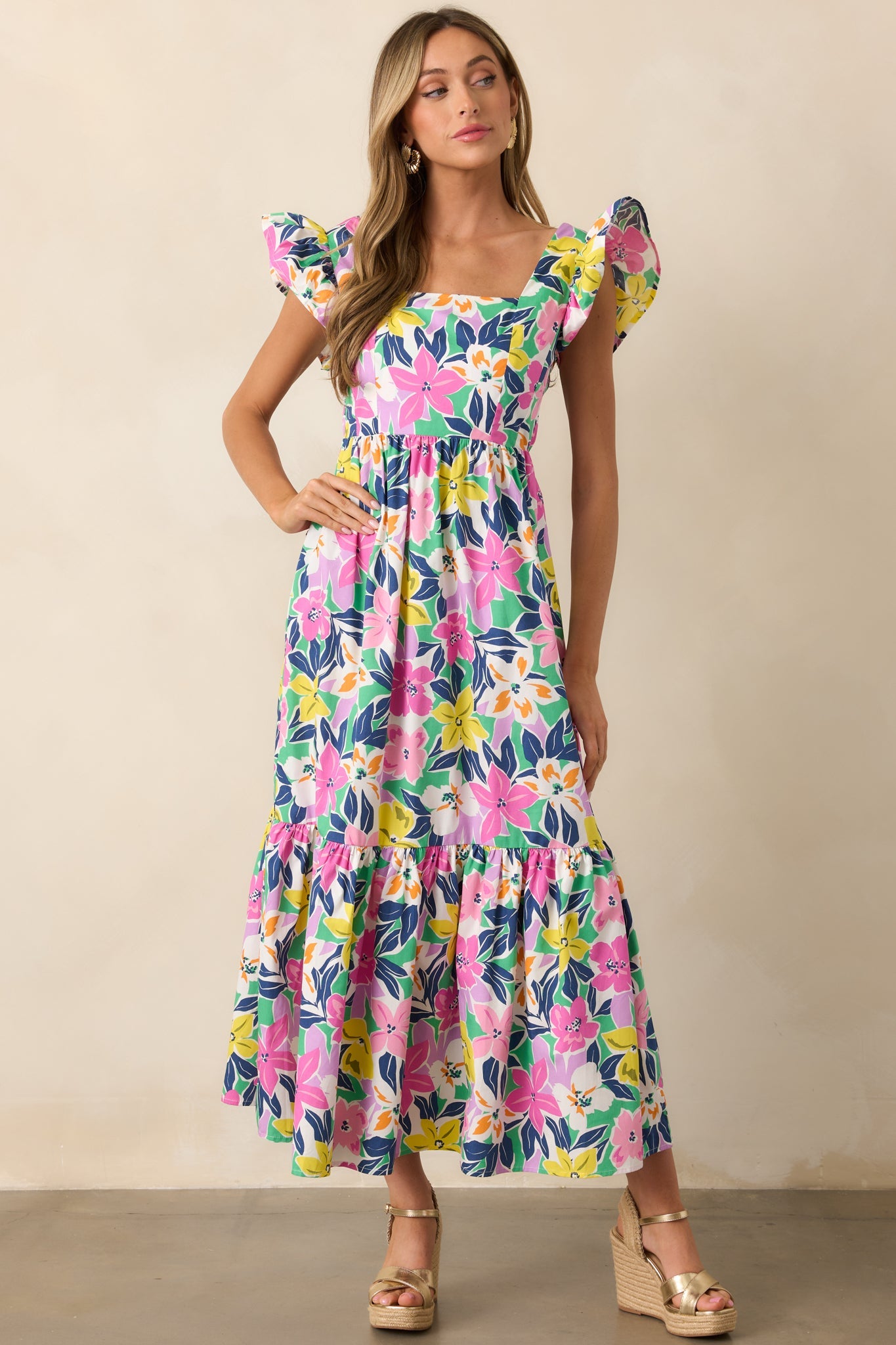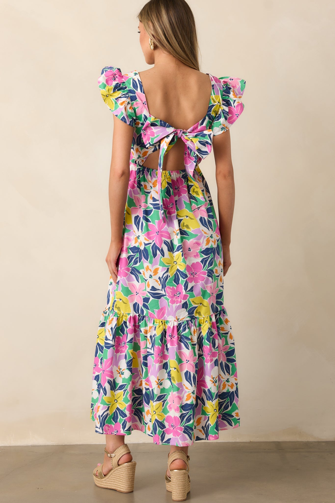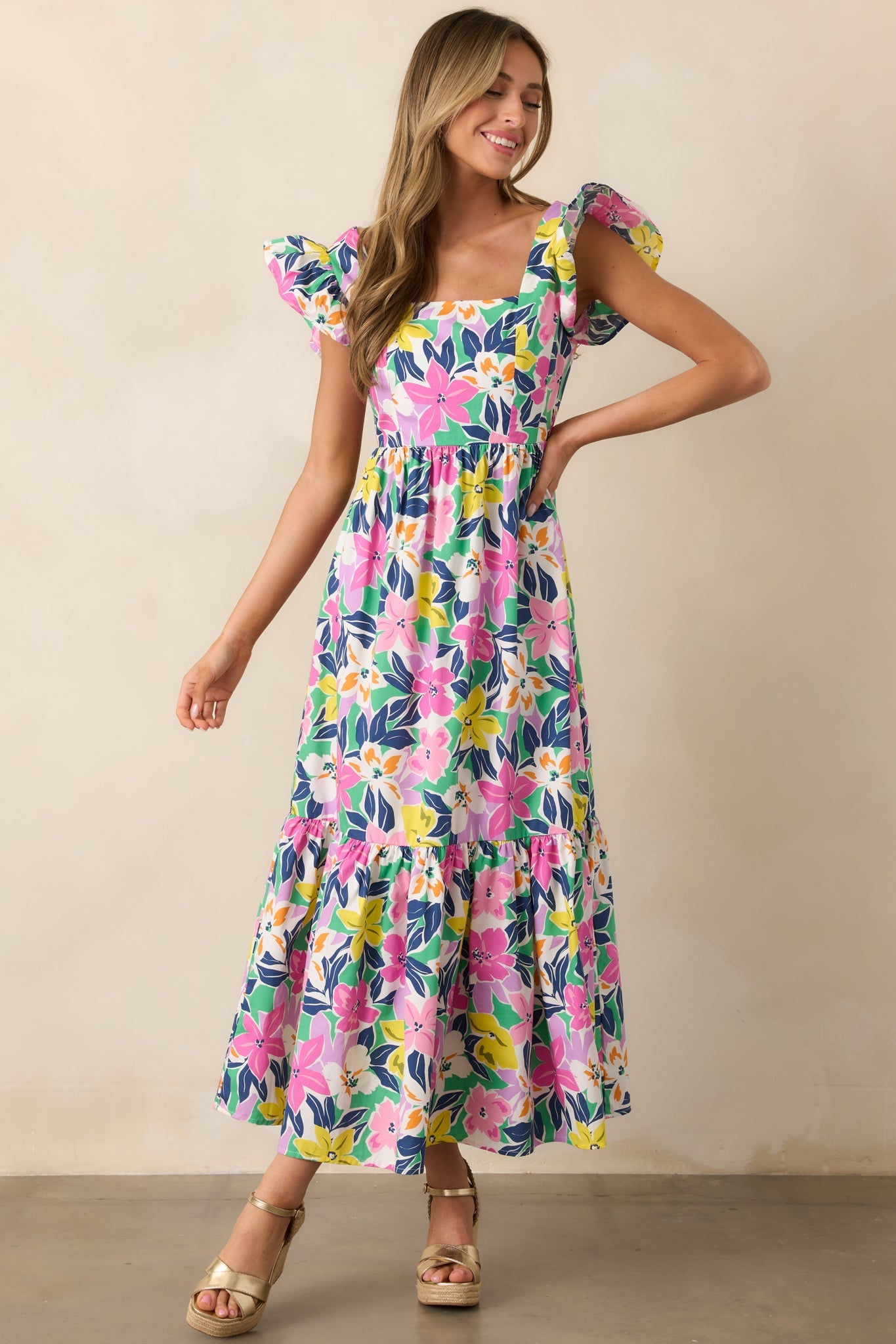 Embrace the beauty of the tropics in our Blooming Shores Pink Tropical Floral Flutter Sleeve Maxi Dress. This stunning dress features delicate flutter sleeves and a colorful floral print, perfect for any summer occasion. Enjoy the lightweight and flowy fabric for all-day comfort and style. This pink maxi dress features a straight neckline, self-tie back, elastic waistband, relaxed skirt, tropical floral print, and flutter sleeves.