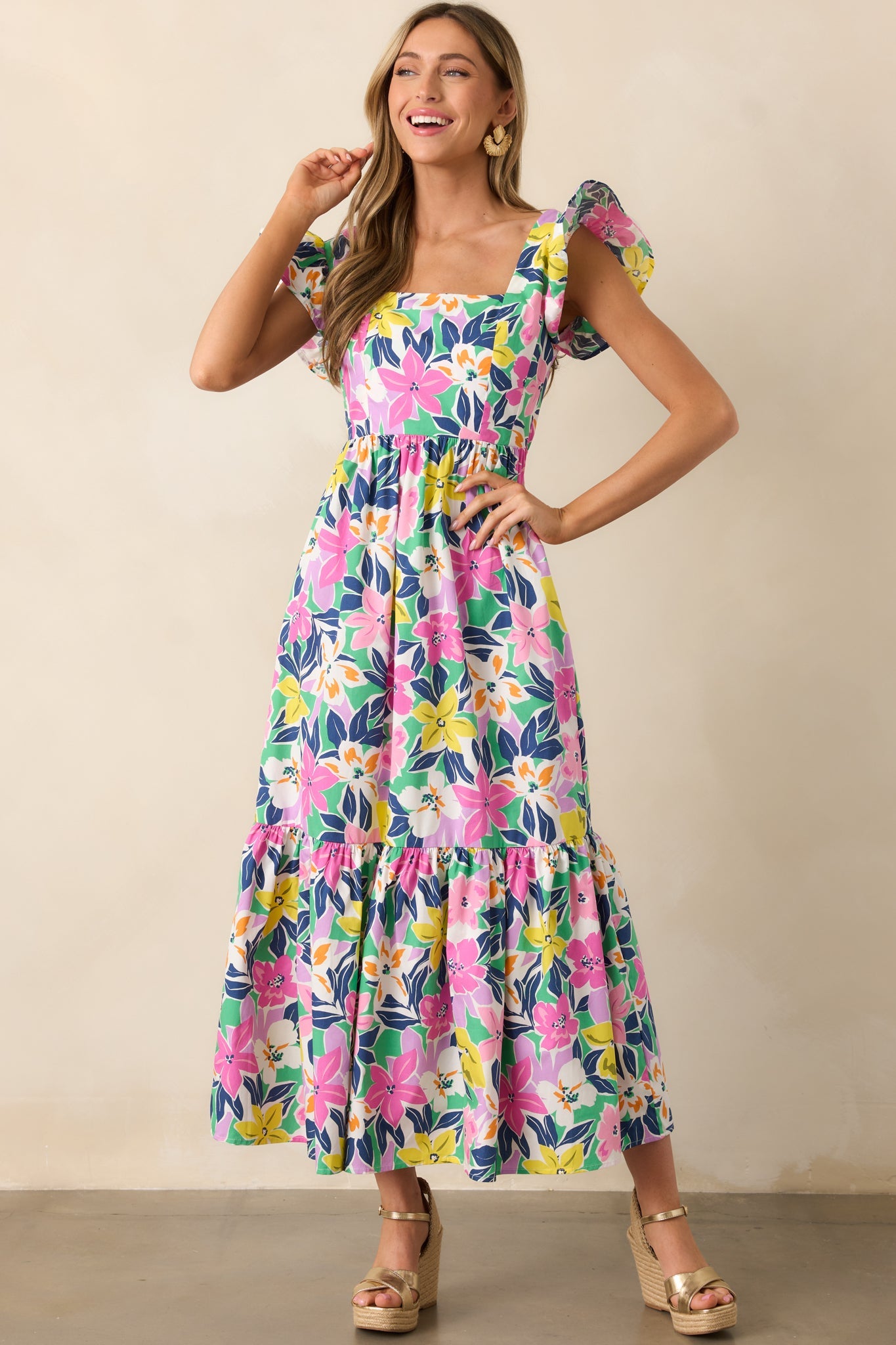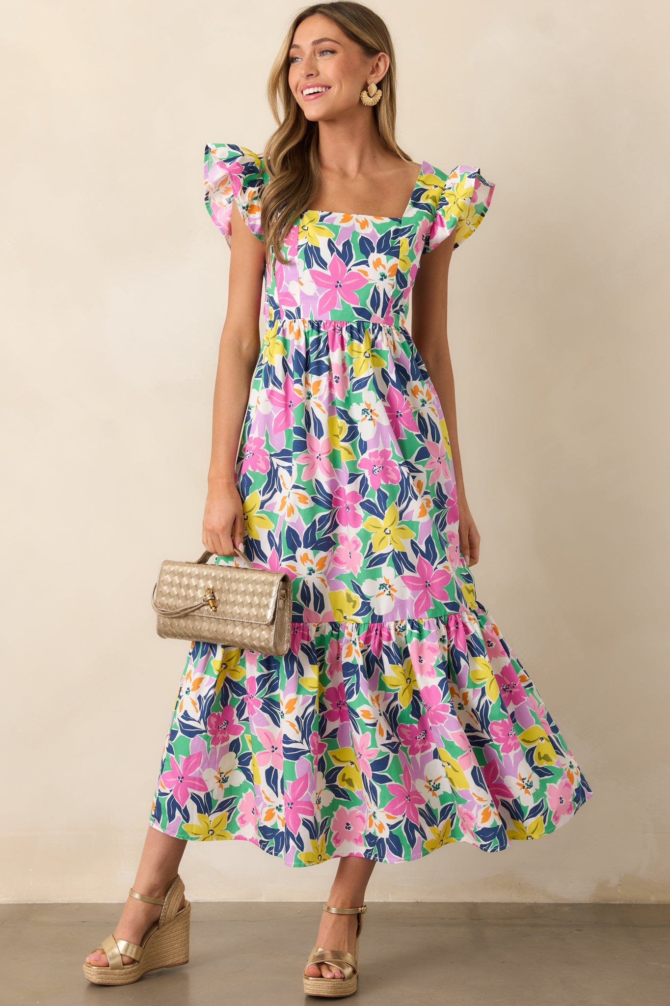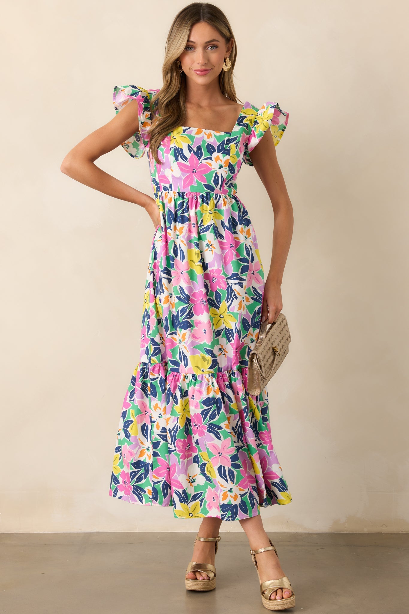 Embrace the beauty of the tropics in our Blooming Shores Pink Tropical Floral Flutter Sleeve Maxi Dress. This stunning dress features delicate flutter sleeves and a colorful floral print, perfect for any summer occasion. Enjoy the lightweight and flowy fabric for all-day comfort and style. This pink maxi dress features a straight neckline, self-tie back, elastic waistband, relaxed skirt, tropical floral print, and flutter sleeves.